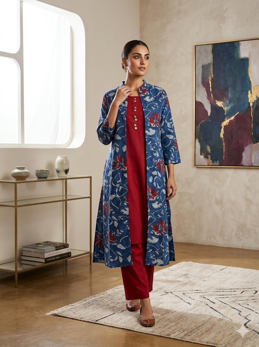 The outfit is completed with a comfort-fit cotton palazzo, providing both style and ease of movement. The layered design adds a modern twist to traditional wear, making it perfect for casual gatherings, festive occasions, and stylish day outings.