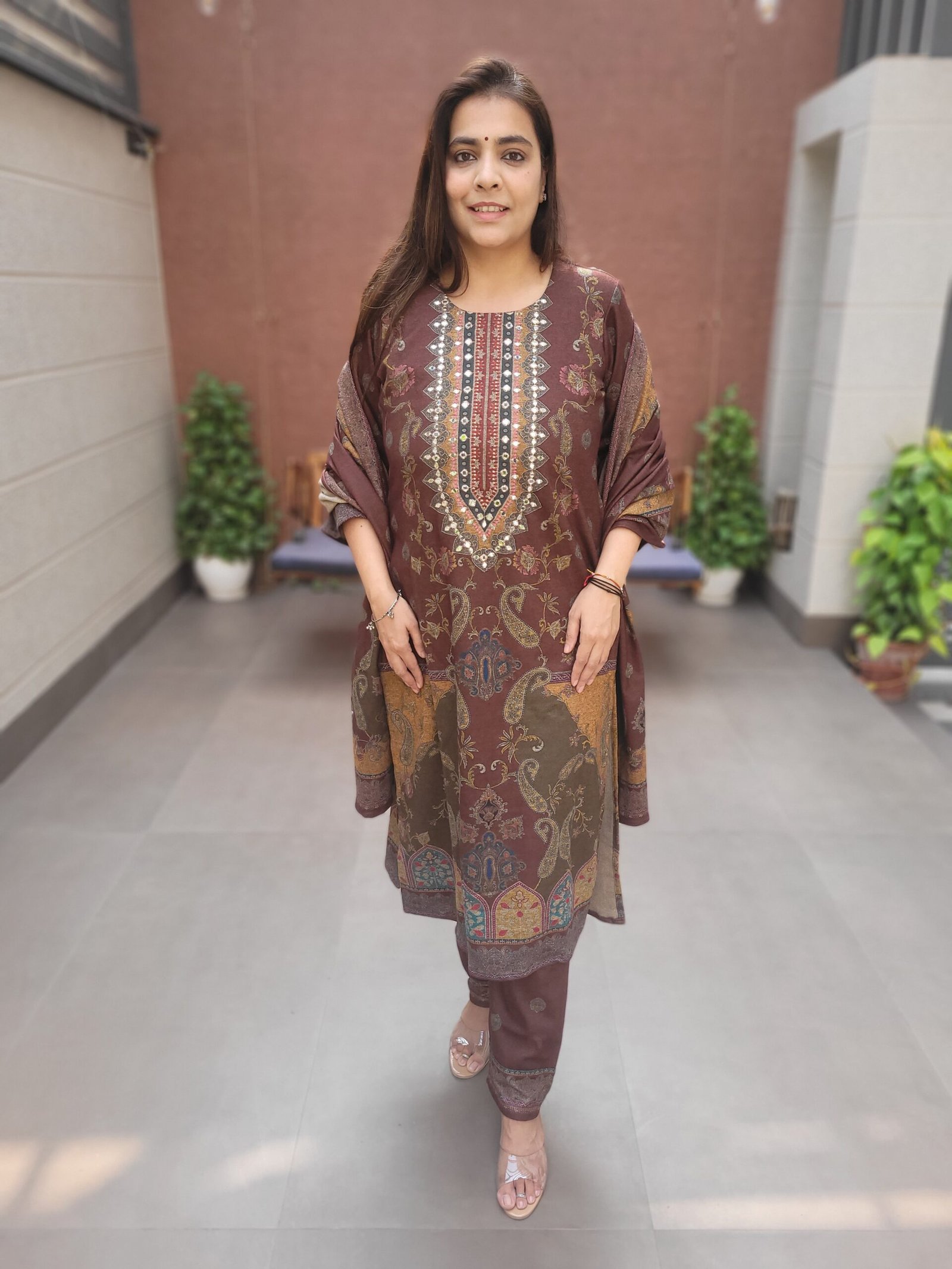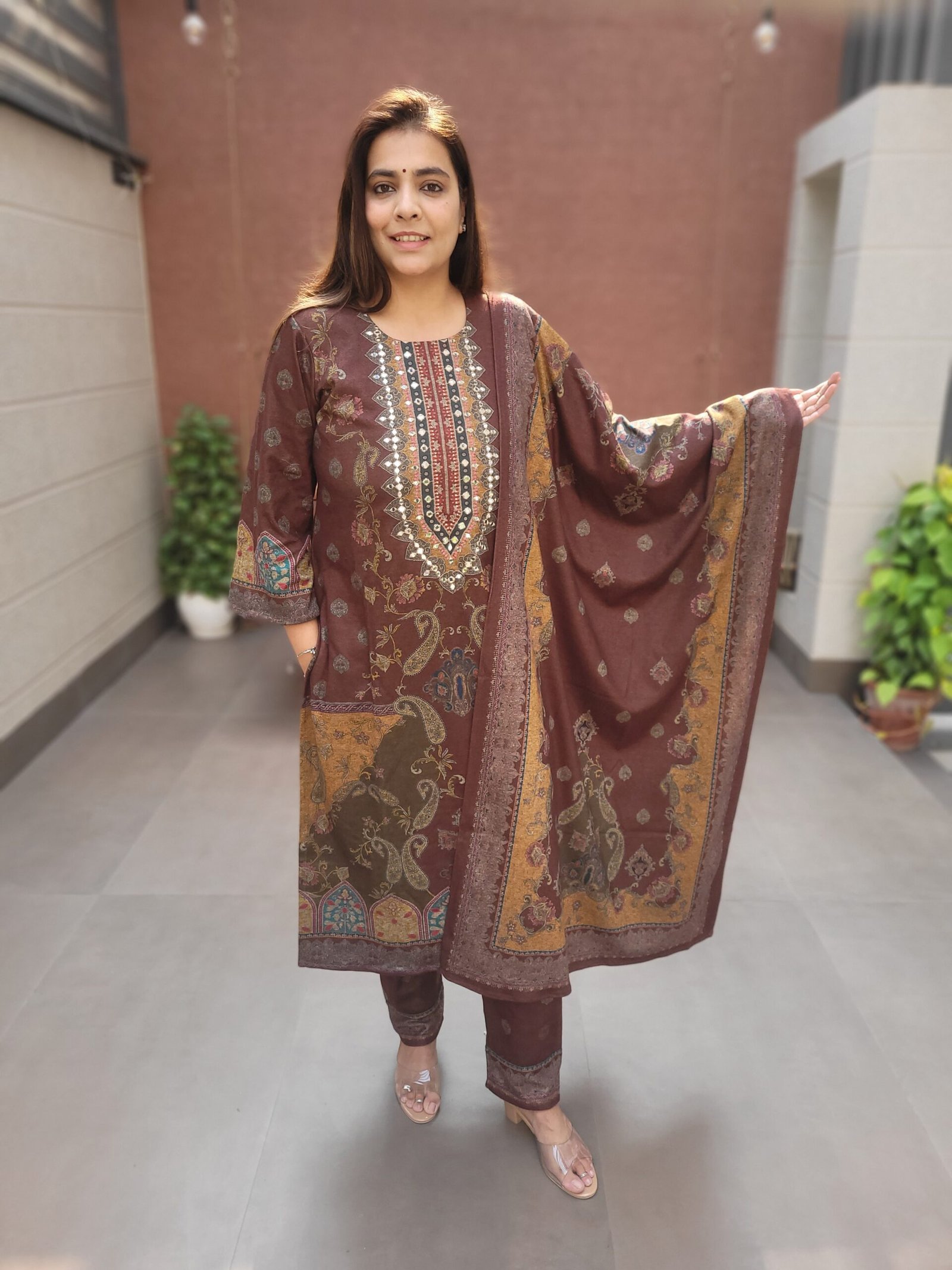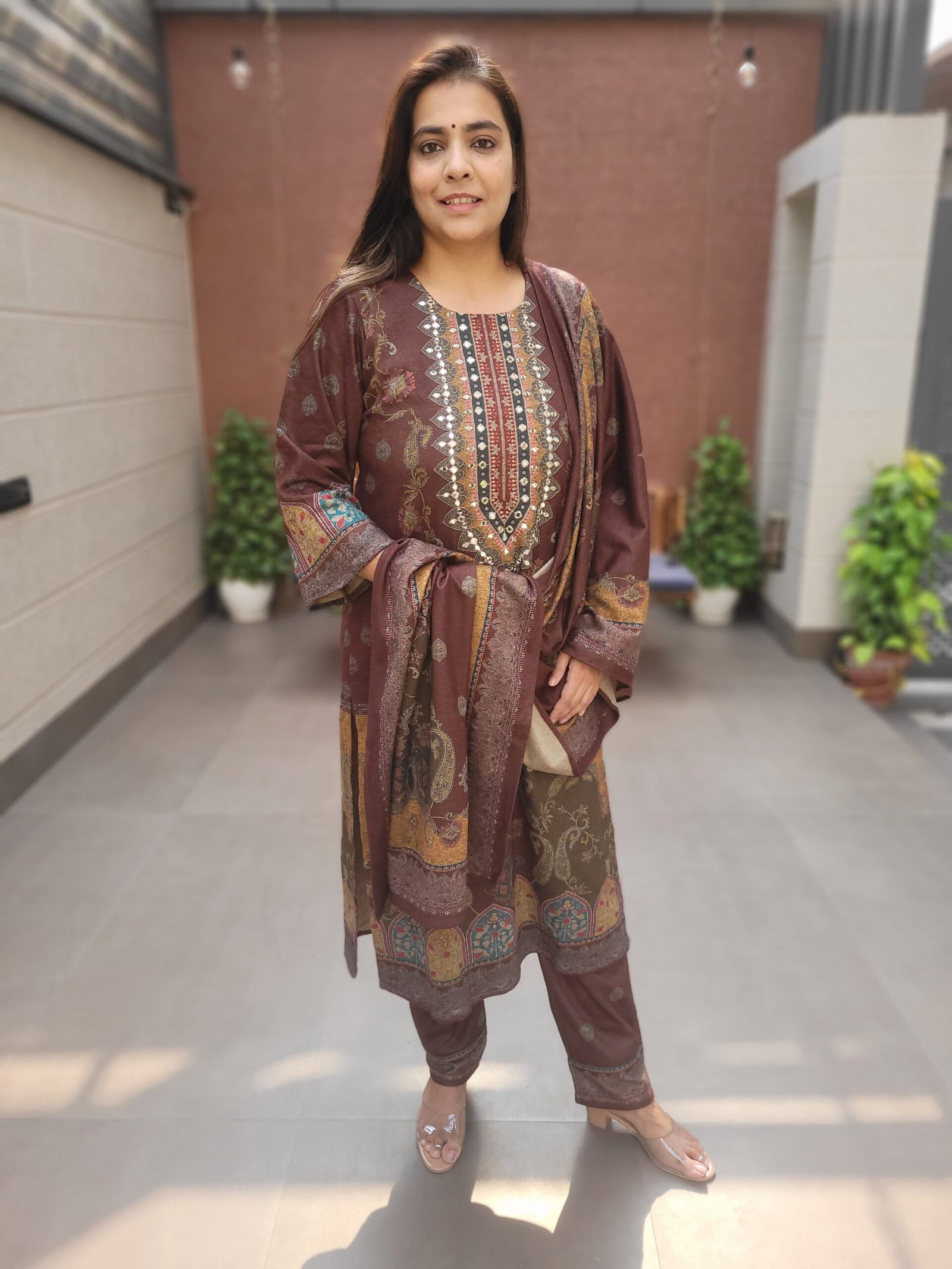 Paired with a beautifully crafted digital printed dupatta, this set strikes a balance between tradition and modern style. Soft, stretchable, and extremely comfortable, it is ideal for parties, weddings, evening events, and winter festive wear.