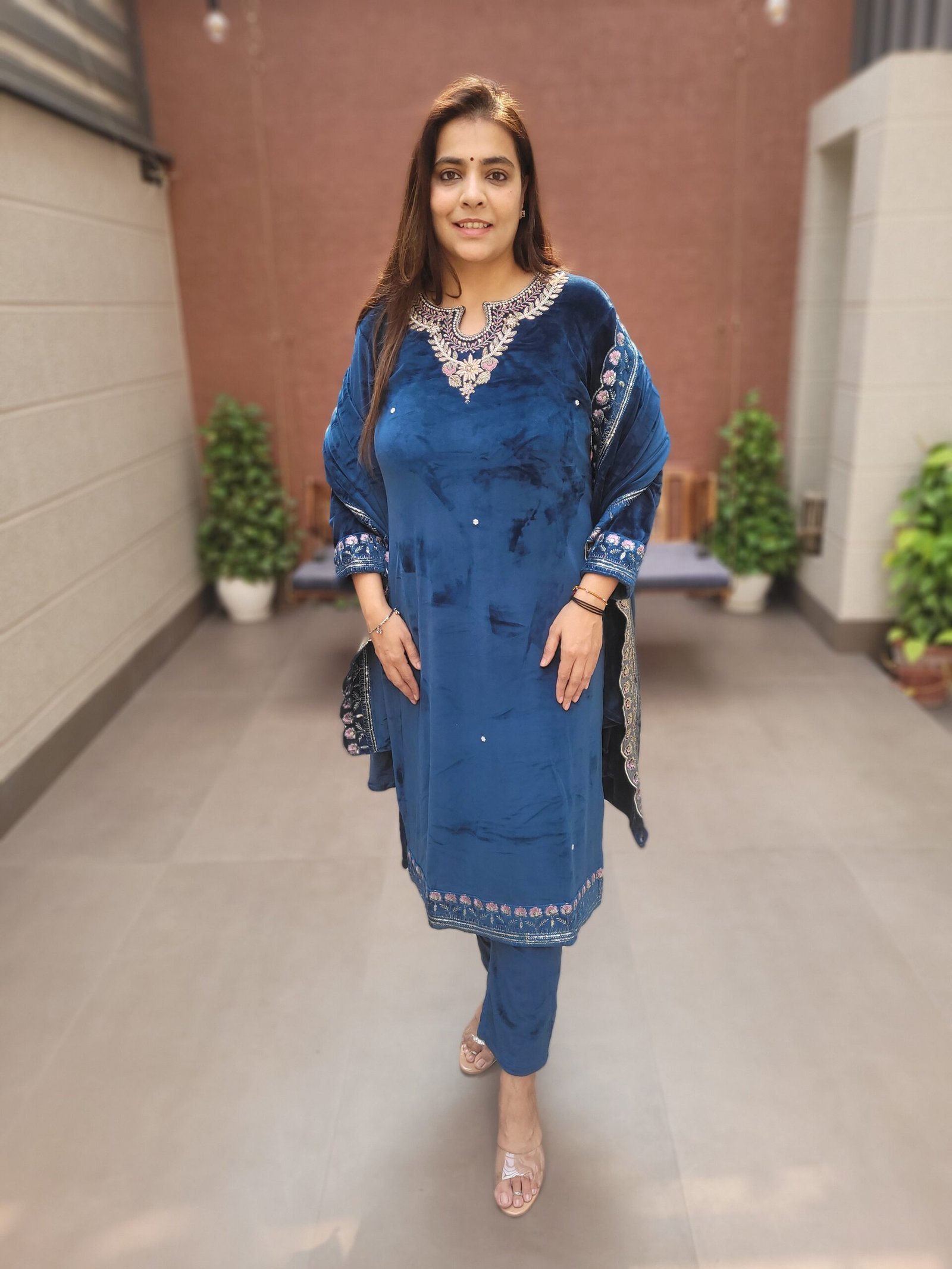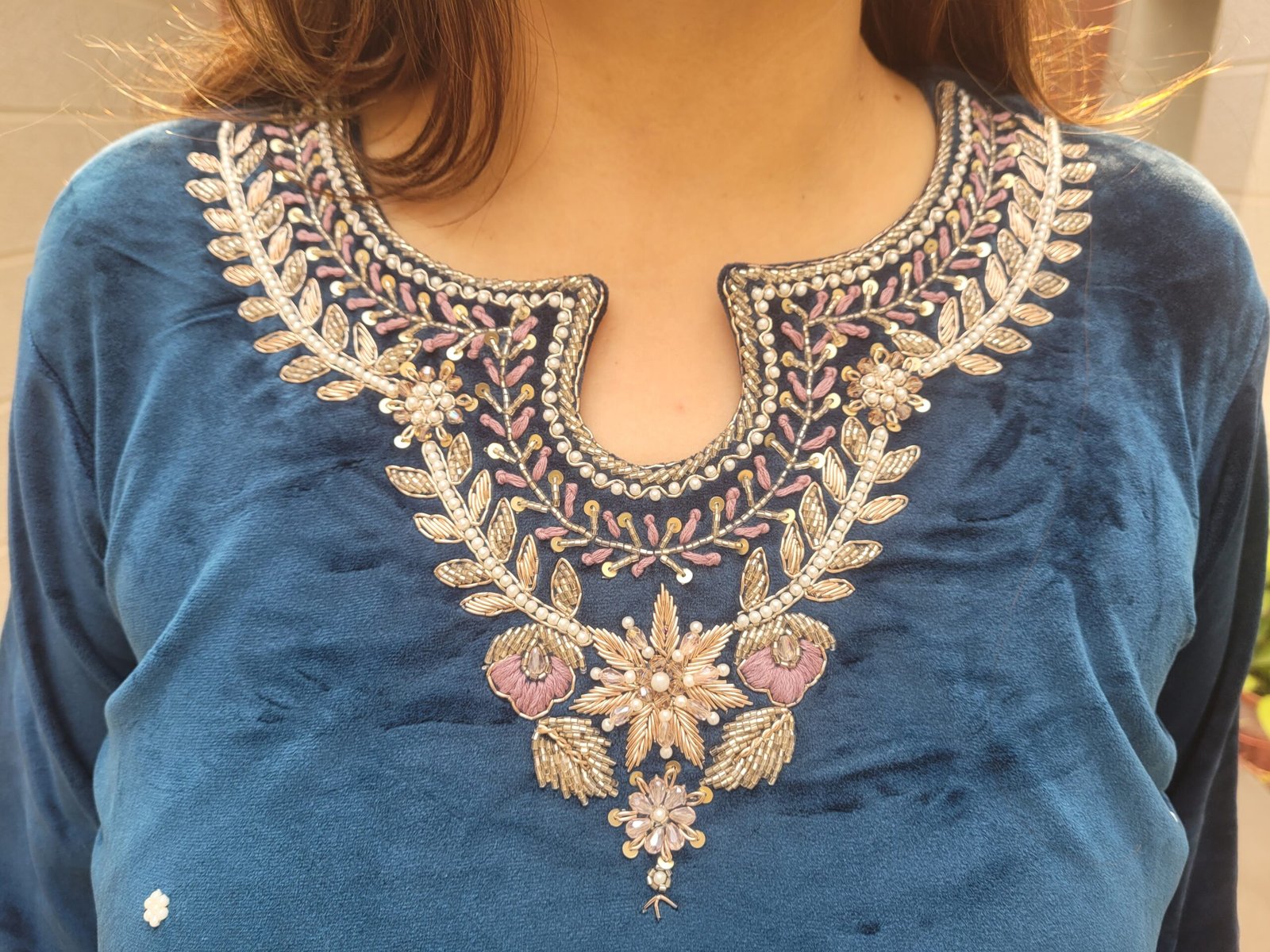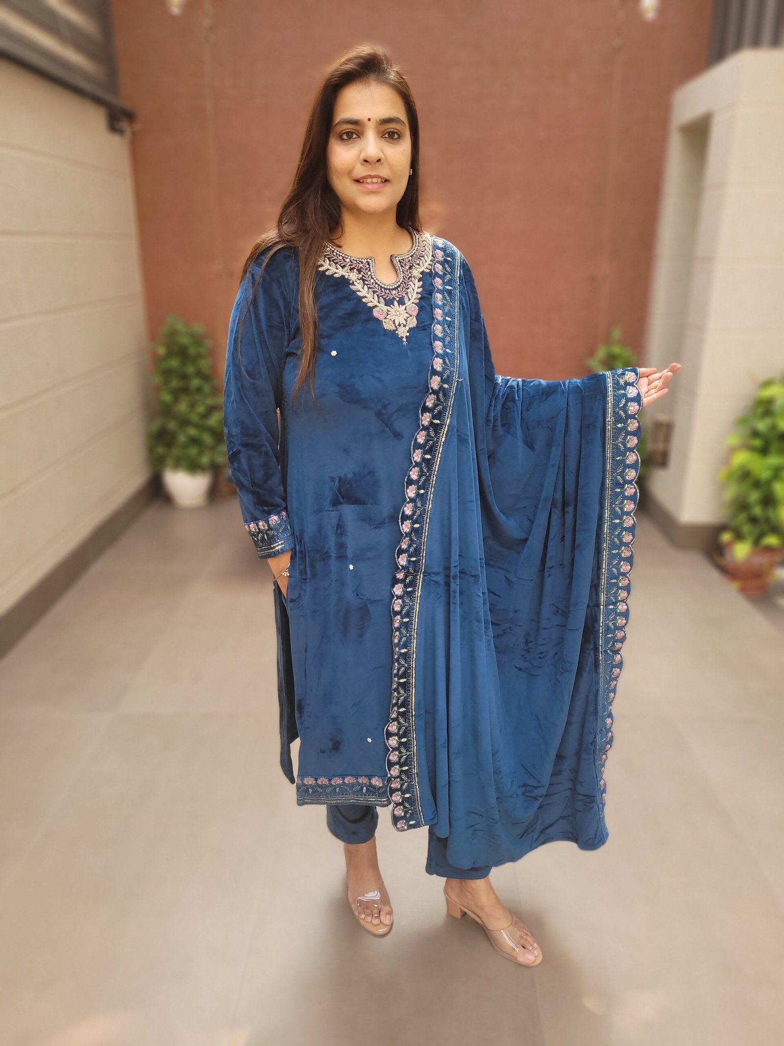 Care Instructions: Dry clean recommended to maintain velvet texture and handwork detailing.