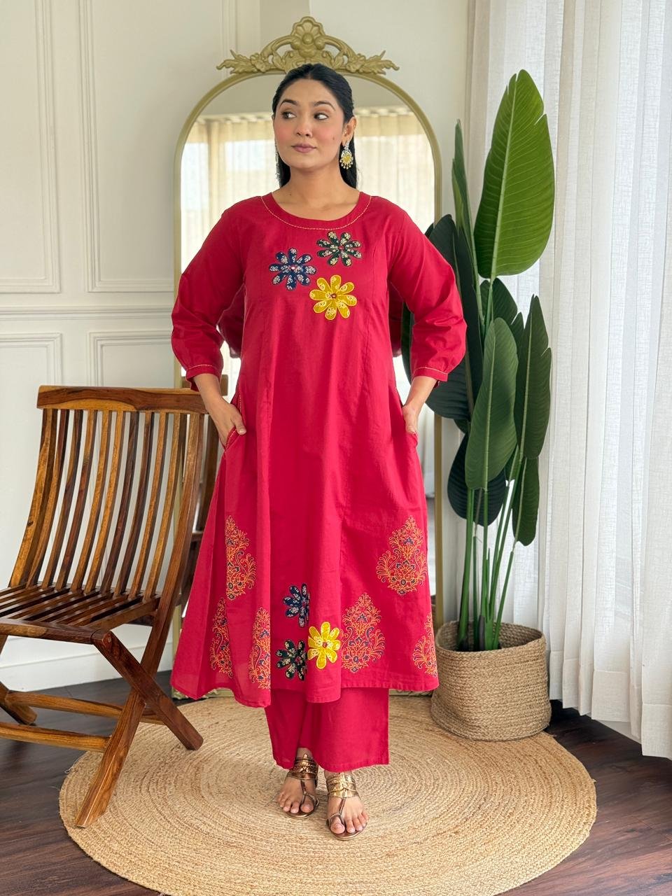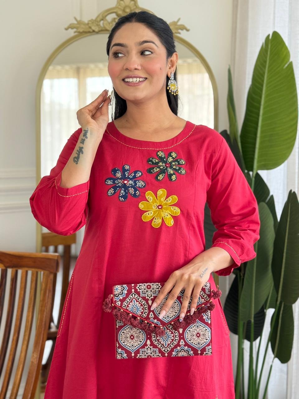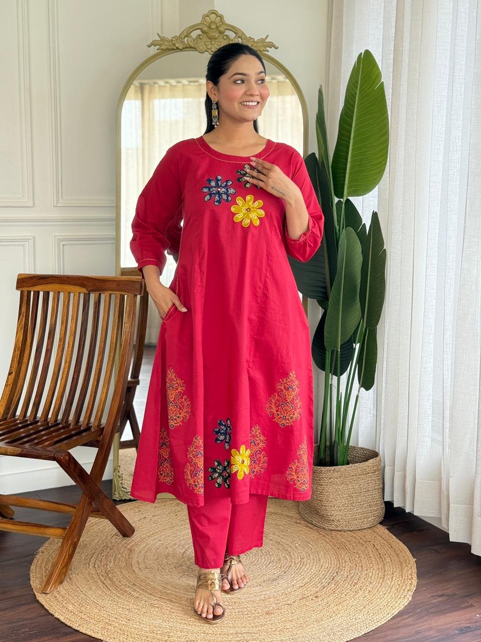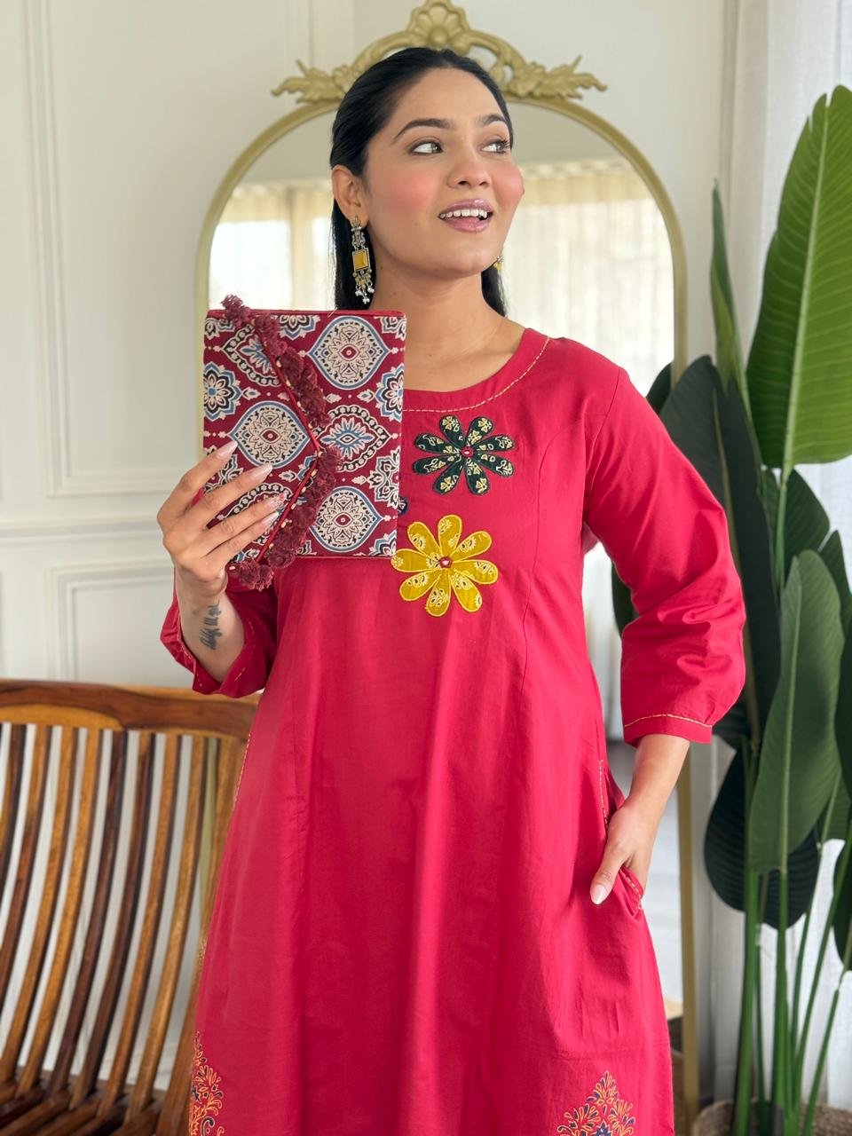 The kurta features Ajrakh applique work, handblock prints, and double pockets, making it stylish and functional. Ideal for daily wear, office use, and ethnic casual outings.