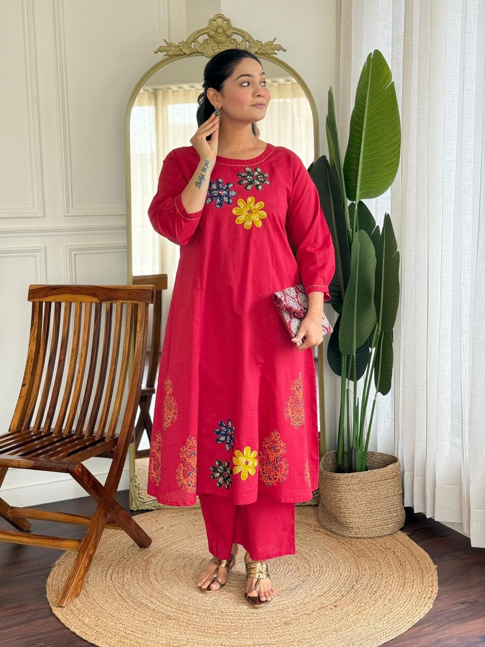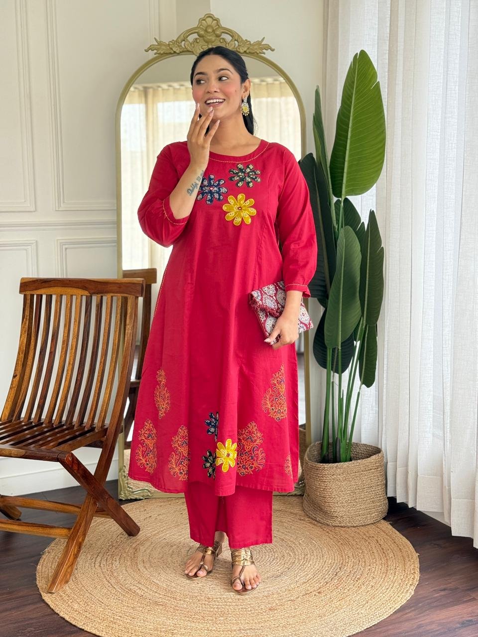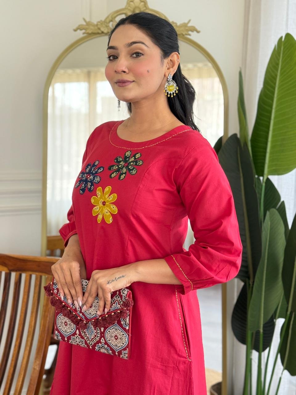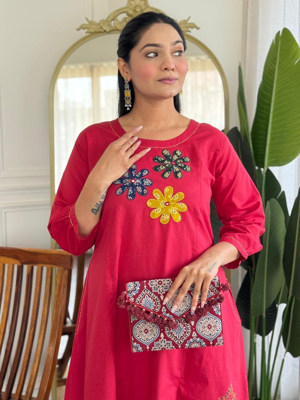 The kurta features Ajrakh applique work, handblock prints, and double pockets, making it stylish and functional. Ideal for daily wear, office use, and ethnic casual outings.