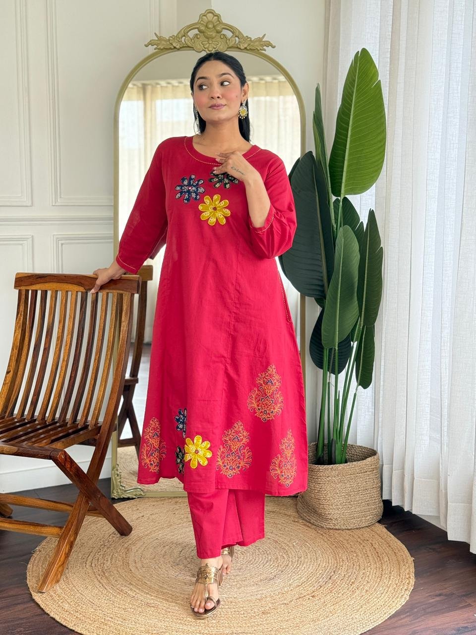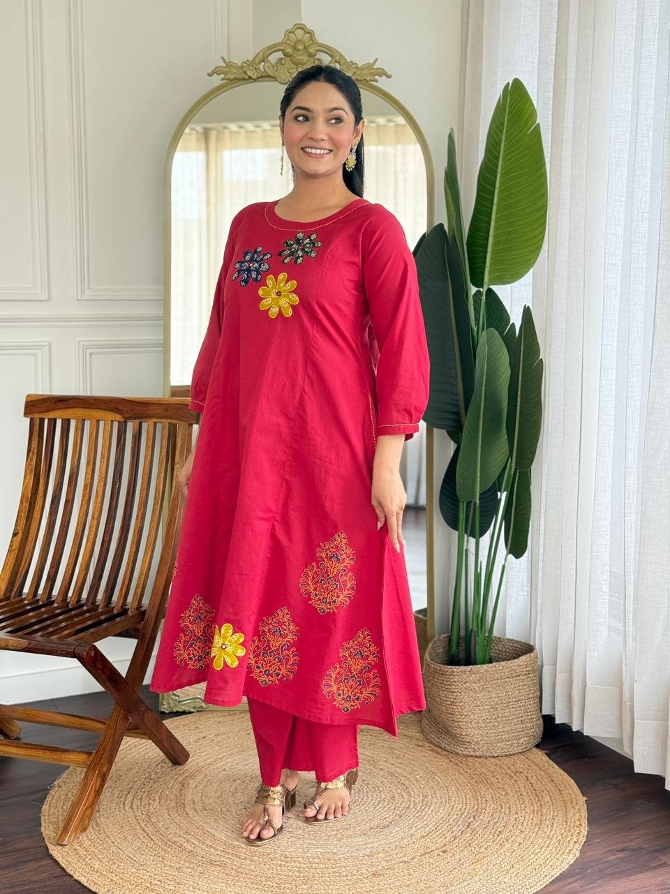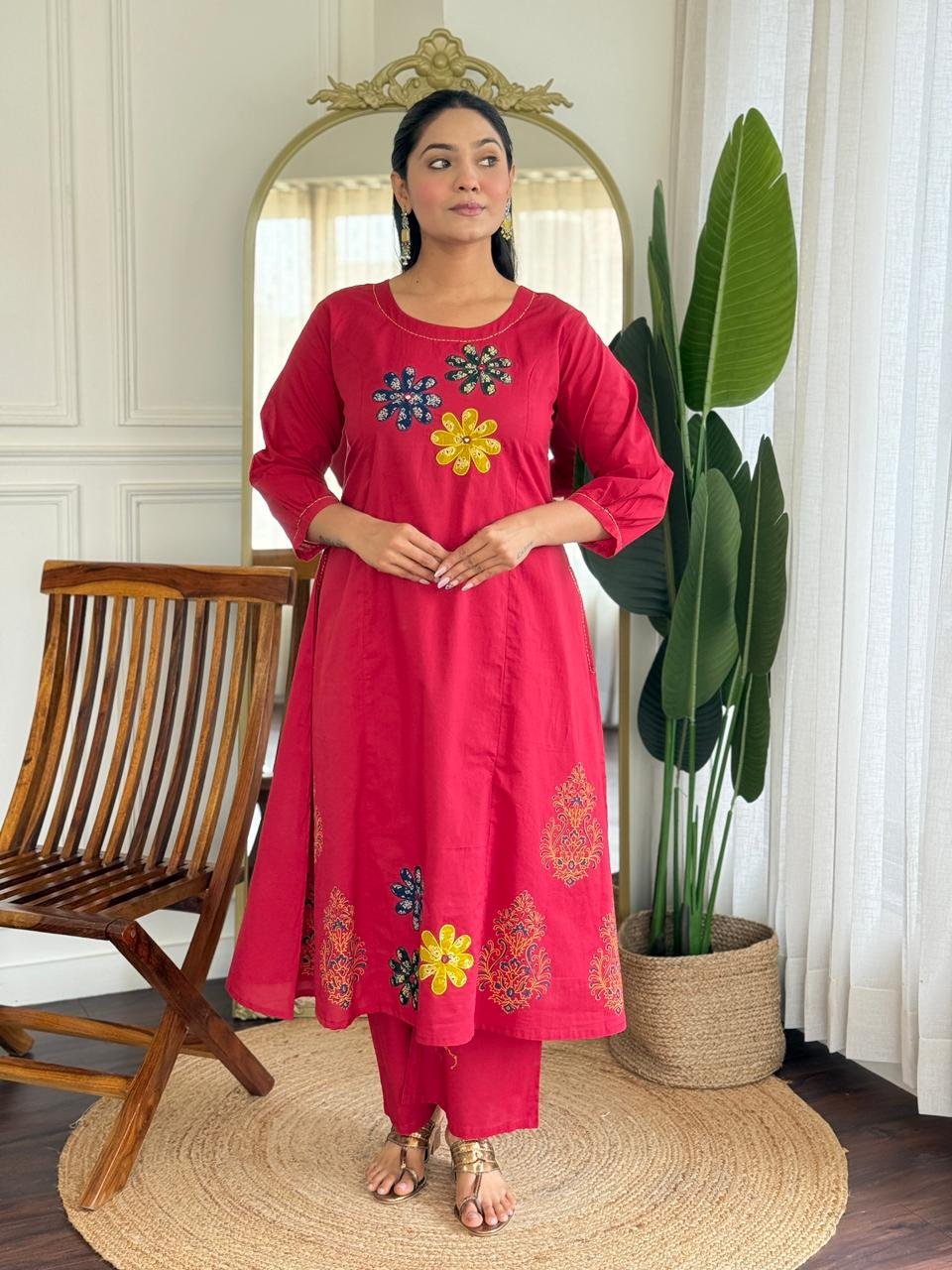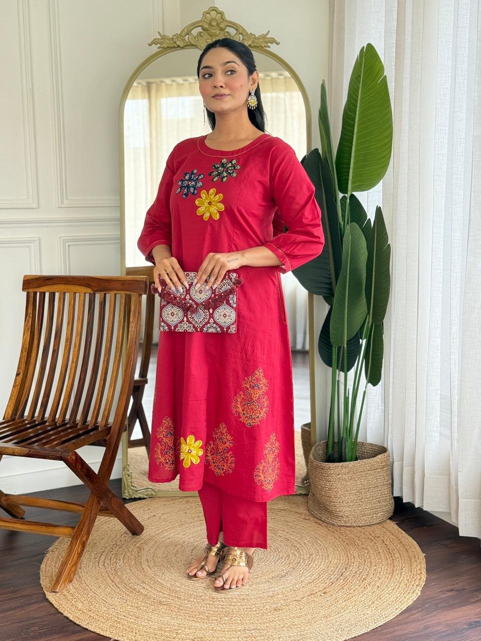 The kurta features Ajrakh applique work, handblock prints, and double pockets, making it stylish and functional. Ideal for daily wear, office use, and ethnic casual outings.