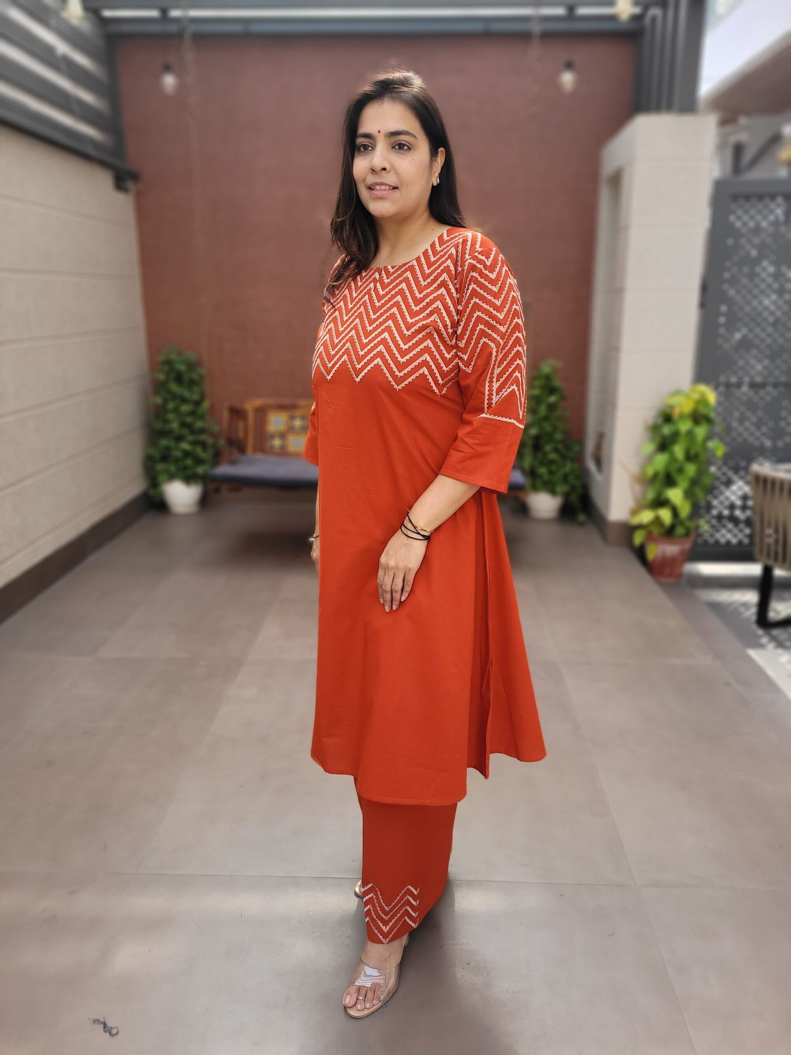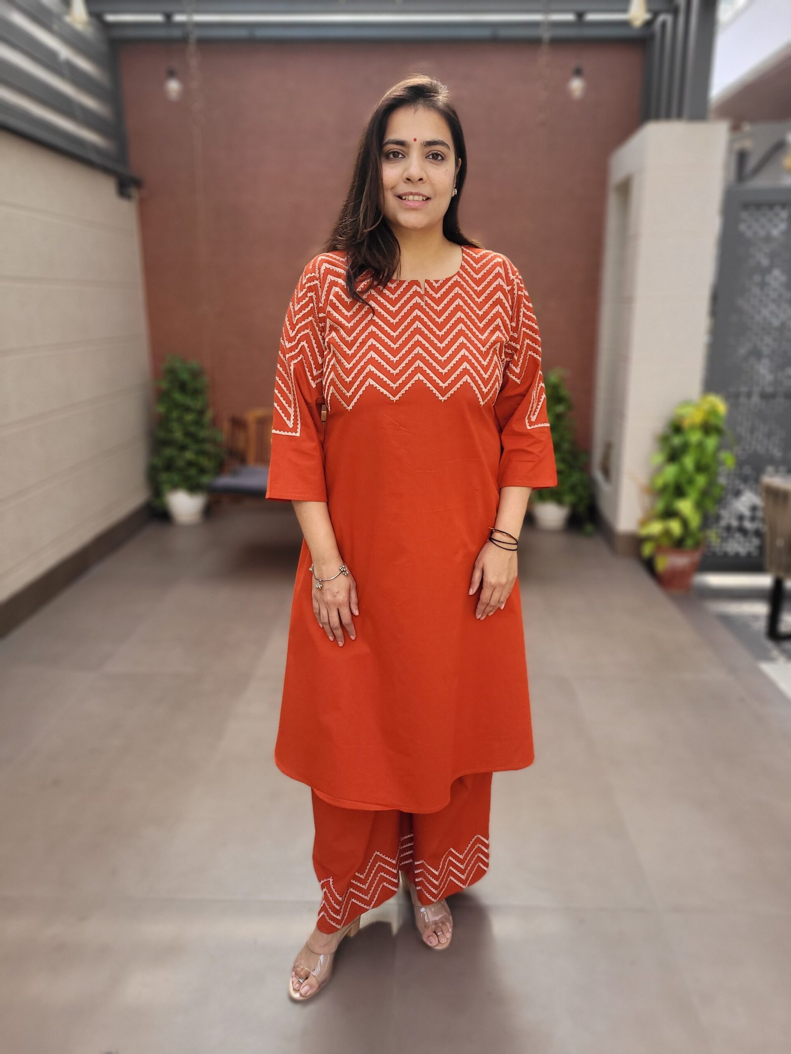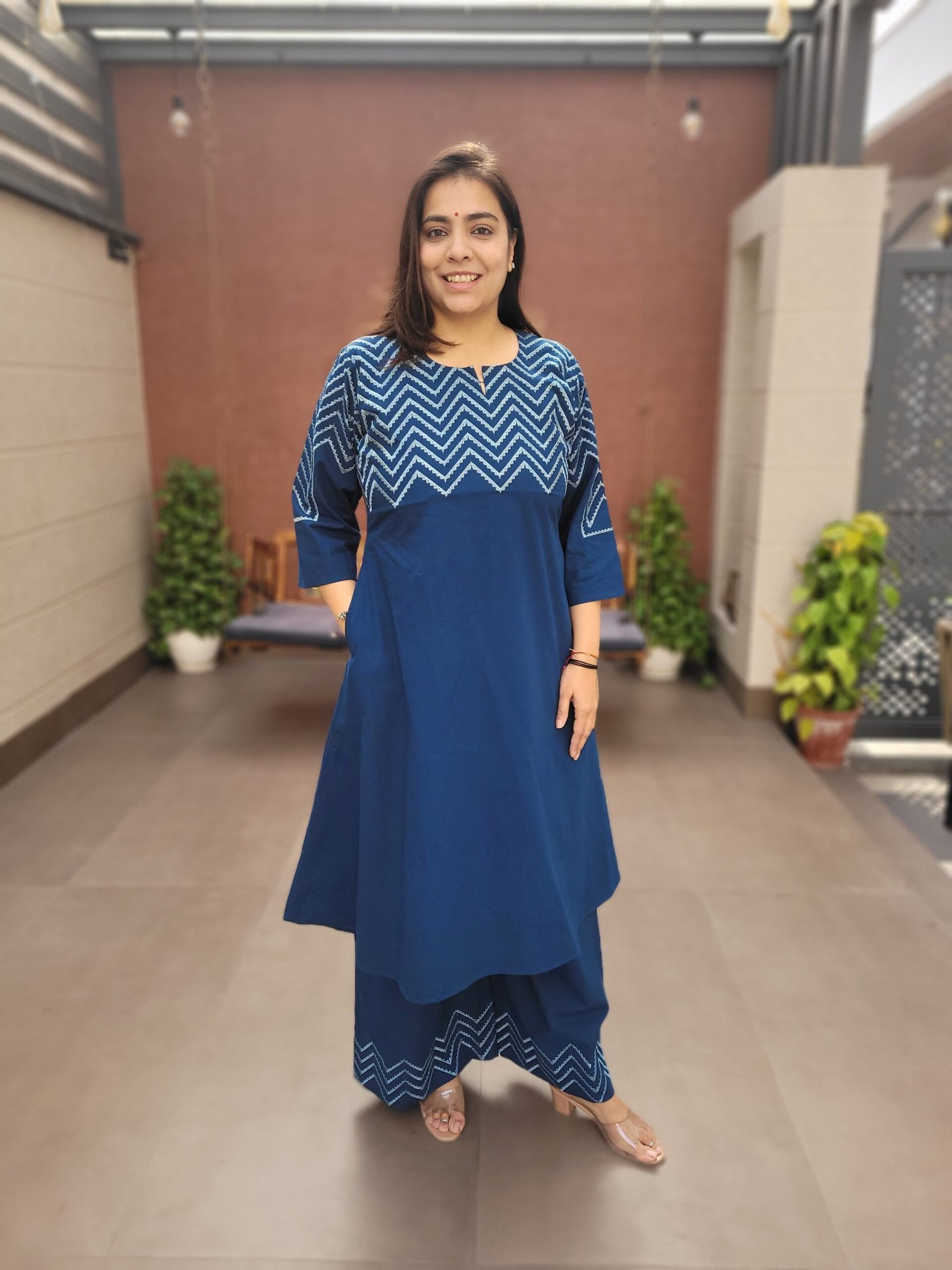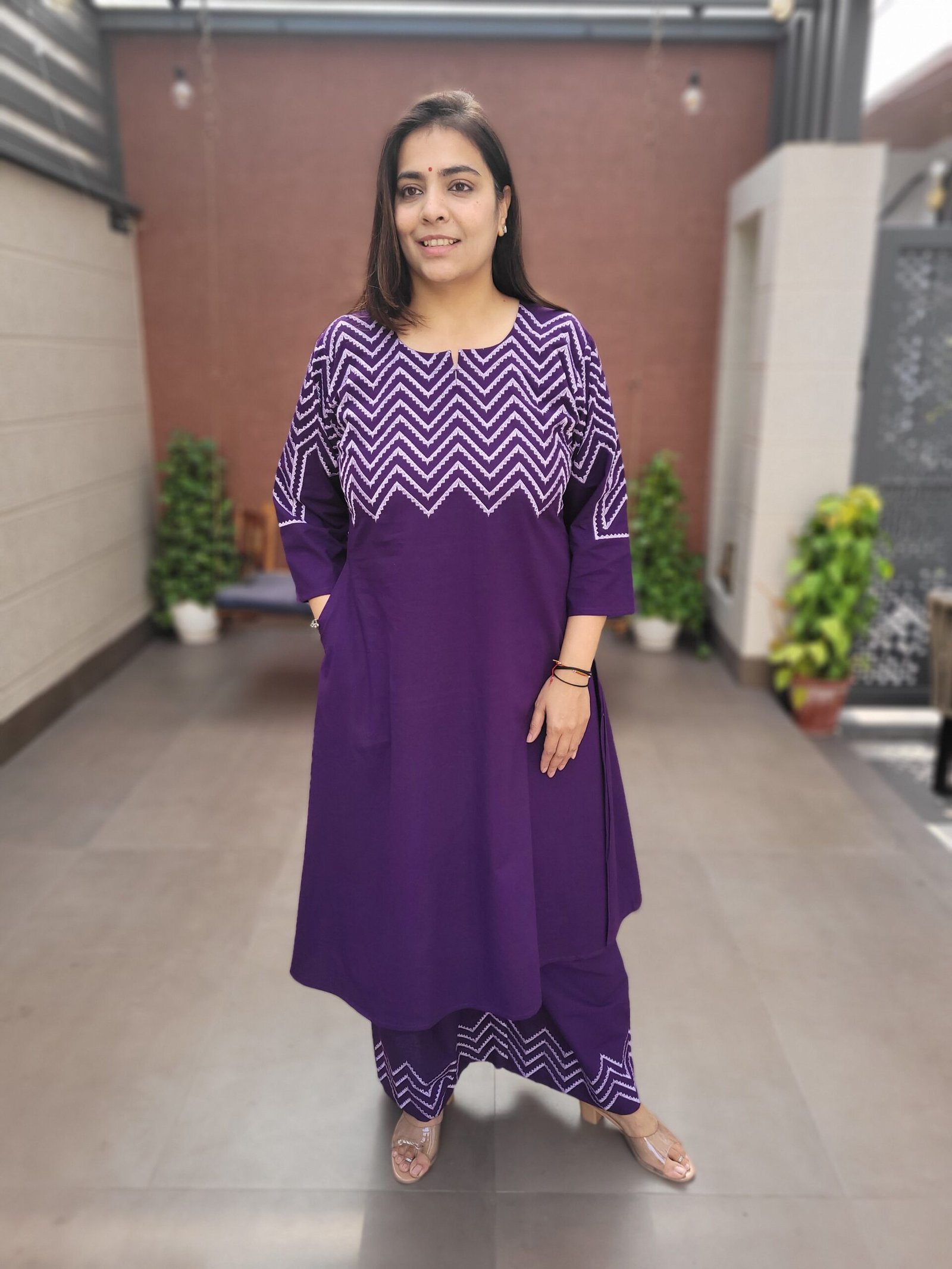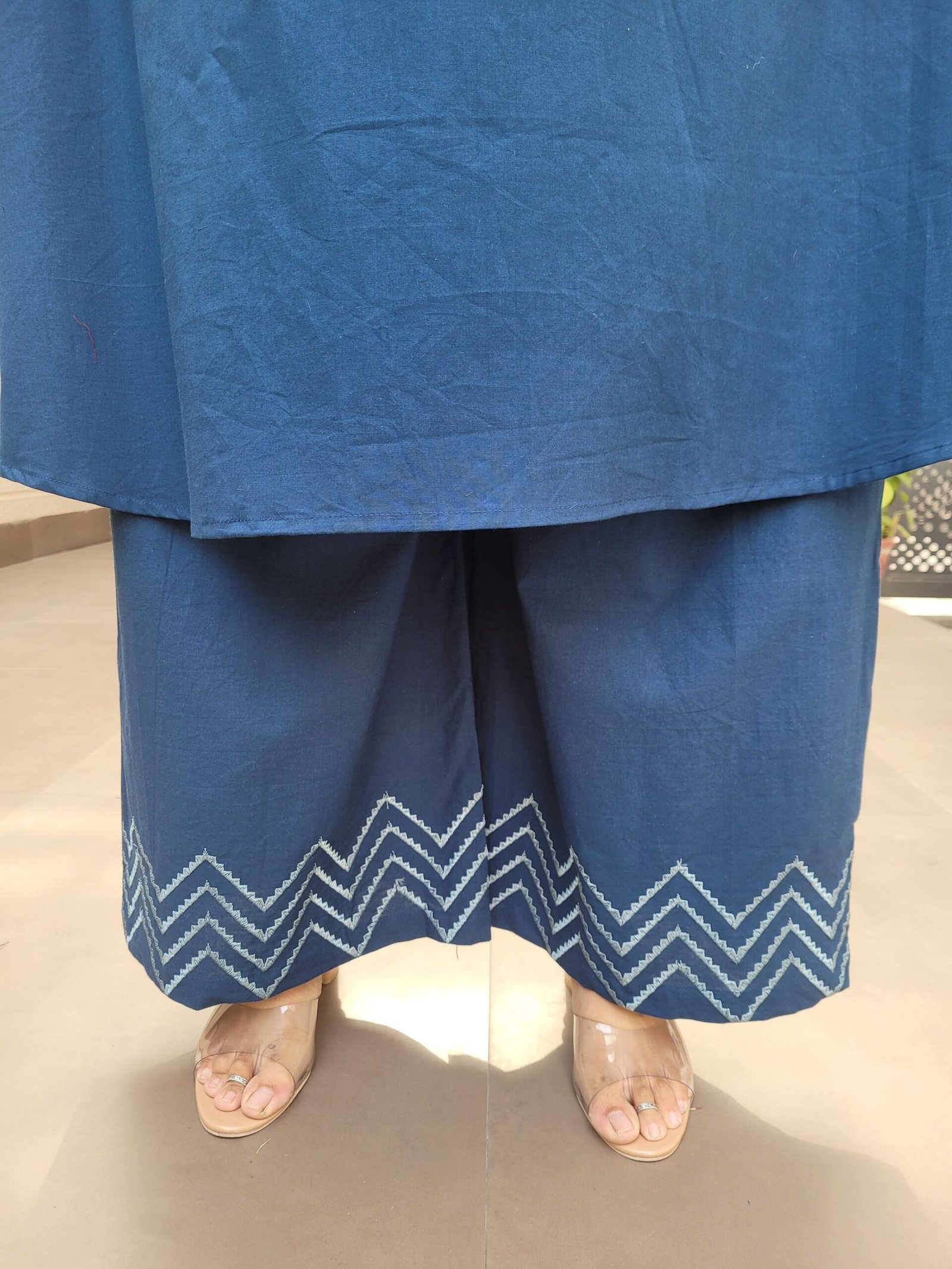 The kurta features a beautifully embroidered panel and a functional pocket, paired with an embroidered palazzo that enhances the coordinated ethnic look. Its A-line silhouette ensures a flattering fit, making it ideal for daily wear, office styling, and casual occasions.