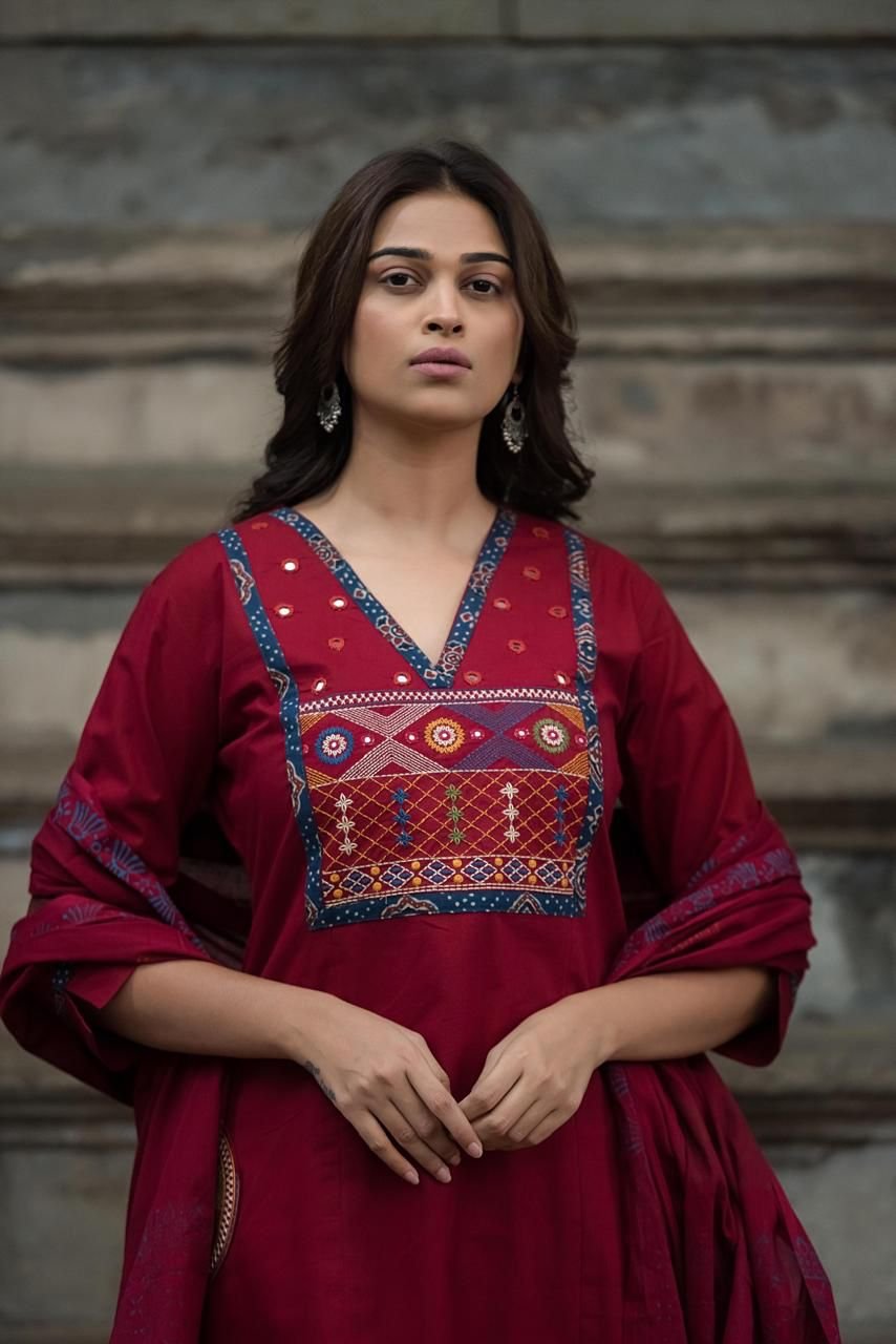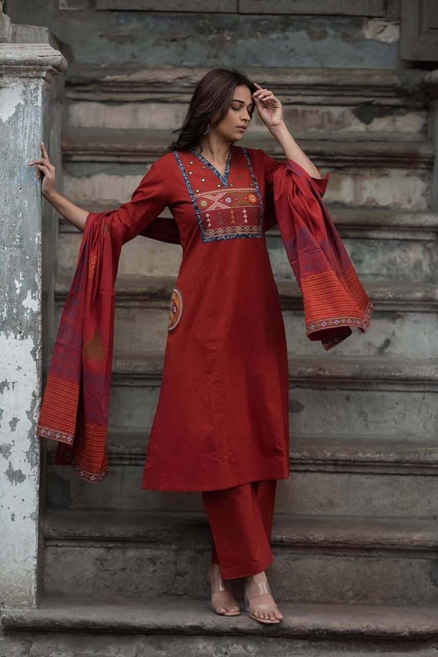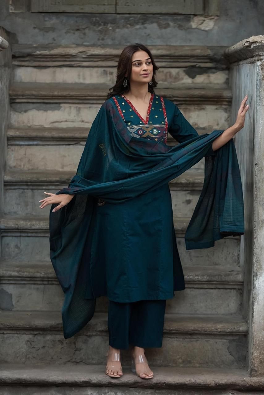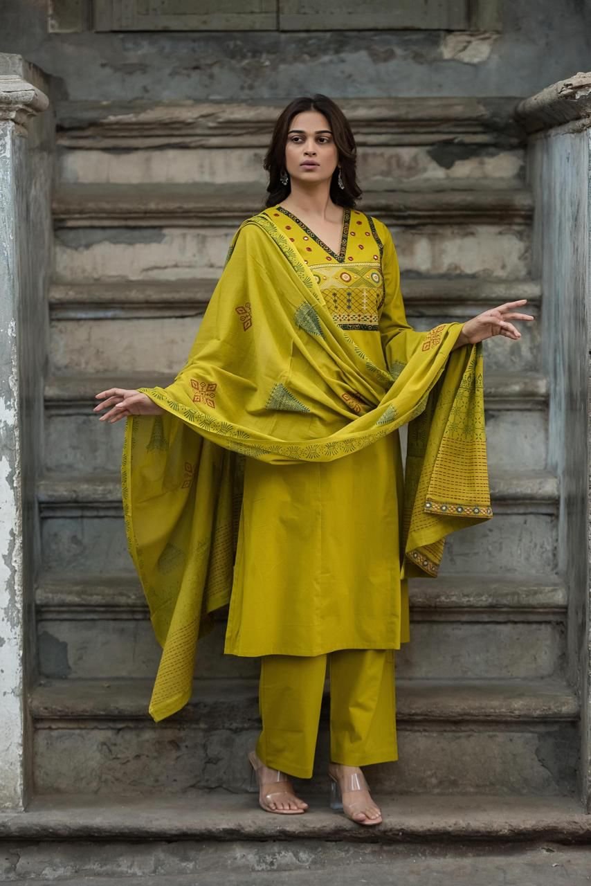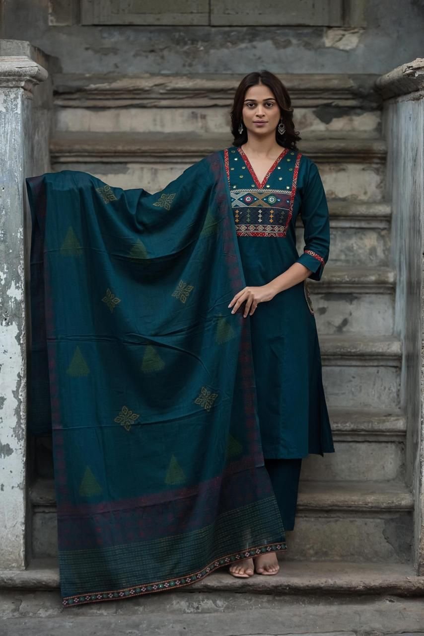 The handcrafted charm is further elevated with a handblock printed dupatta, showcasing traditional printing techniques passed down through generations. This combination of ethnic detailing and modern fit makes DU-408 perfect for office wear, festive gatherings, cultural events, or everyday elegance.