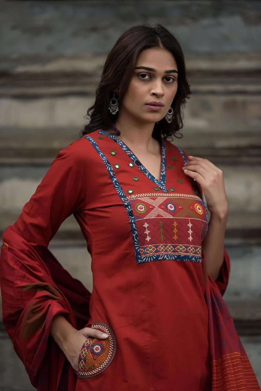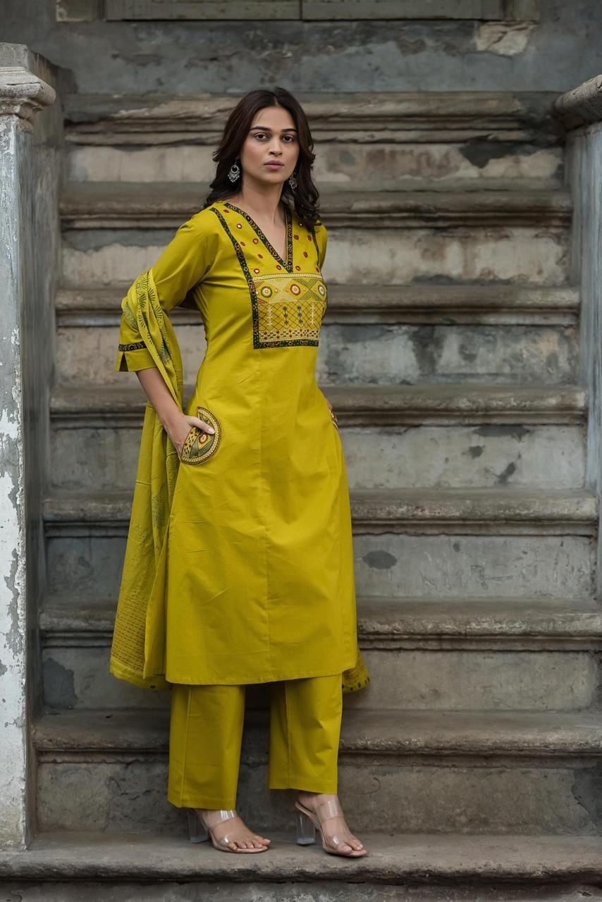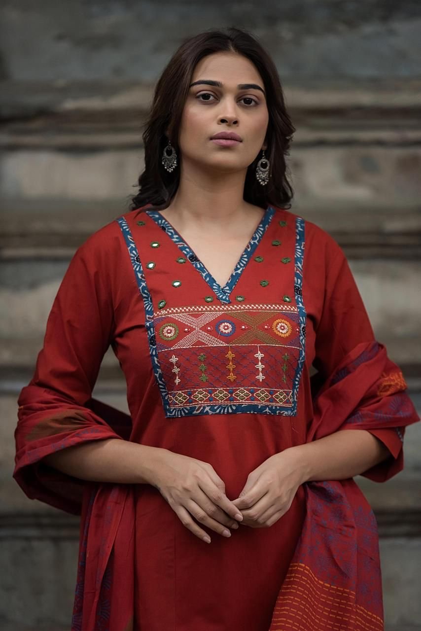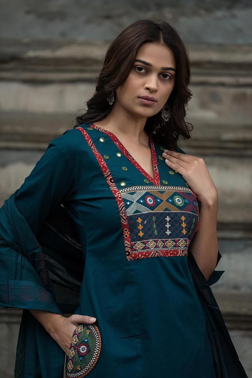 The handcrafted charm is further elevated with a handblock printed dupatta, showcasing traditional printing techniques passed down through generations. This combination of ethnic detailing and modern fit makes DU-408 perfect for office wear, festive gatherings, cultural events, or everyday elegance.