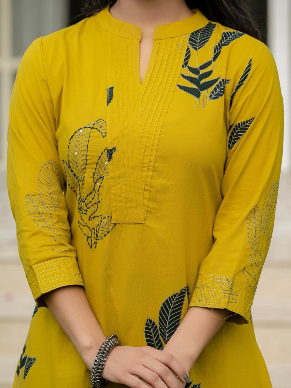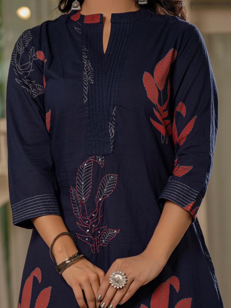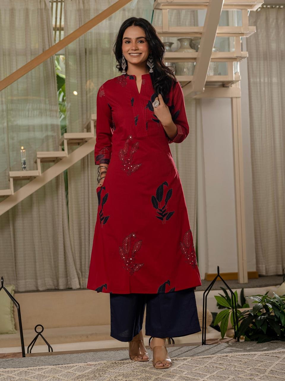 The DU-351 A-Line 3PC Set is crafted from premium, breathable cotton fabric, offering all-day comfort with a stylish appeal. The kurta features elegant Kantha embroidery enhanced with sequins work, giving it a subtle festive charm suitable for daily wear, office, or small occasions.