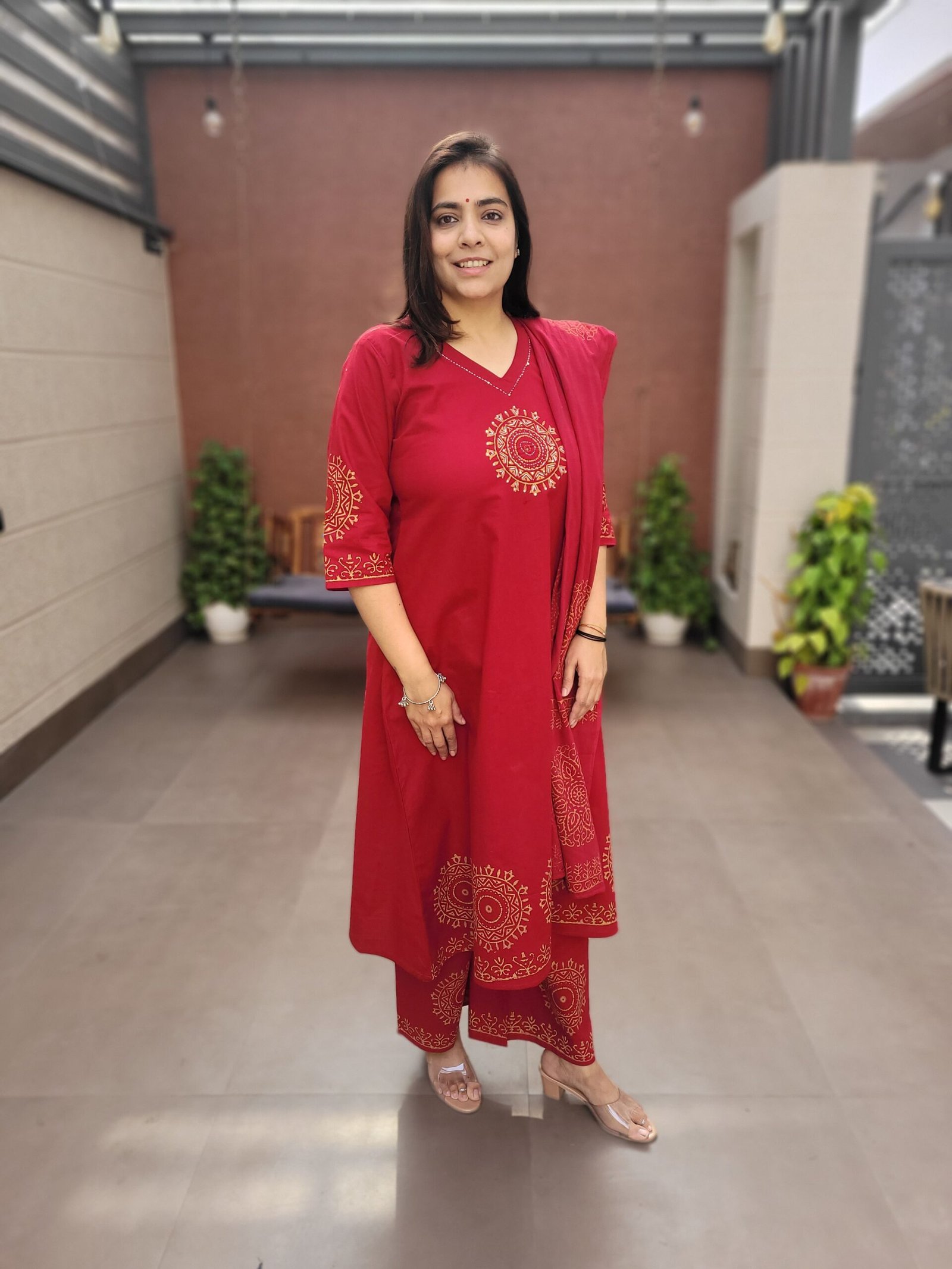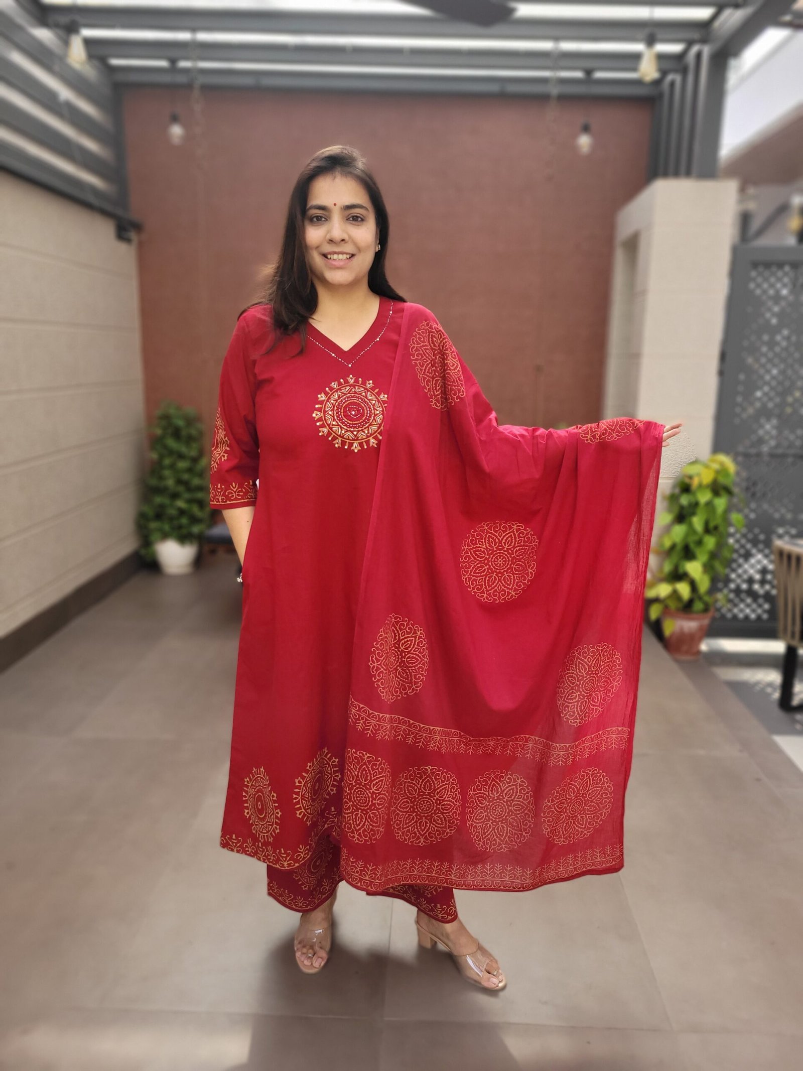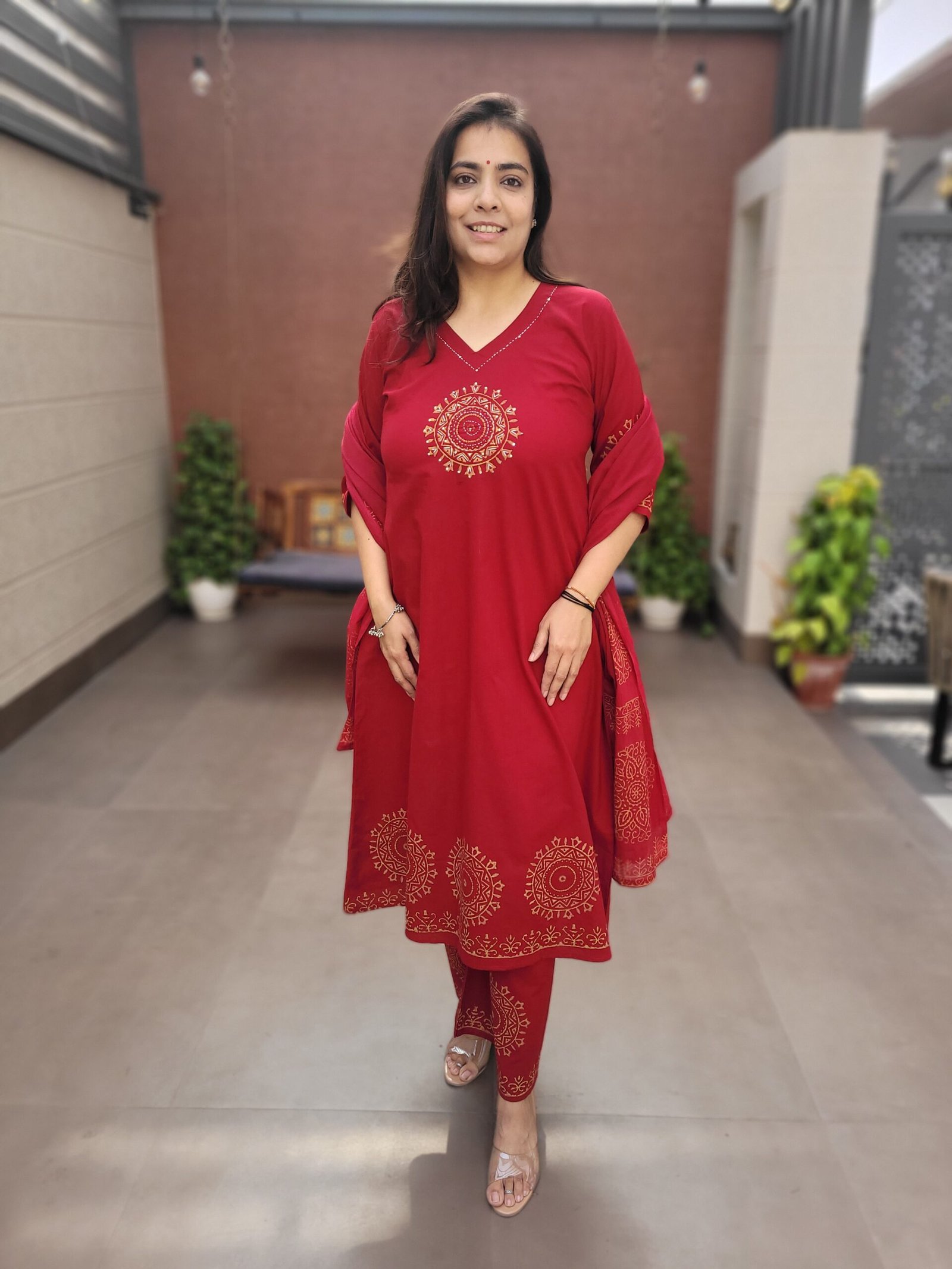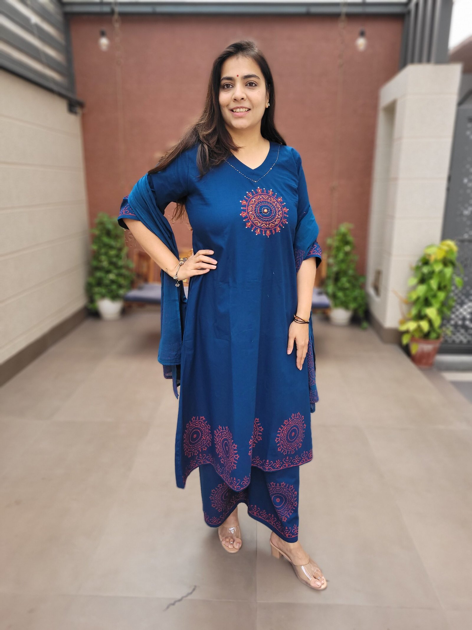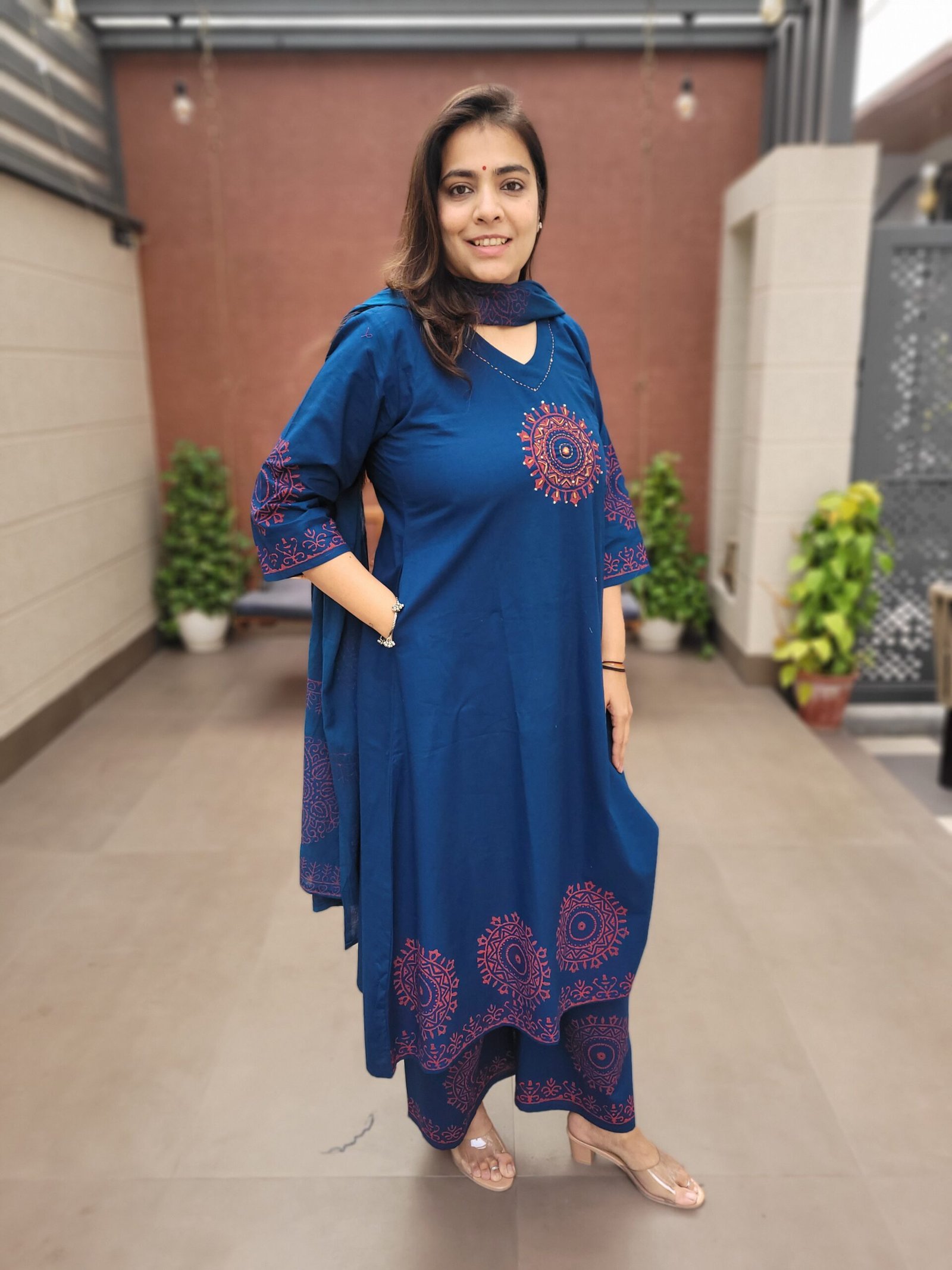 The DU-103 A-Line 3PC Suit Set is a perfect blend of traditional craftsmanship and modern comfort. Made from soft cotton fabric, this set showcases authentic handblock prints with refined handwork detailing.