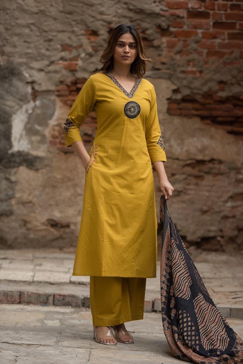 The kurta features handwork on the yoke with an A-line cut, creating a flattering silhouette. The double embroidered pockets add both style and functionality.
