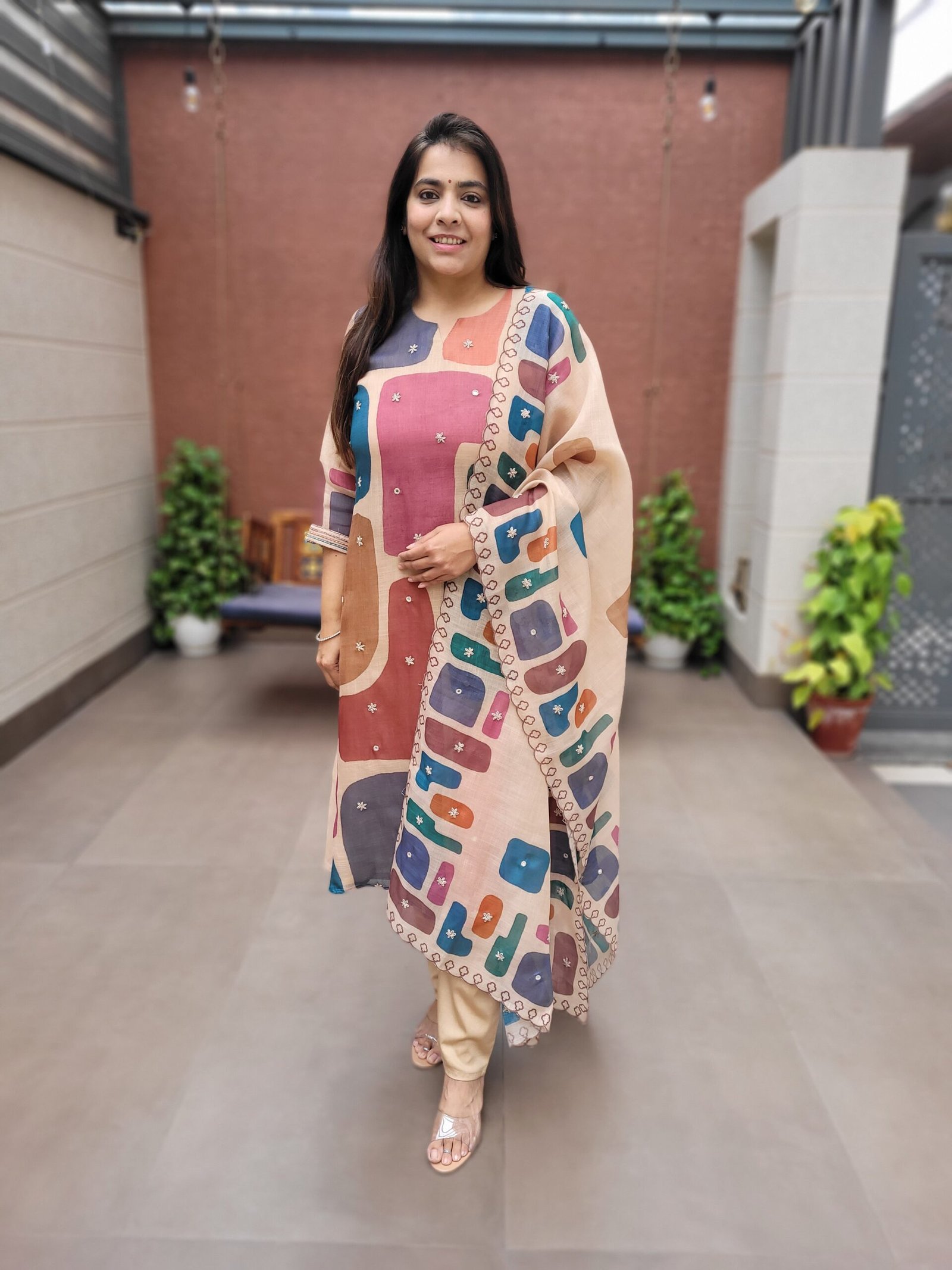 Detailed with Kantha handwork, the kurta pairs beautifully with a worked linen dupatta, making this set suitable for both everyday wear and refined ethnic occasions.