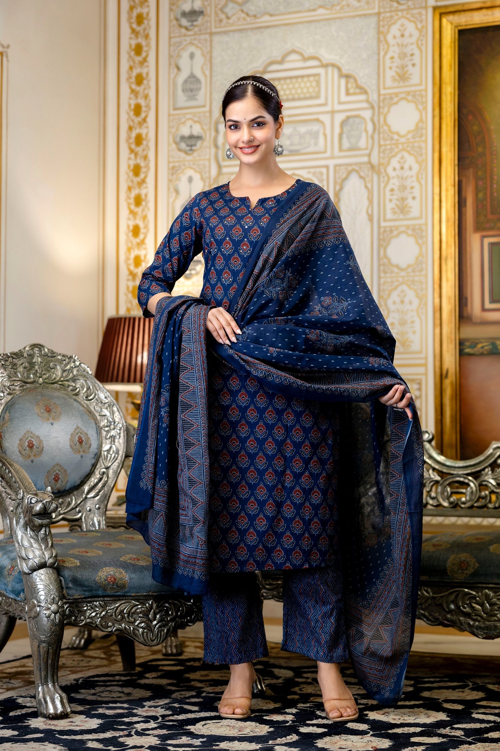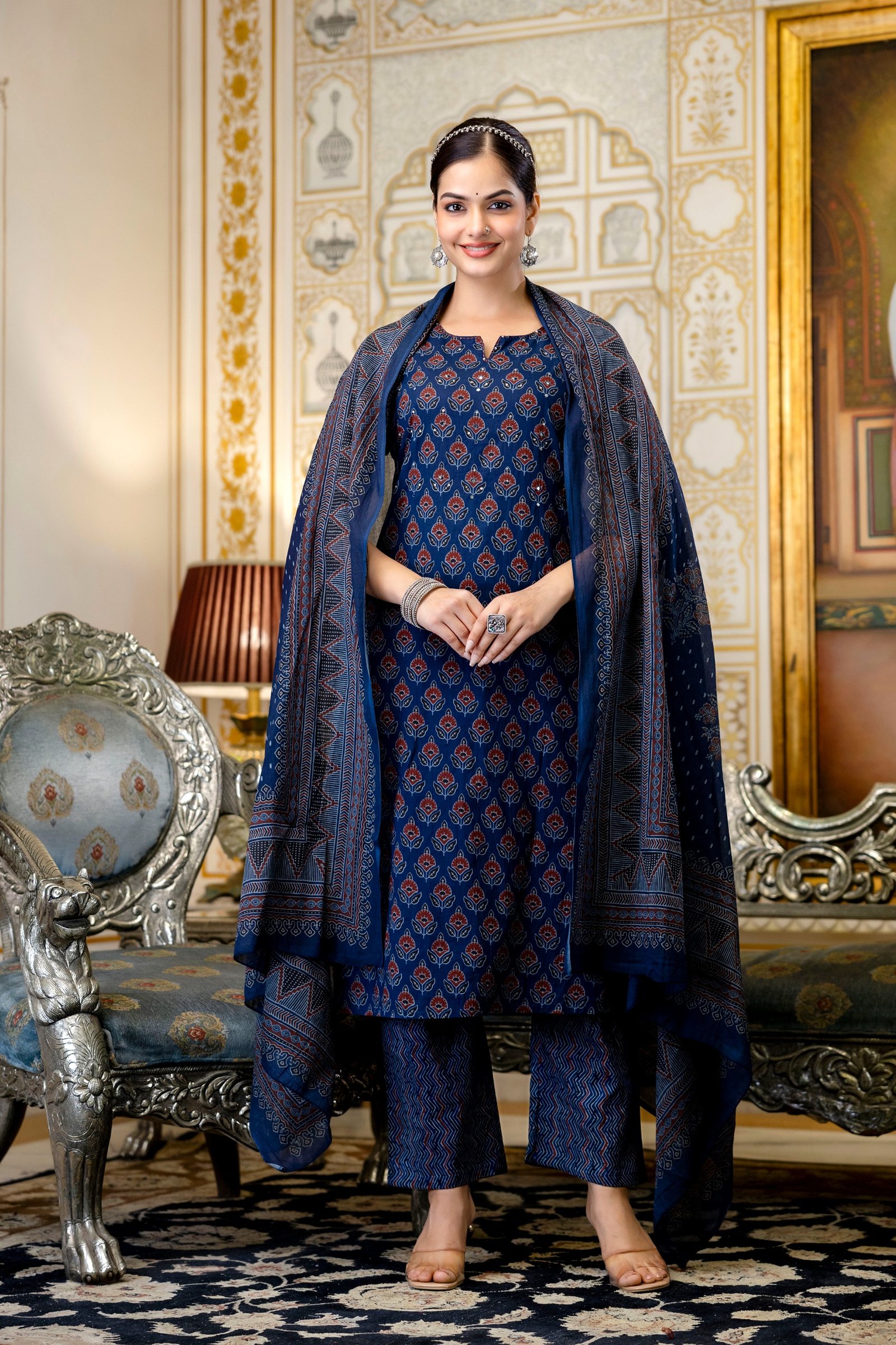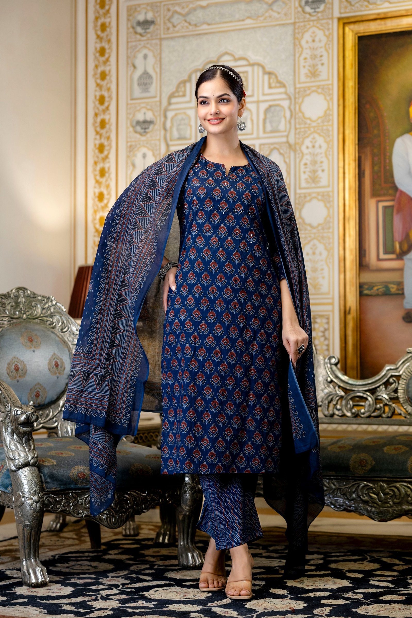 The kurta is enhanced with beautiful handwork detailing, adding a handcrafted charm to the outfit. Inspired by timeless Ajrakh patterns, this set creates a rich ethnic appeal with elegant styling.