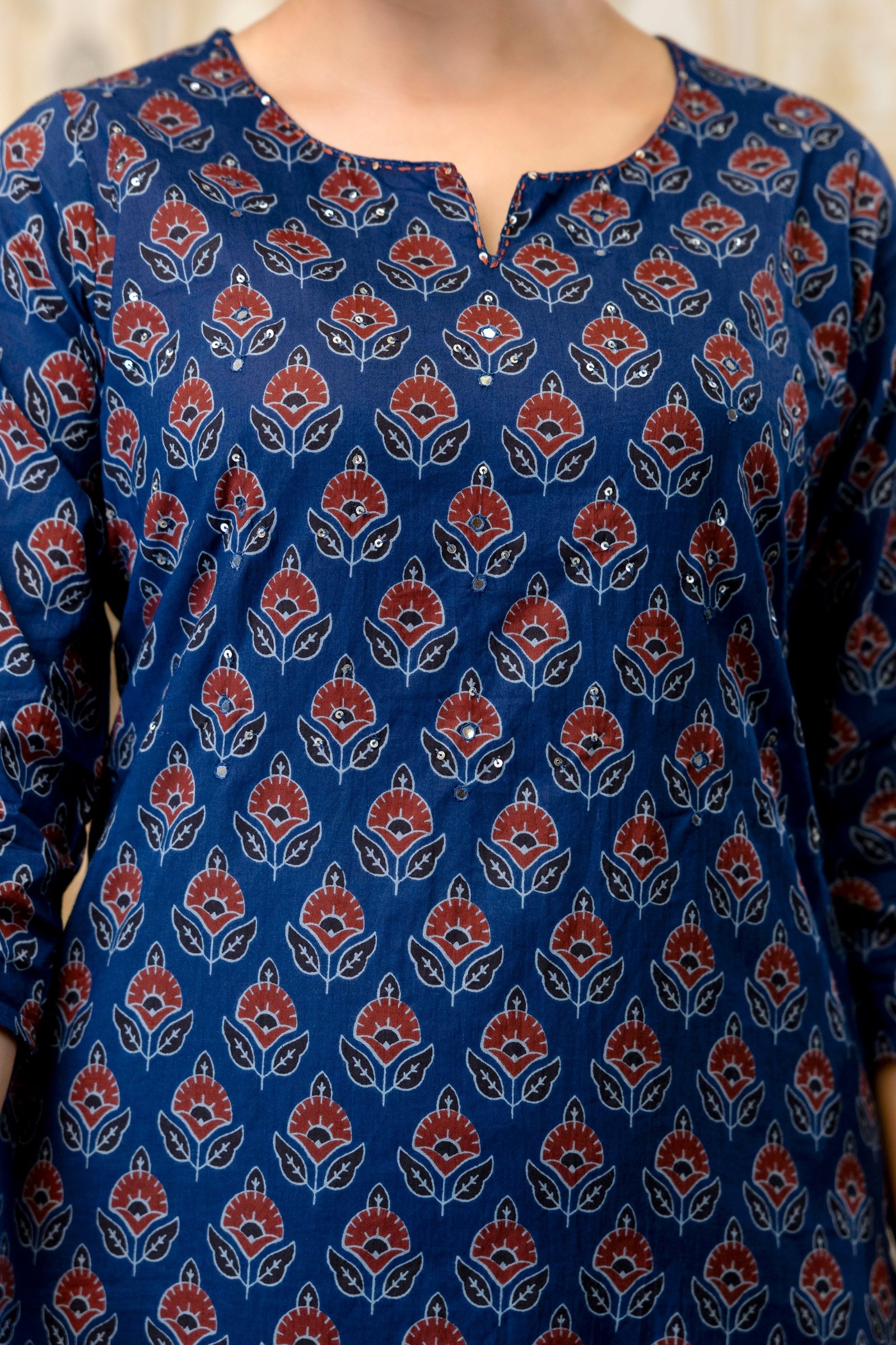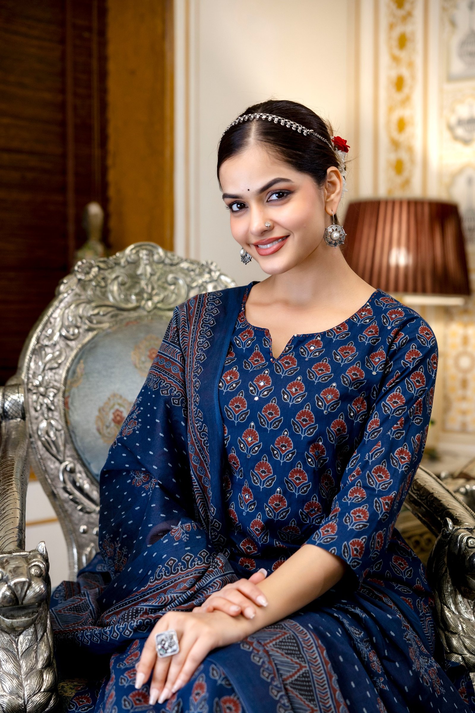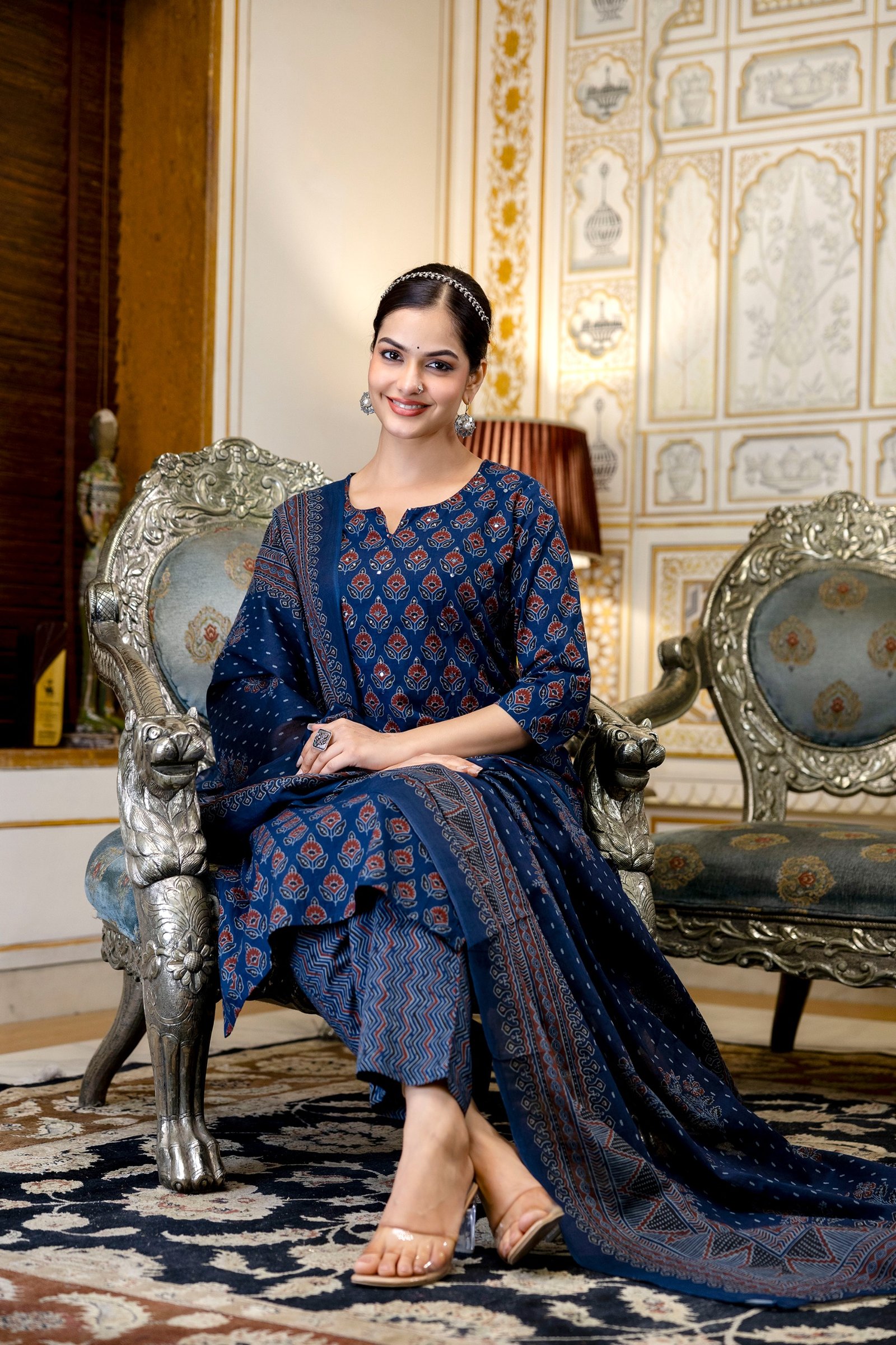 The kurta is enhanced with beautiful handwork detailing, adding a handcrafted charm to the outfit. Inspired by timeless Ajrakh patterns, this set creates a rich ethnic appeal with elegant styling.