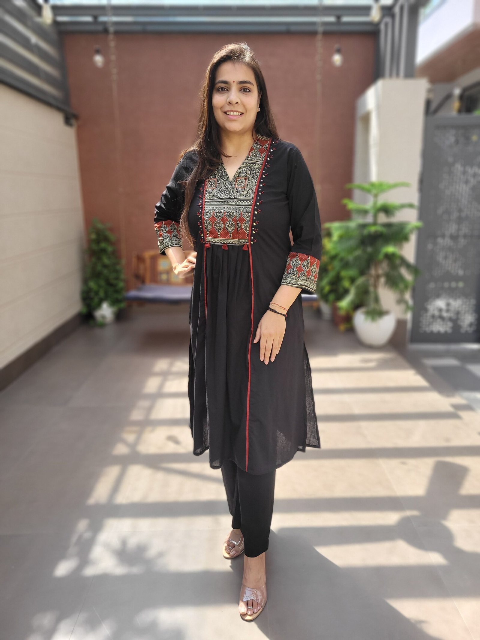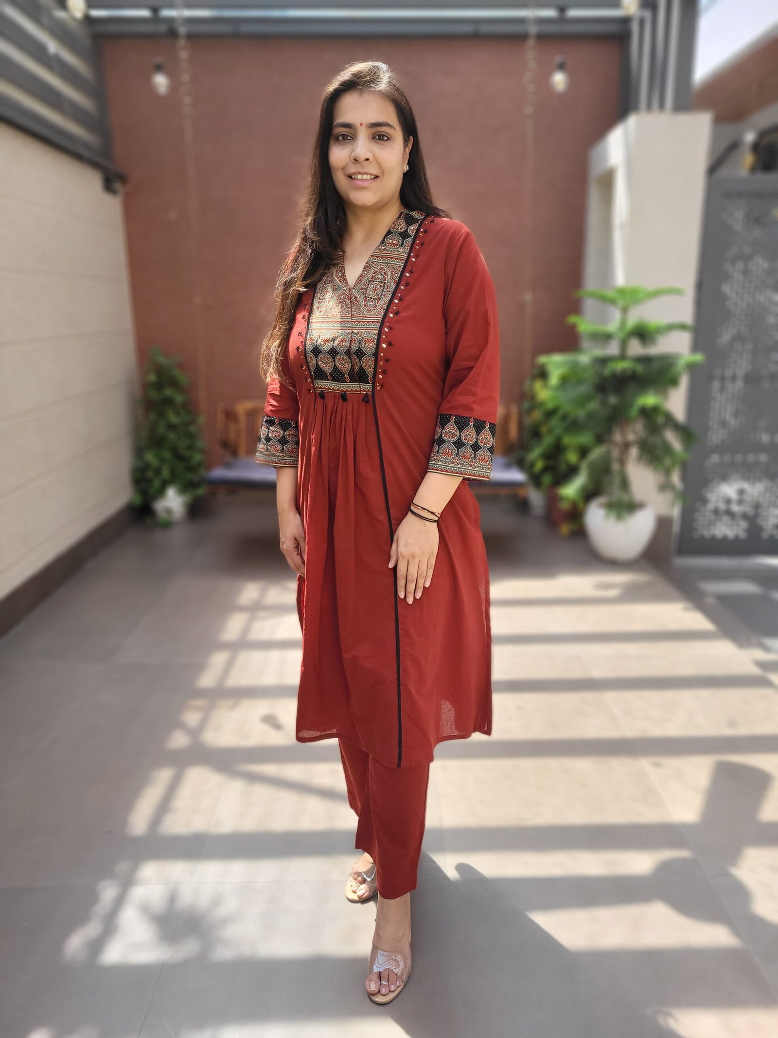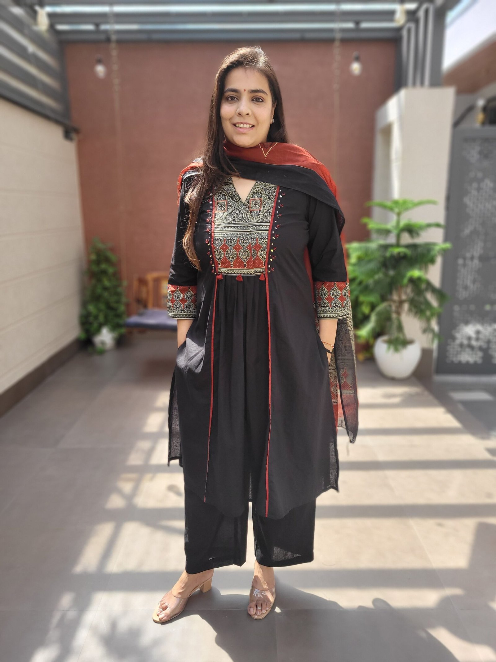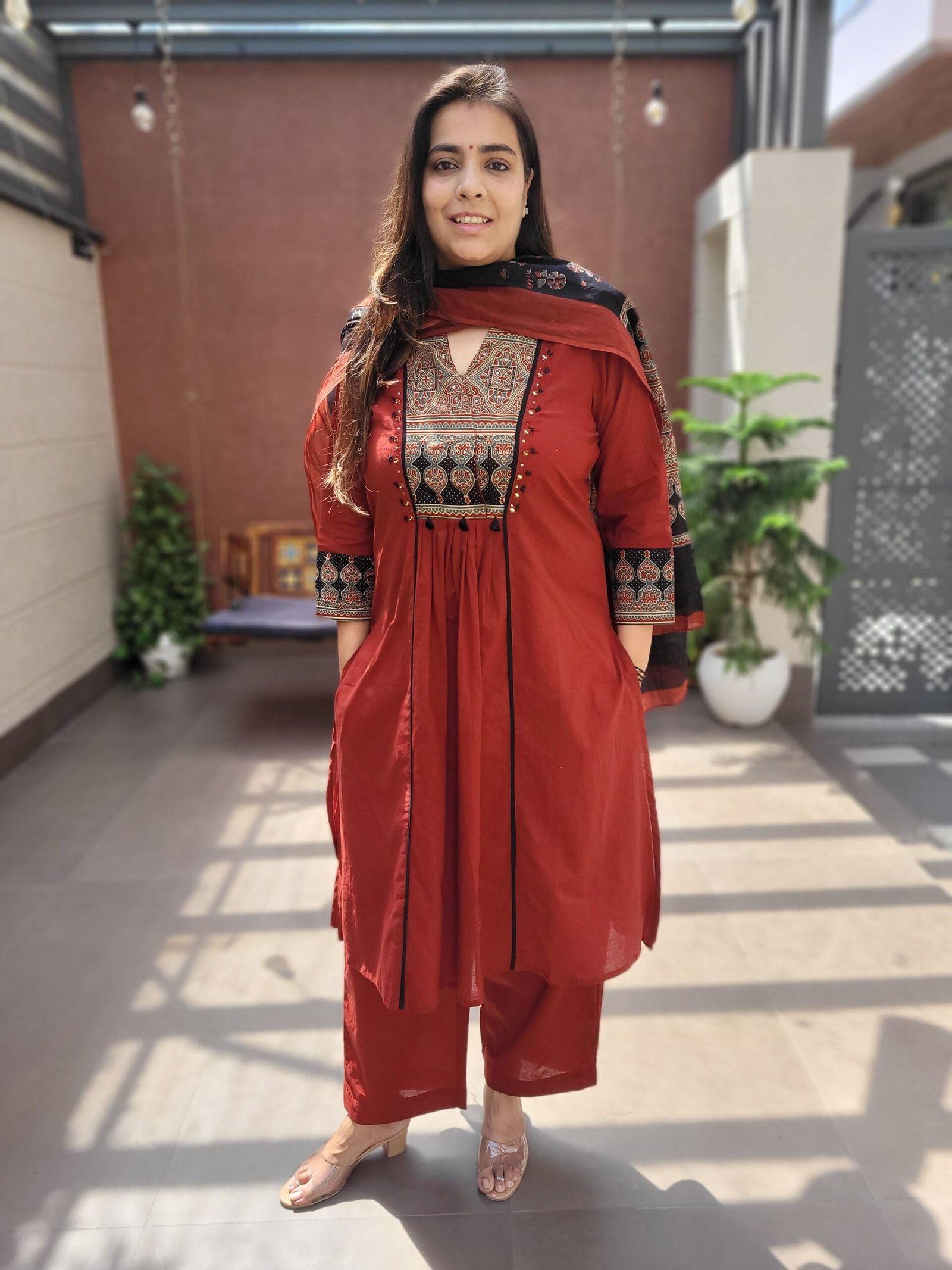 The kurta features mirror and sequins work, adding a subtle shine, while the Ajrakh-inspired styling gives it a cultural touch. Paired with a full cotton dupatta, it is ideal for festivals and celebrations.