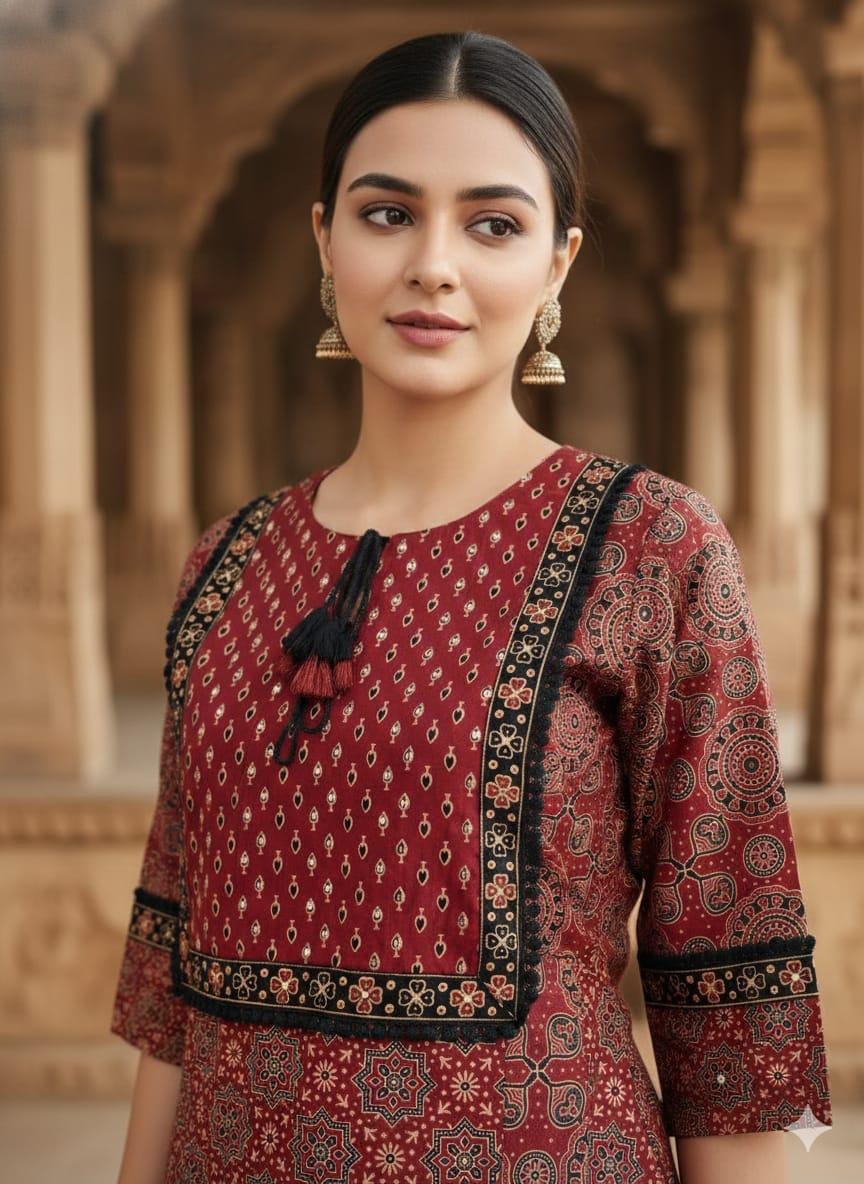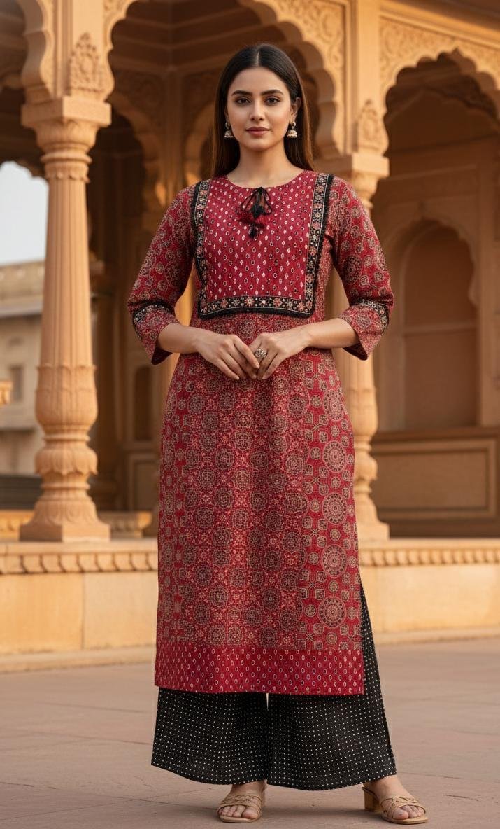 The DU-671 Ajrakh 3PC Set is a perfect blend of traditional artistry and everyday comfort. Crafted from premium cotton in classic Ajrakh print, this outfit offers a breathable feel with a timeless ethnic appeal.