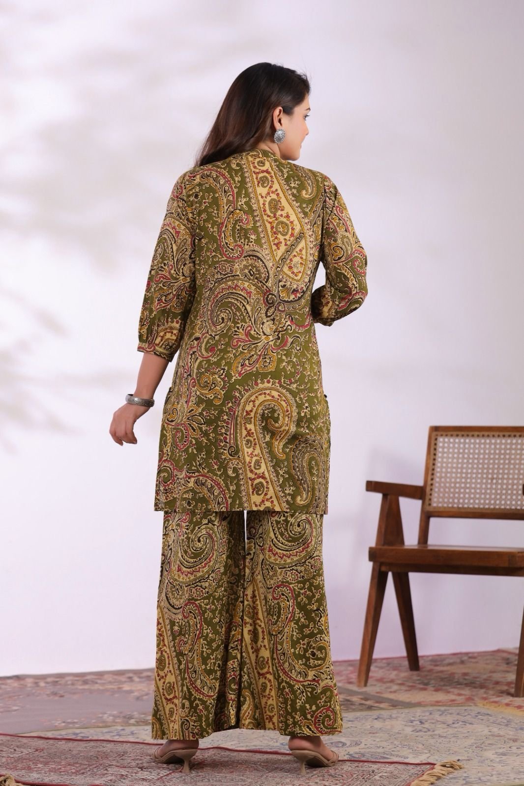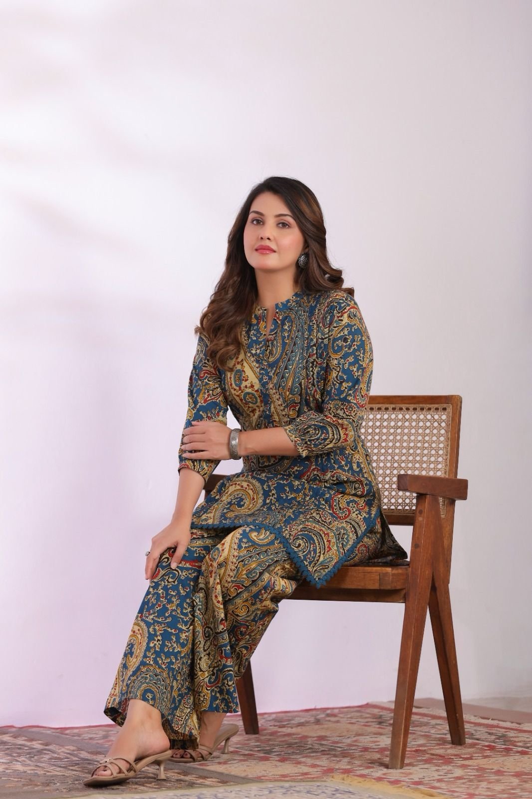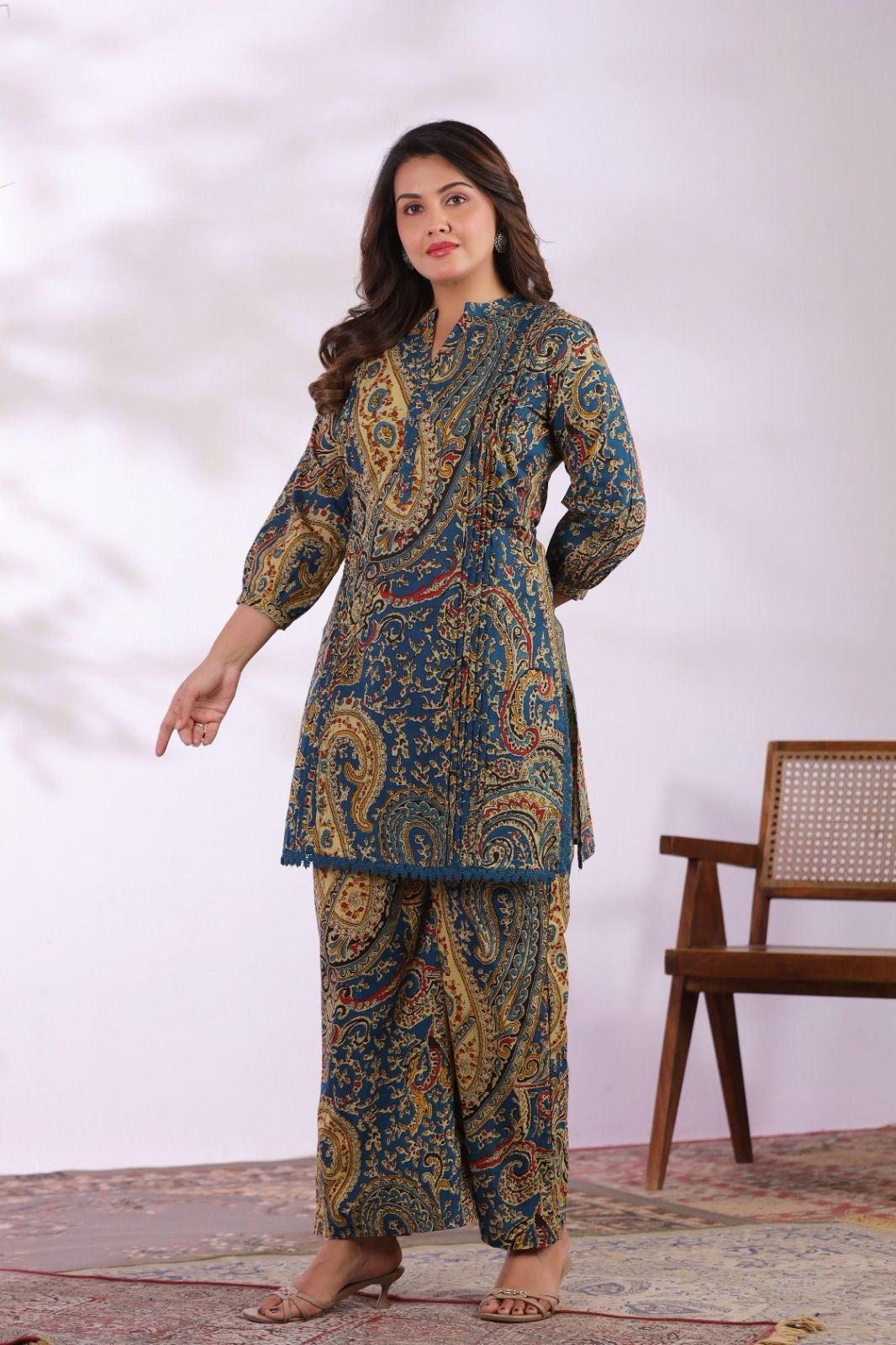 The CS-013 Ajrakh Co-ord Set blends traditional artistry with contemporary fashion. Crafted from soft cotton fabric, this outfit offers excellent comfort and breathability for everyday wear.
