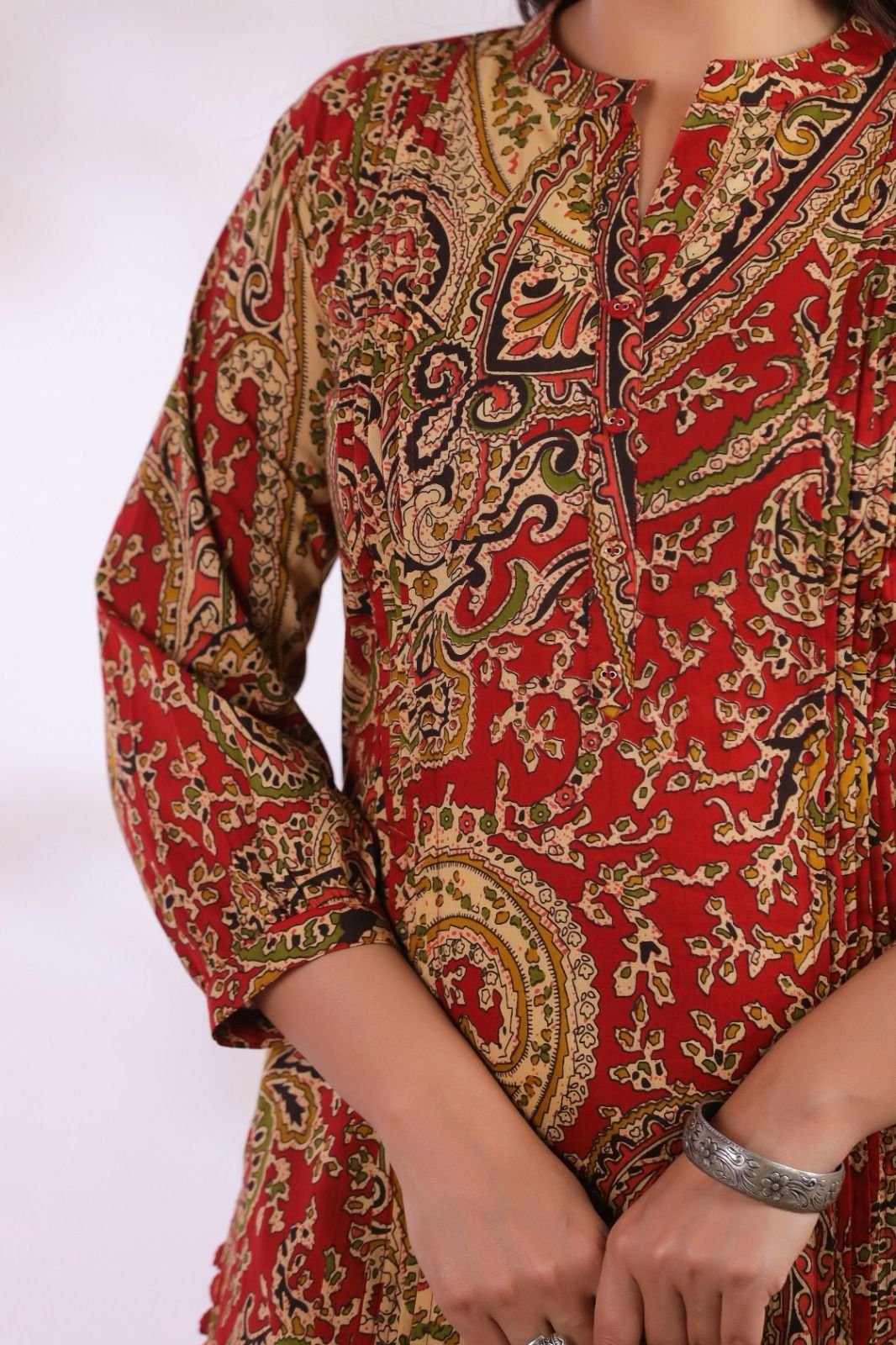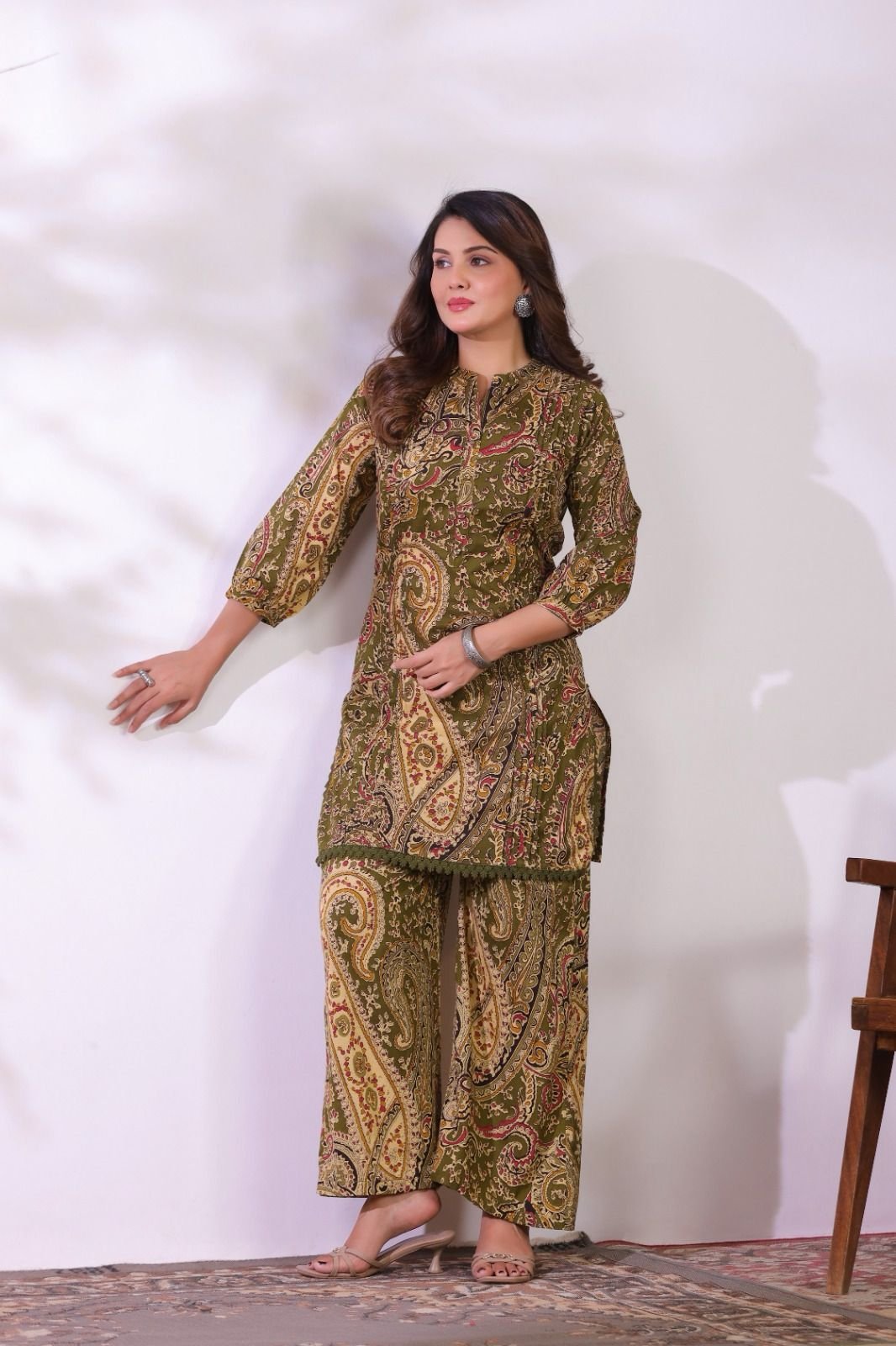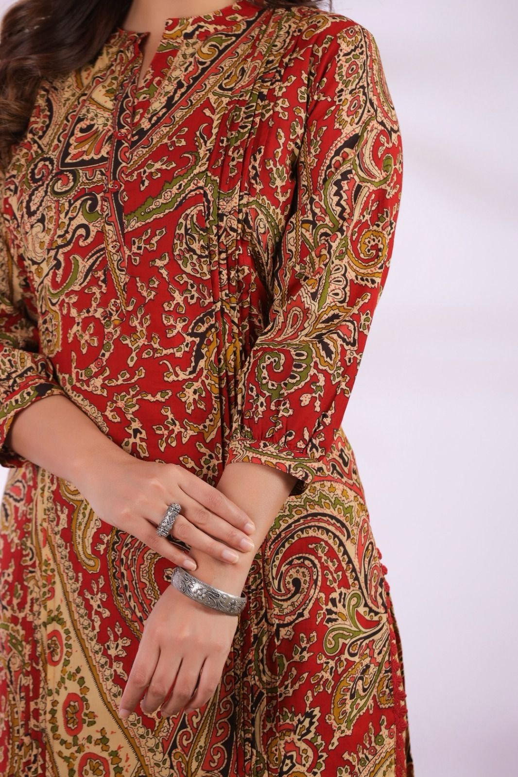 The CS-013 Ajrakh Co-ord Set blends traditional artistry with contemporary fashion. Crafted from soft cotton fabric, this outfit offers excellent comfort and breathability for everyday wear.