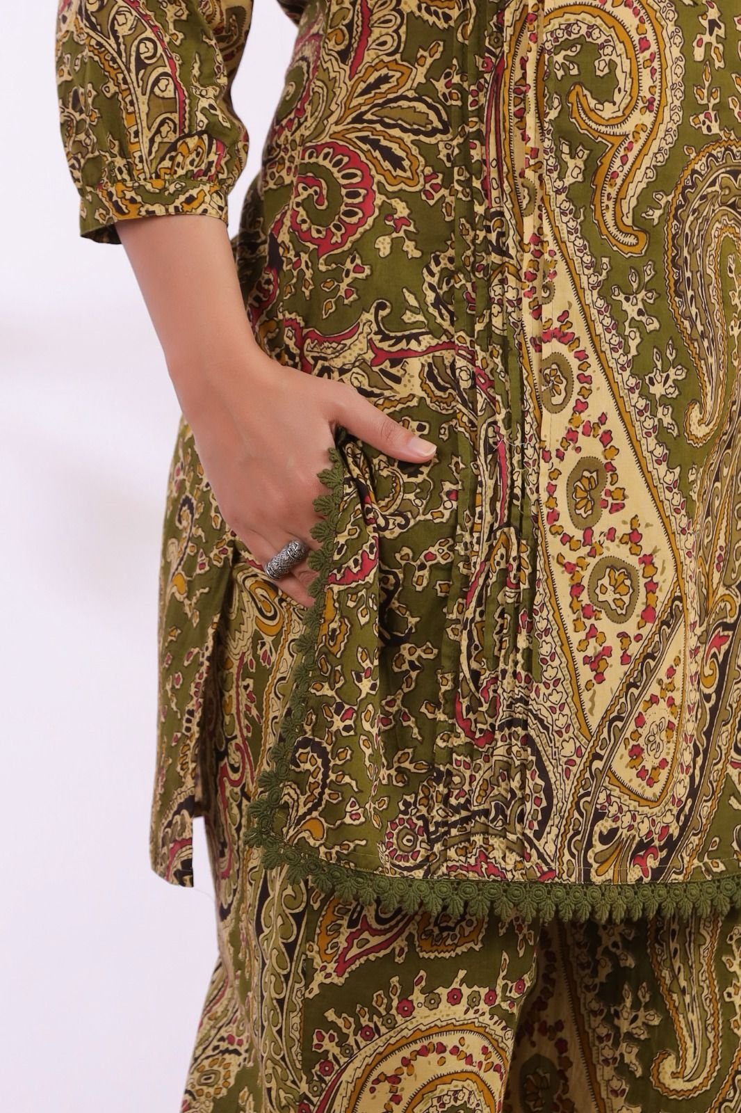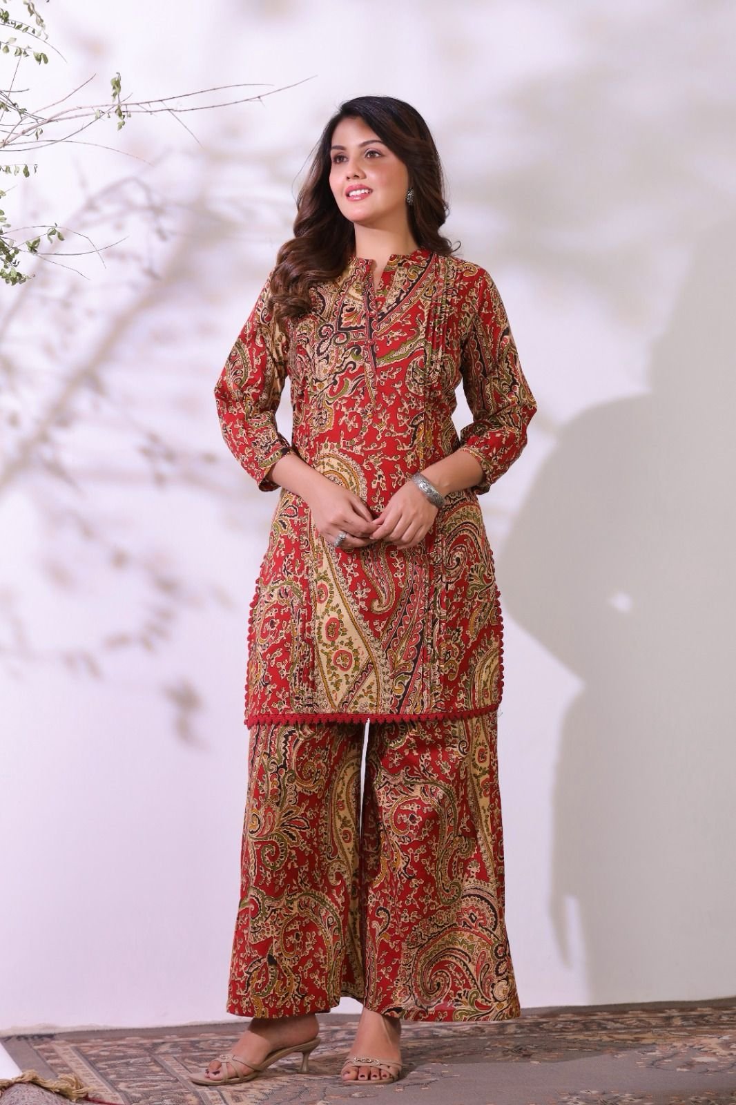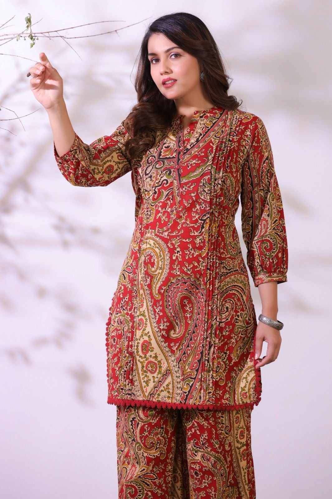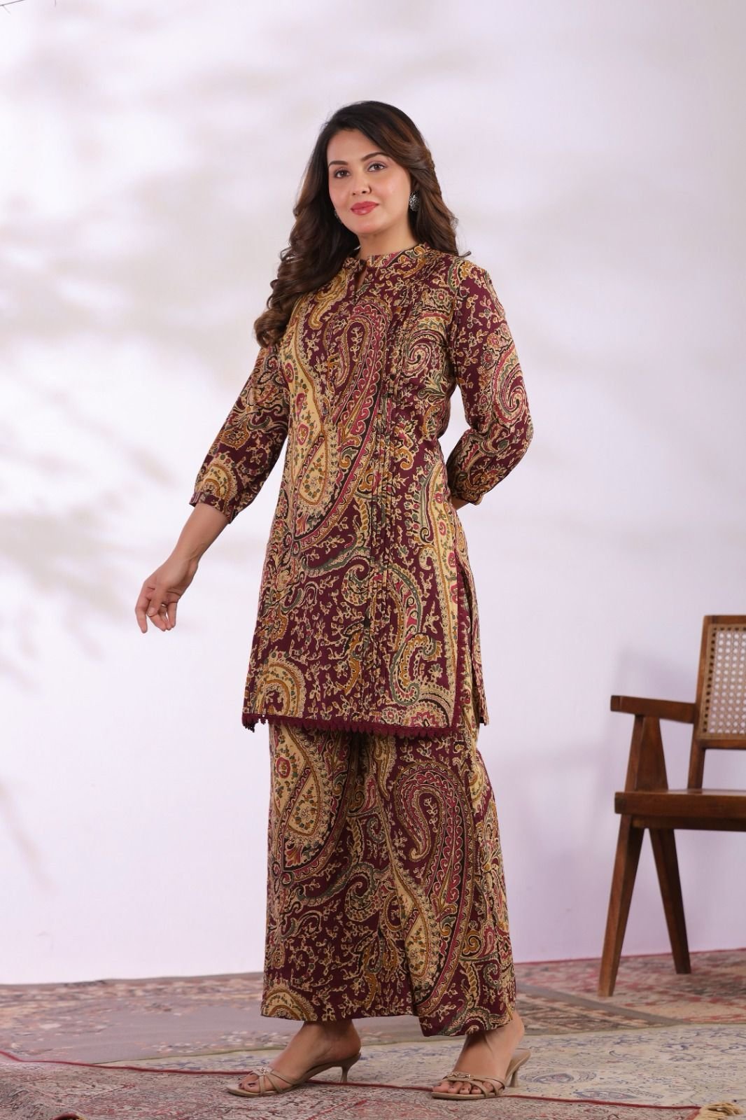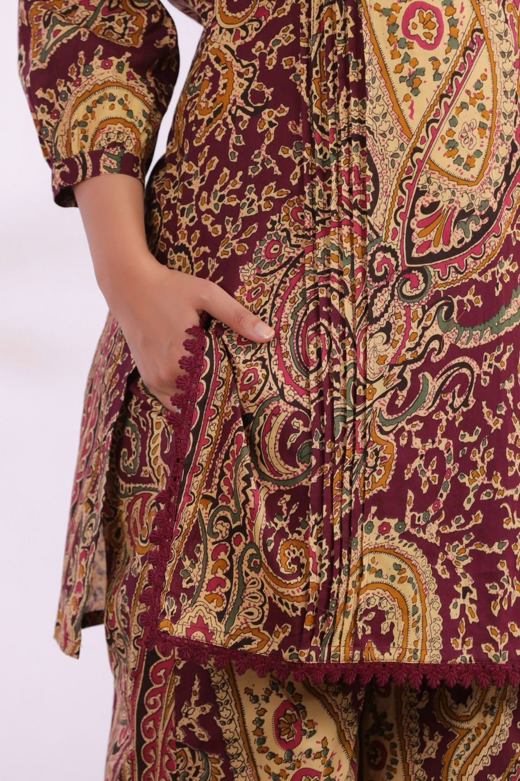The kurta features stylish pintucks detailing and delicate crochet lace work, adding texture and elegance to the design. Inspired by classic Ajrakh patterns, the co-ord set brings a rich ethnic feel while maintaining a modern silhouette.