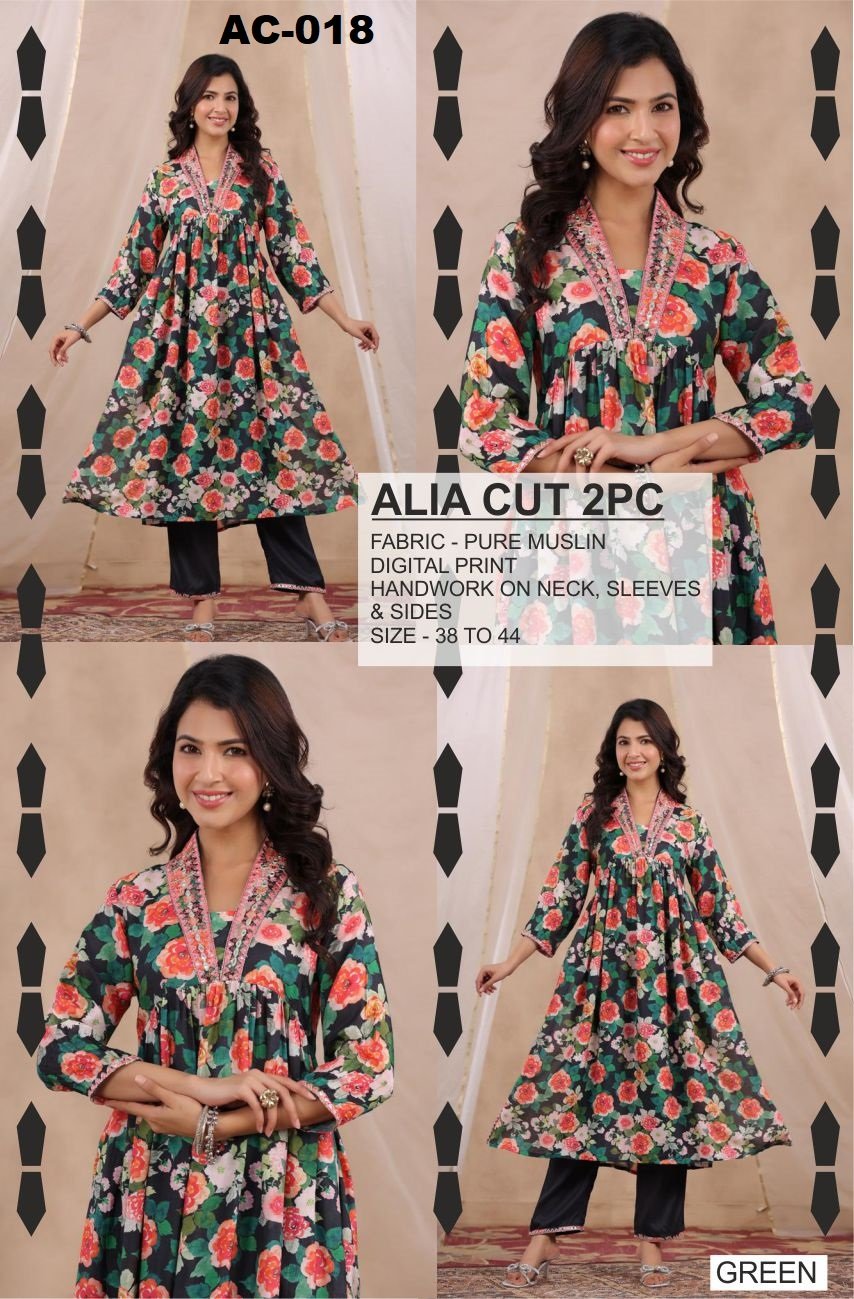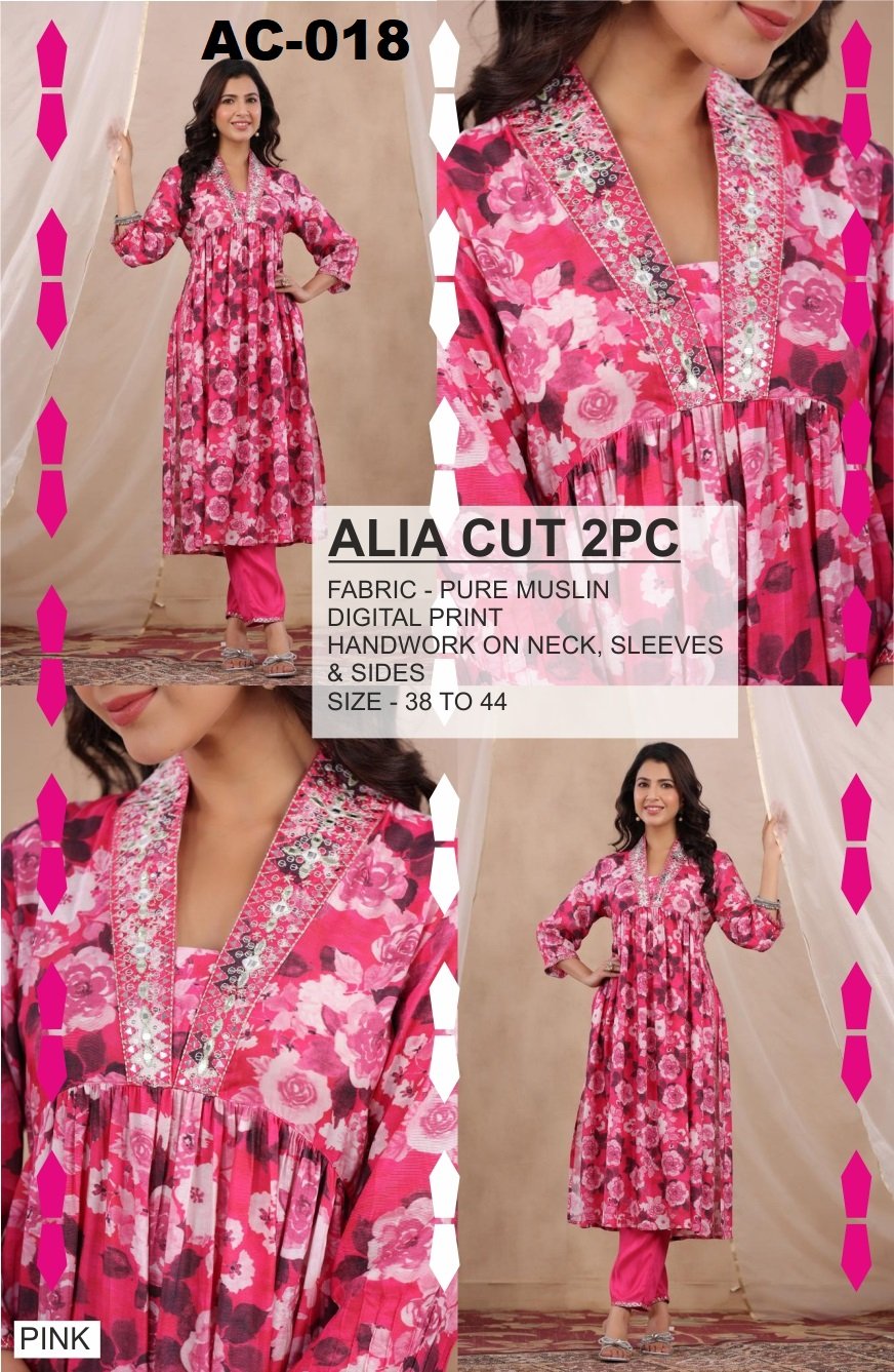 The AC-018 Alia Cut 2PC Set is crafted from lightweight pure muslin, offering graceful movement and all-day comfort. Enhanced with digital prints and intricate handwork on the neckline, sleeves, and sides, this set exudes refined elegance.