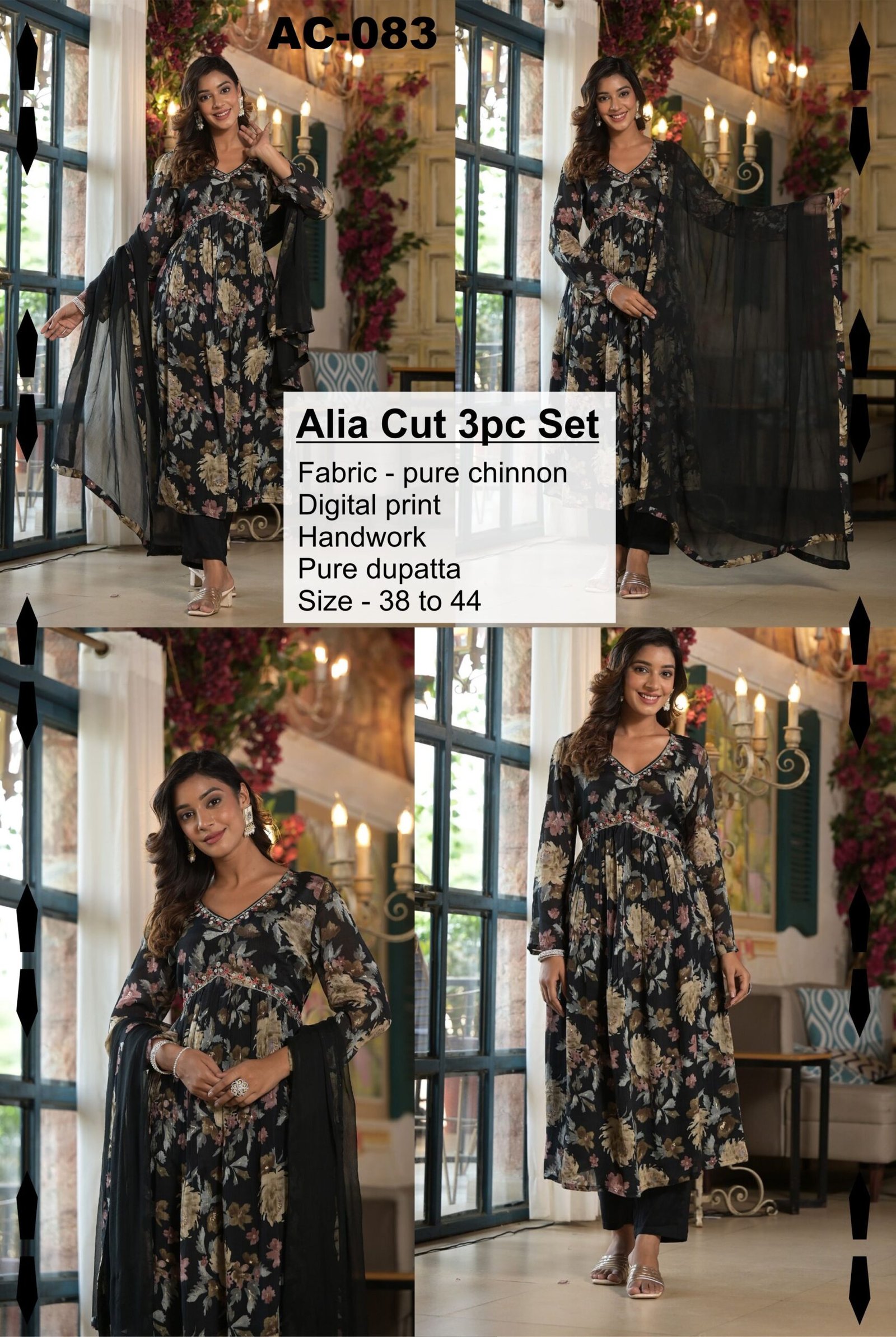 The AC-083 Alia Cut 3PC Set is a graceful fusion of contemporary fashion and ethnic artistry. Crafted from premium pure chinon fabric, this ensemble offers a lightweight, flowy drape that enhances movement and adds an effortlessly elegant appeal.