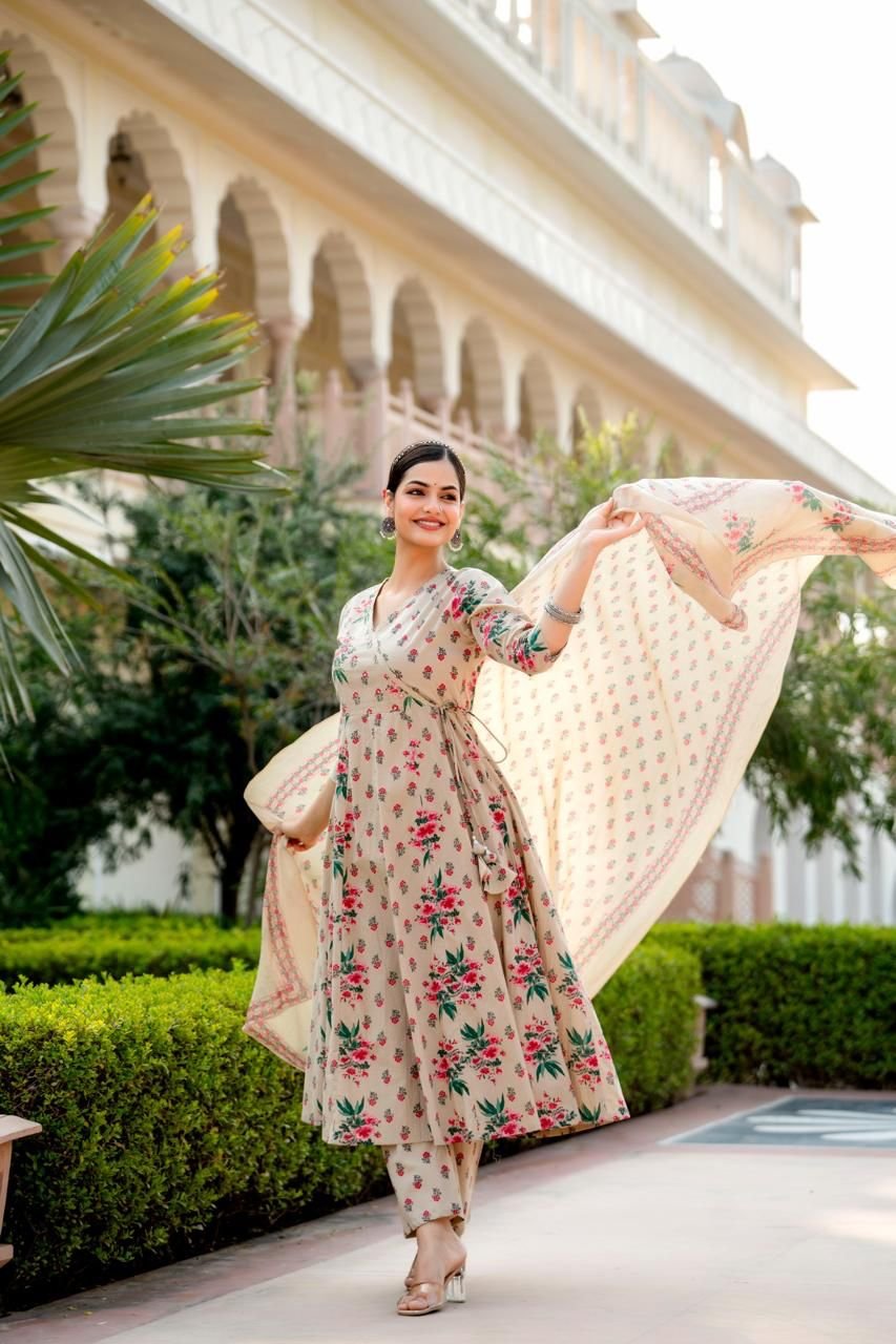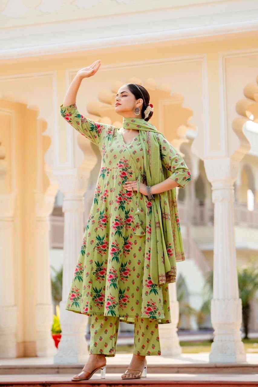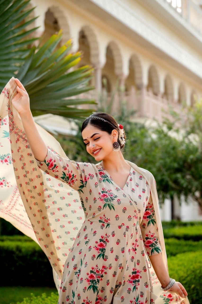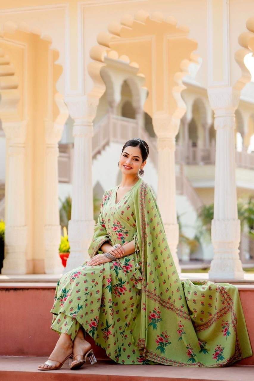 Designed in a classic Angrakha Anarkali pattern, the kurta features change work detailing and a beautifully flared 12-kali silhouette, creating elegant movement with every step. Perfect for festive gatherings, cultural events, and daytime celebrations, this ensemble brings timeless charm in soothing Pista and Beige tones.