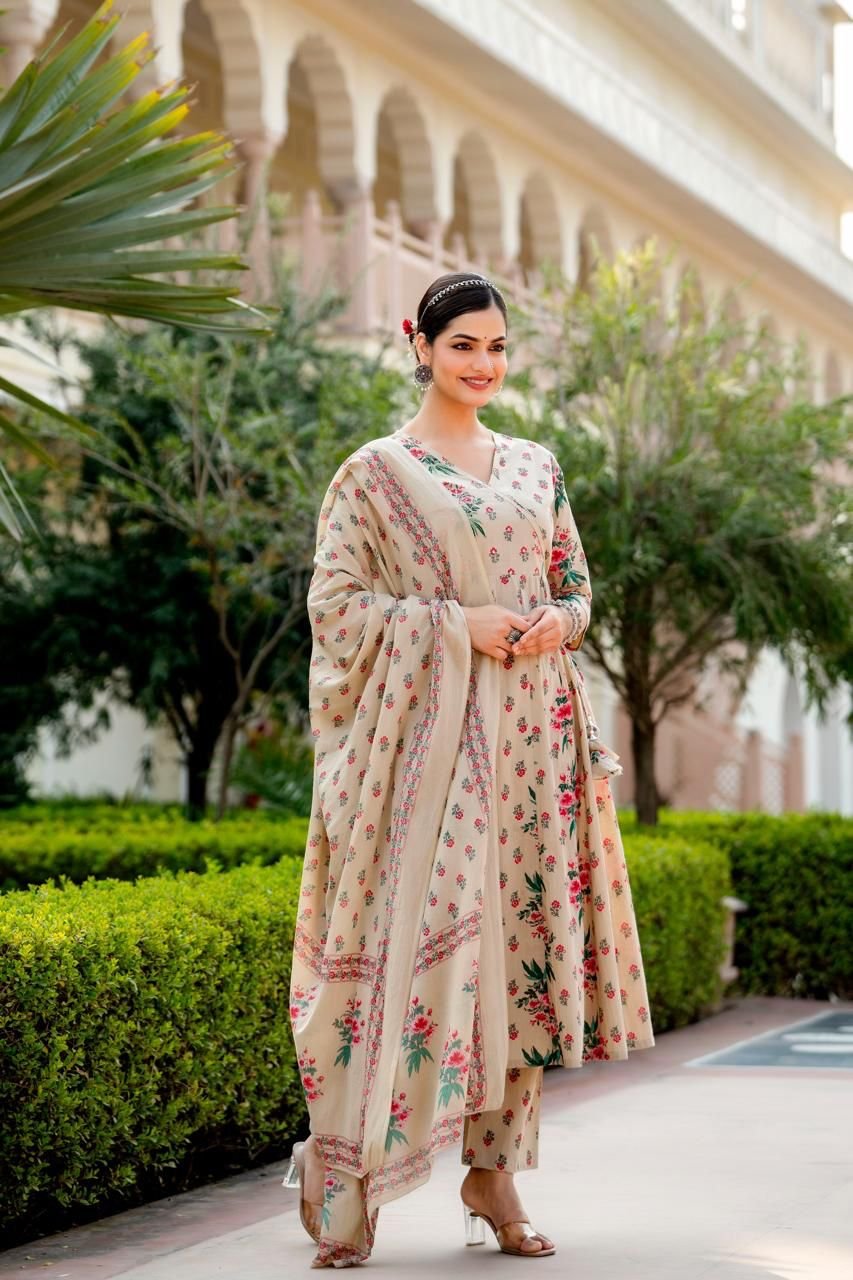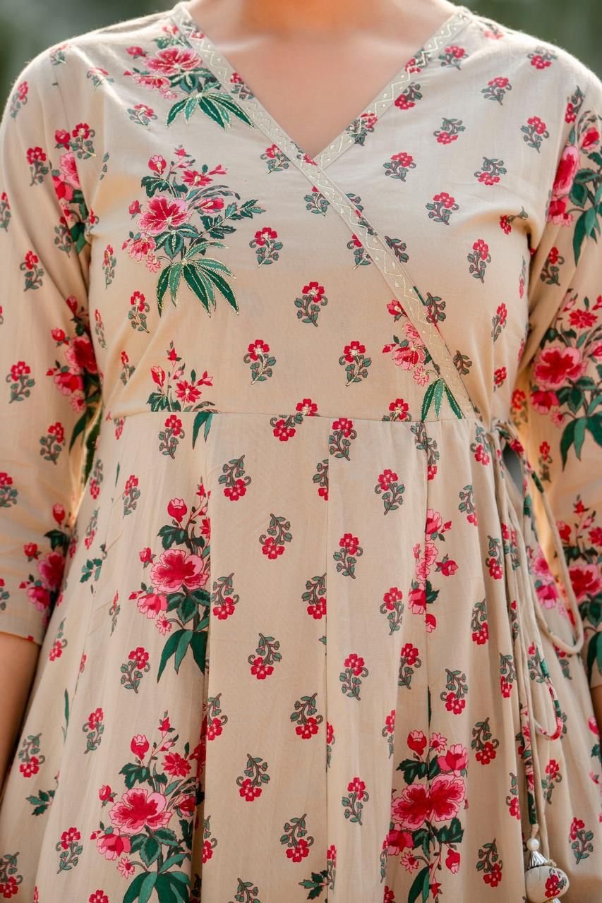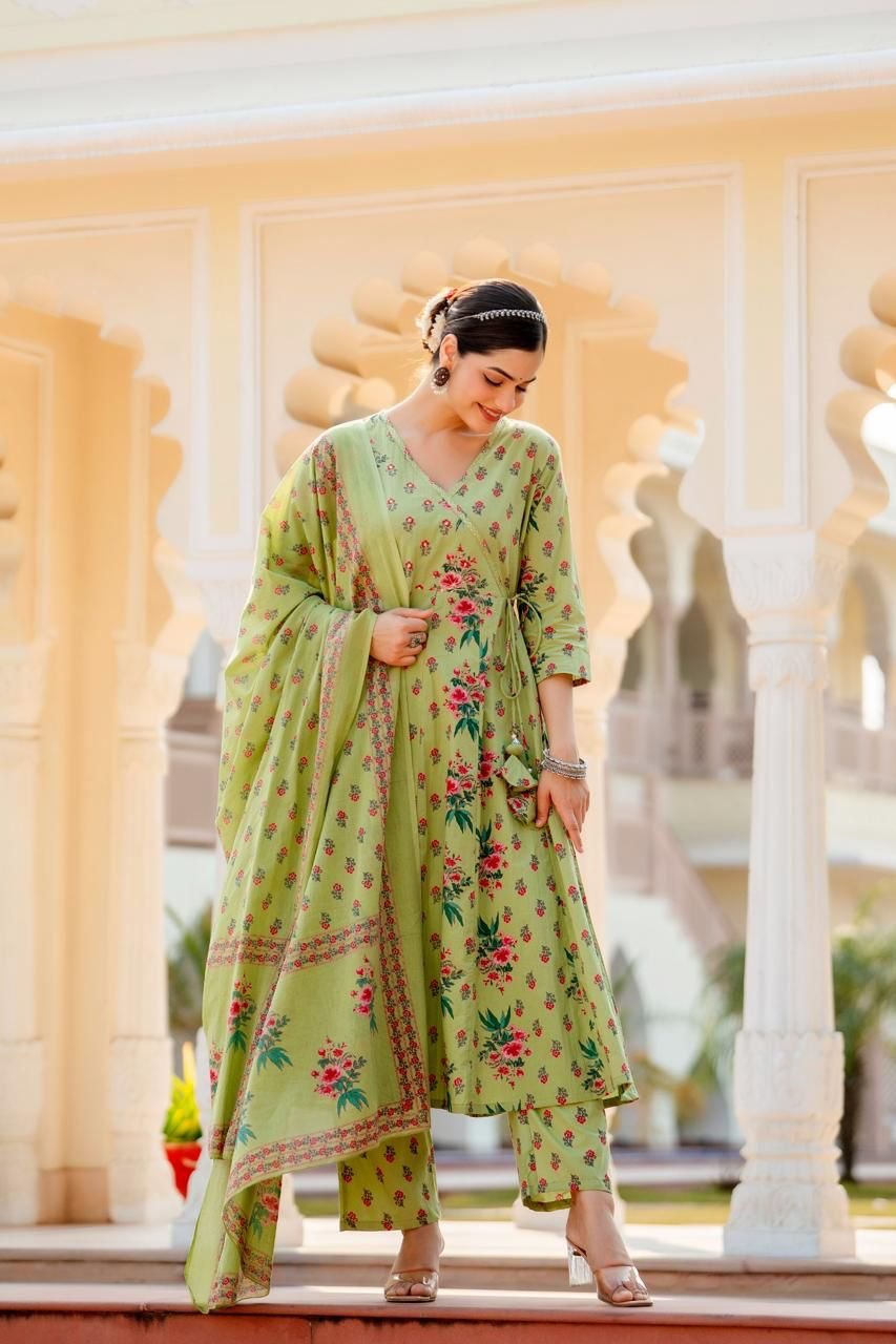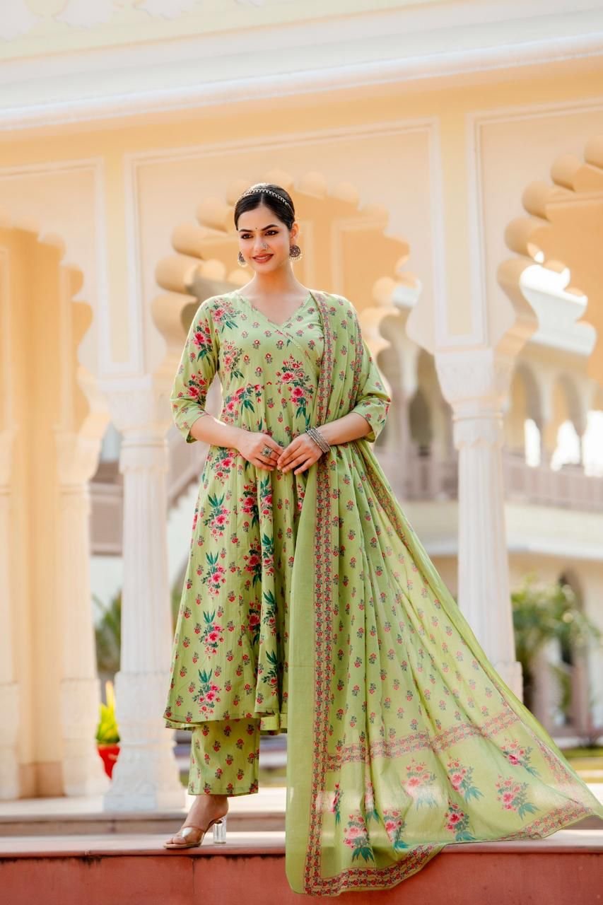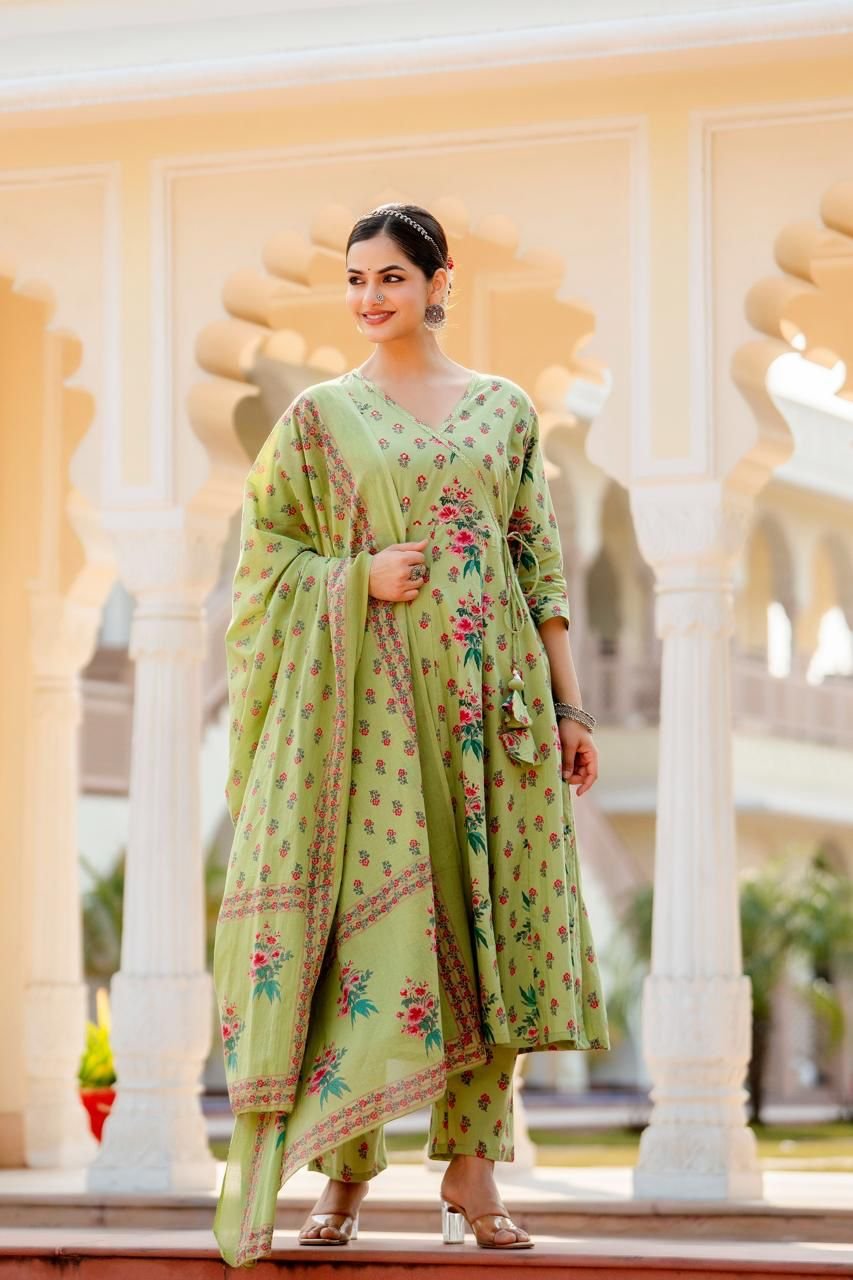 Designed in a classic Angrakha Anarkali pattern, the kurta features change work detailing and a beautifully flared 12-kali silhouette, creating elegant movement with every step. Perfect for festive gatherings, cultural events, and daytime celebrations, this ensemble brings timeless charm in soothing Pista and Beige tones.