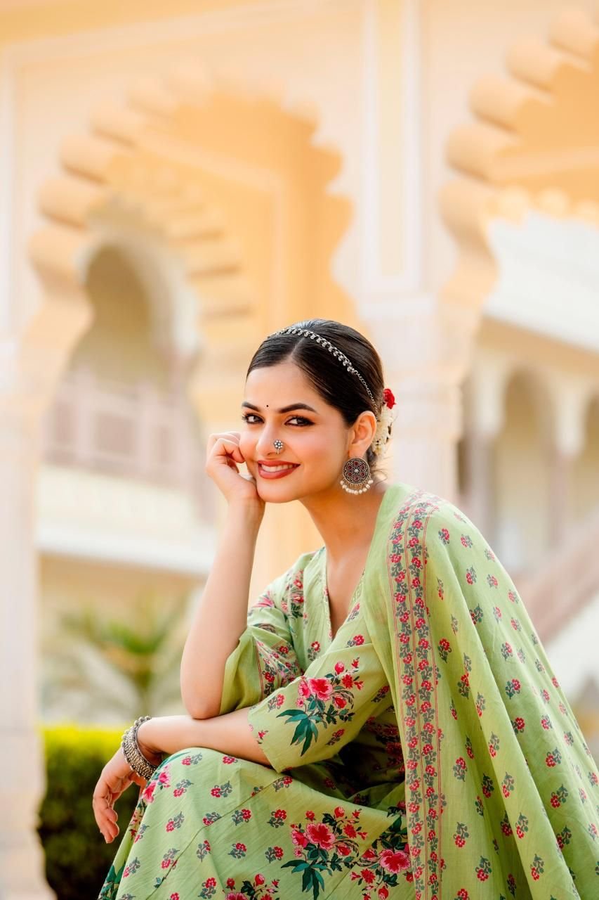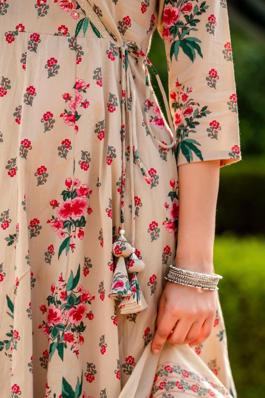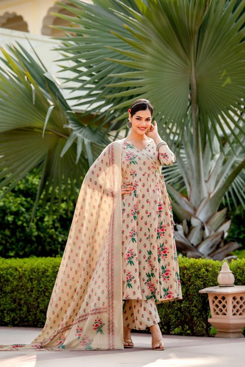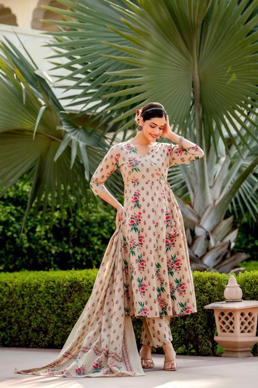 Designed in a classic Angrakha Anarkali pattern, the kurta features change work detailing and a beautifully flared 12-kali silhouette, creating elegant movement with every step. Perfect for festive gatherings, cultural events, and daytime celebrations, this ensemble brings timeless charm in soothing Pista and Beige tones.