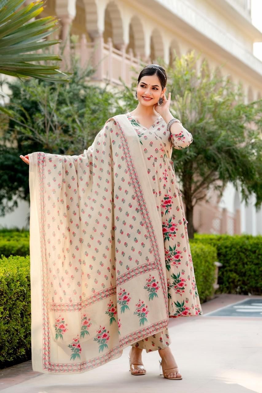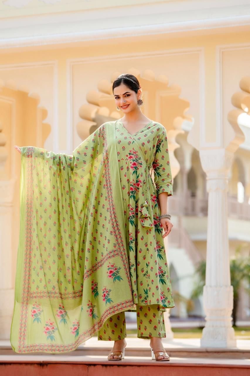The AK-014 Angrakha Anarkali 3PC Set is a graceful blend of traditional design and everyday comfort. Crafted from pure cotton fabric, this set ensures breathability while offering a rich ethnic appearance.