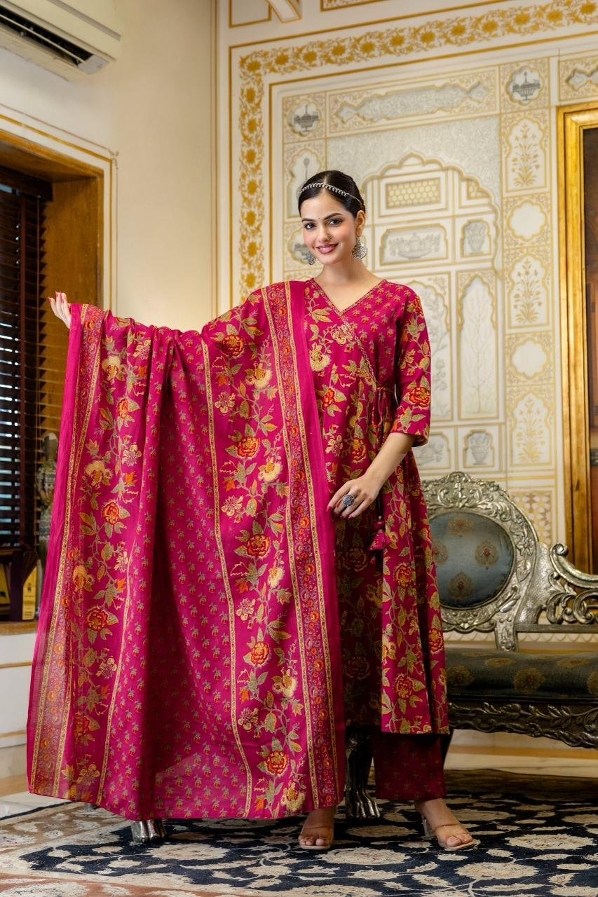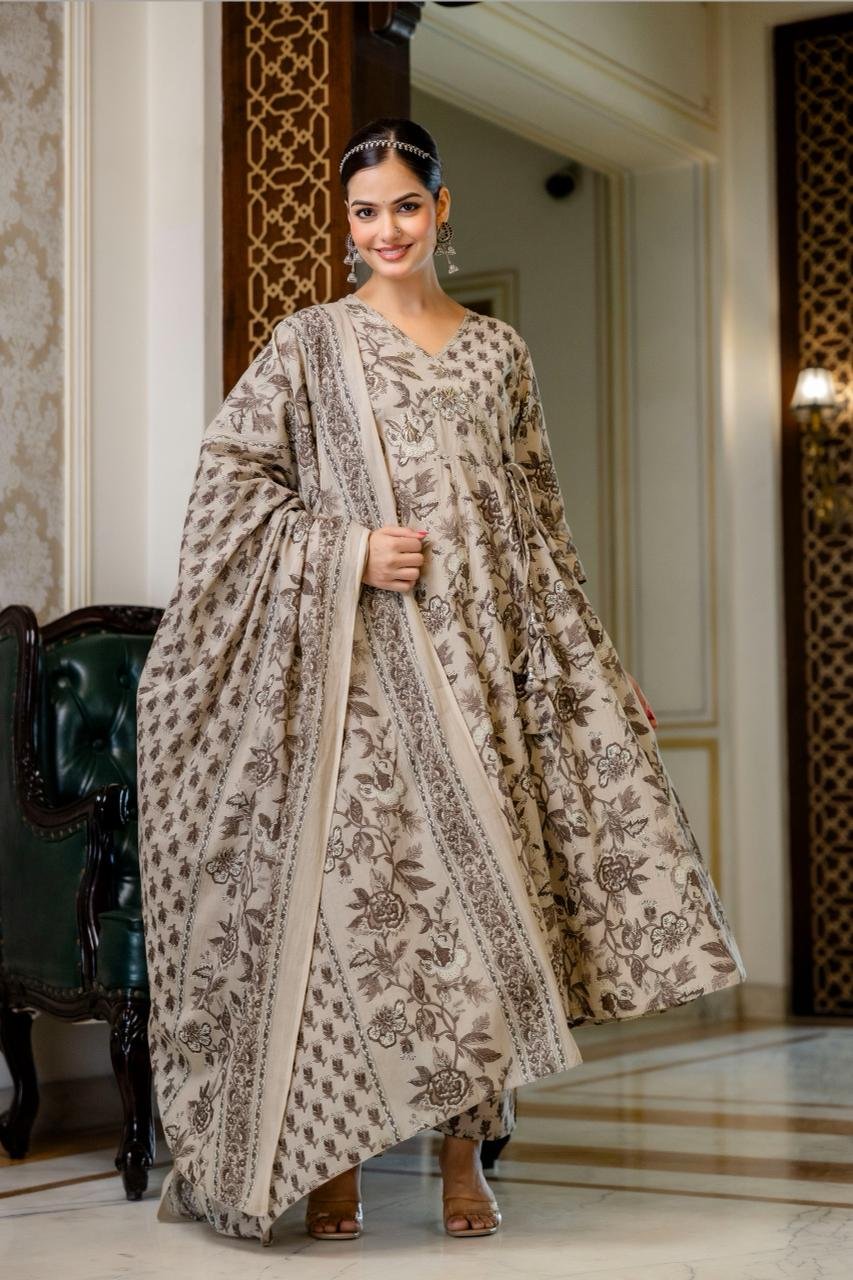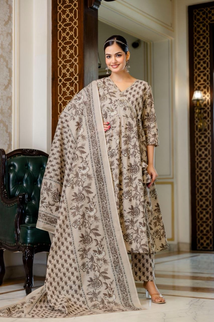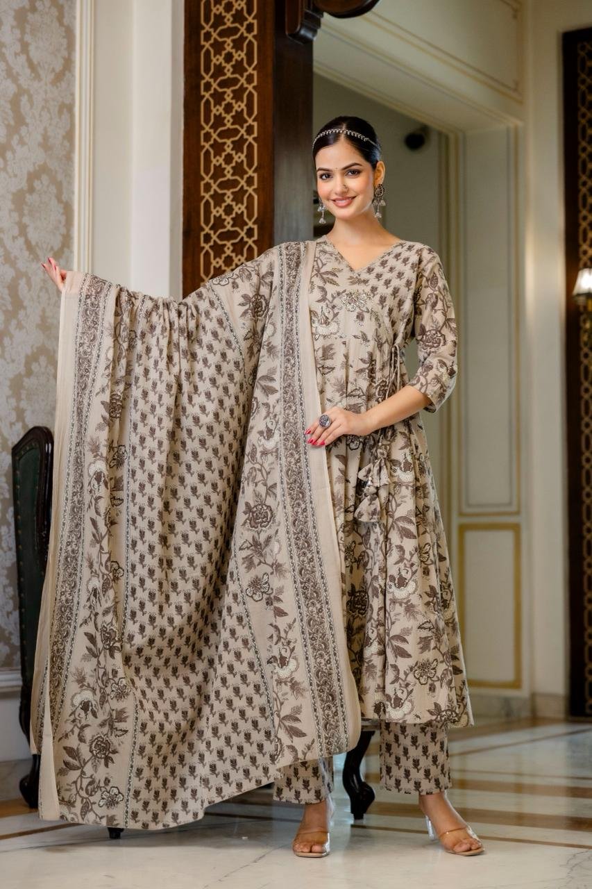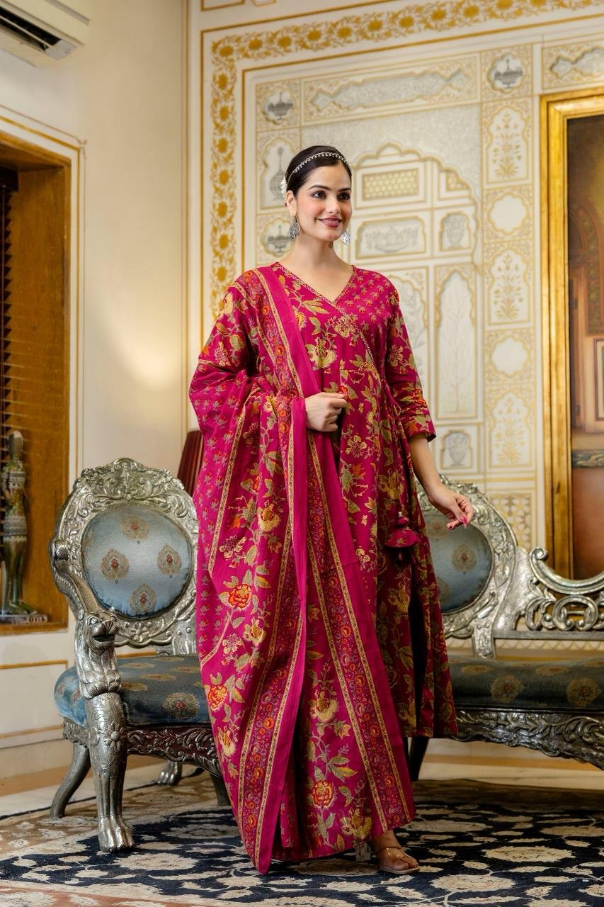 The AK-103 Angrakha Anarkali 3PC Set is designed for women who appreciate traditional elegance blended with comfort. Crafted from pure cotton fabric, this ensemble ensures breathability and ease, making it suitable for long hours of wear.