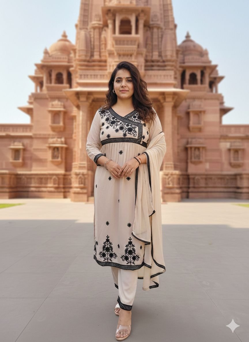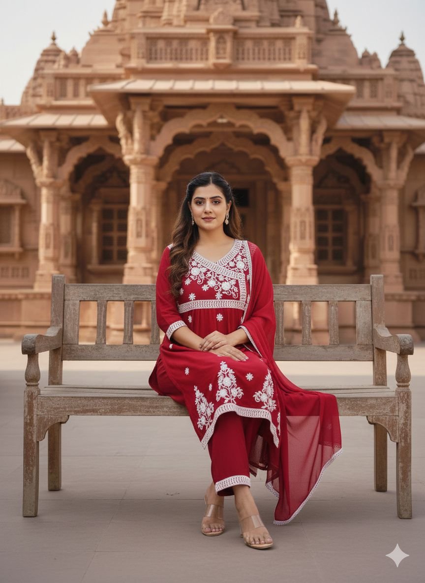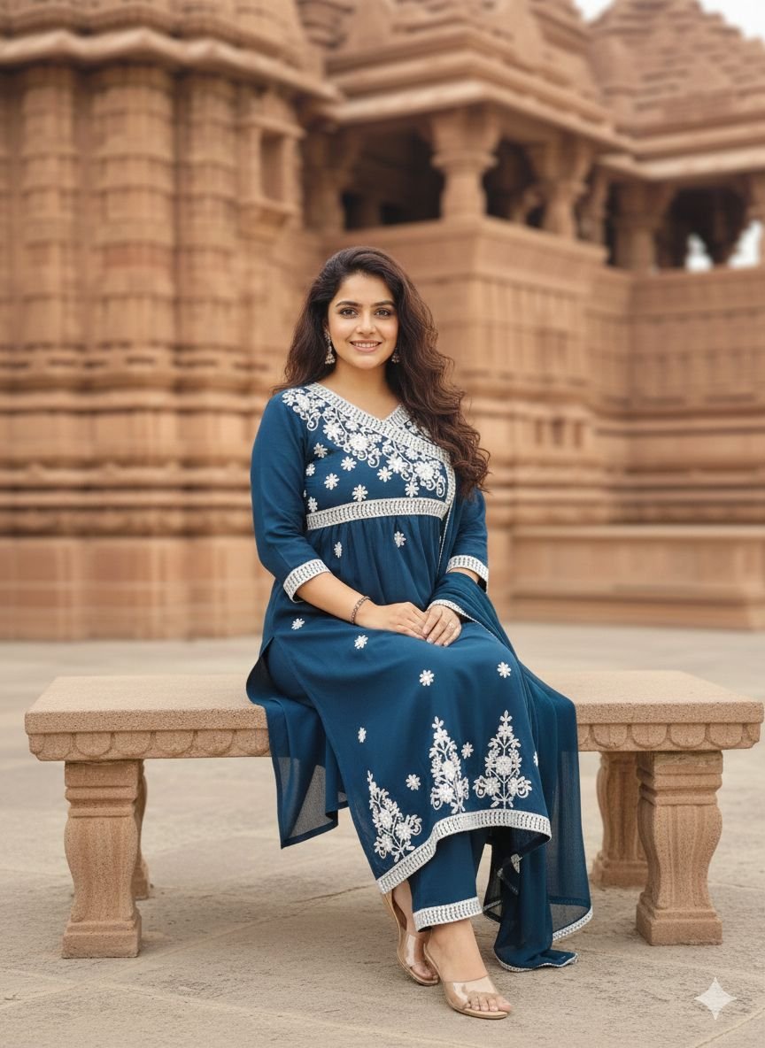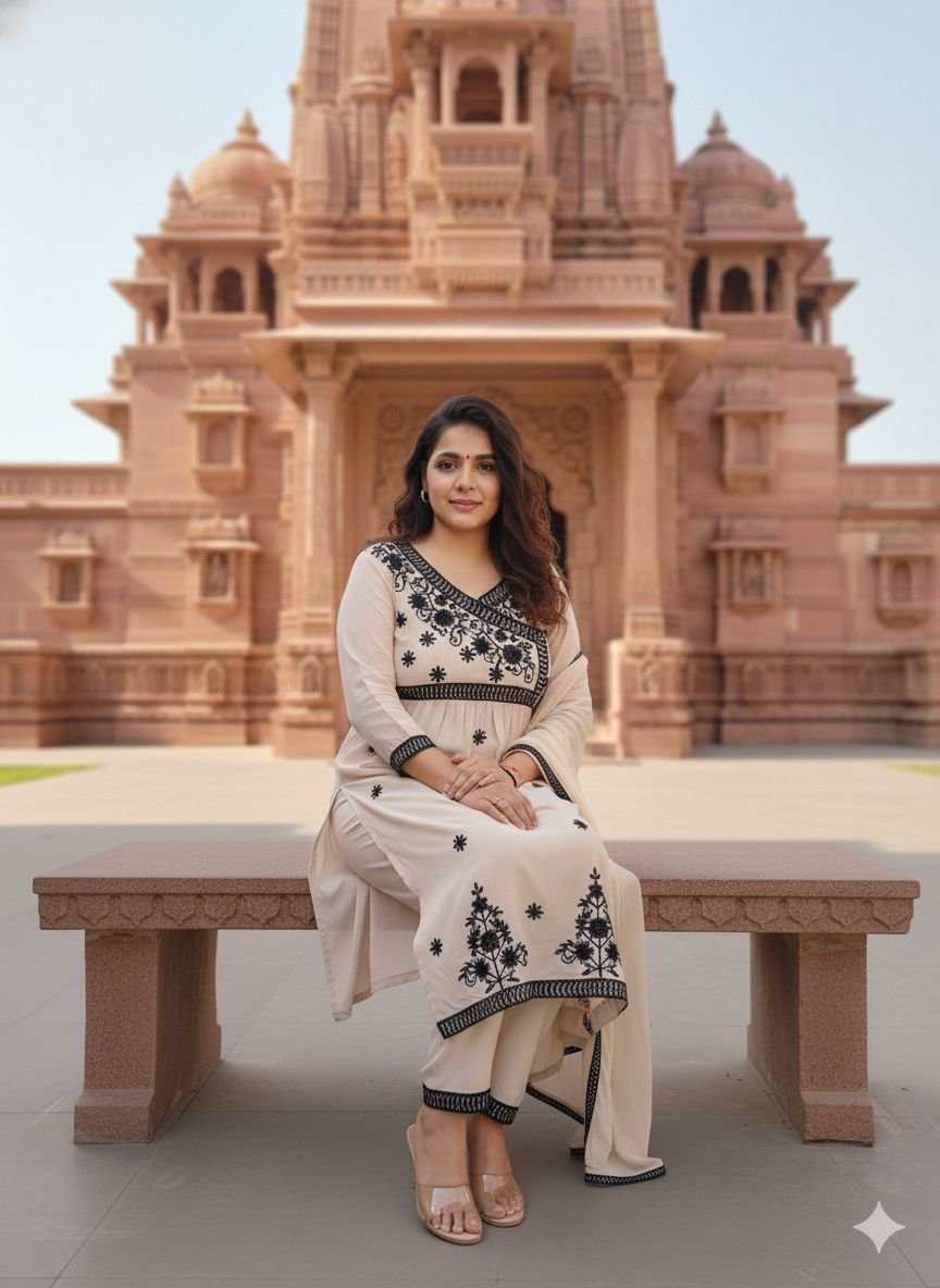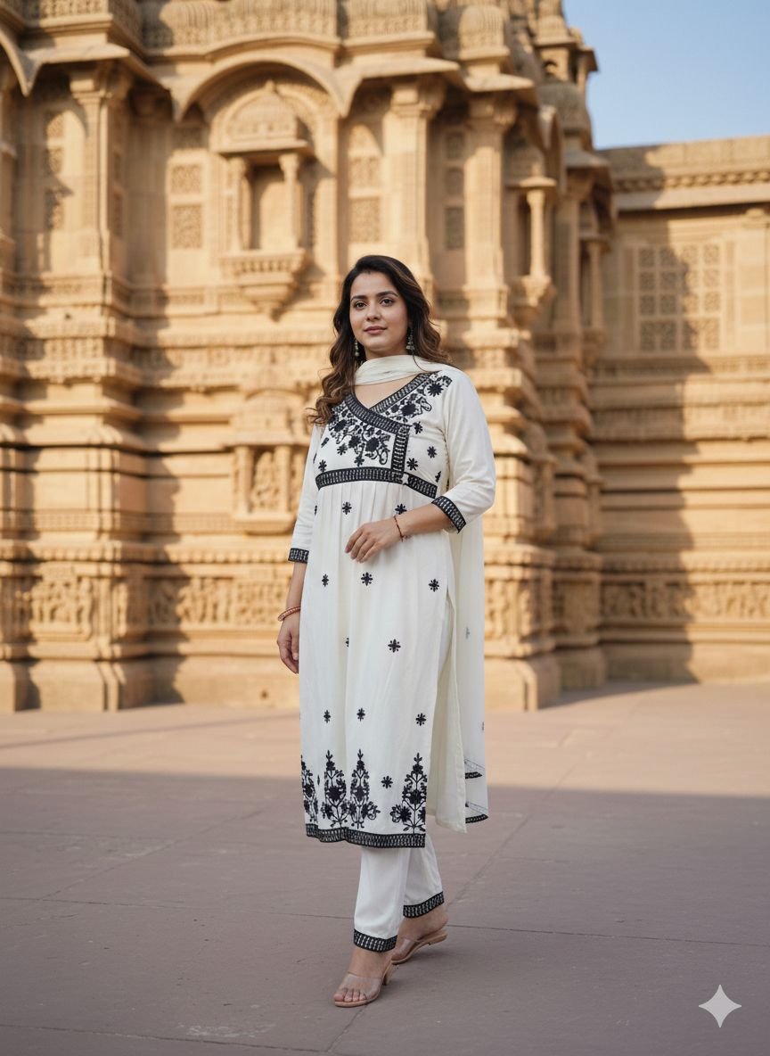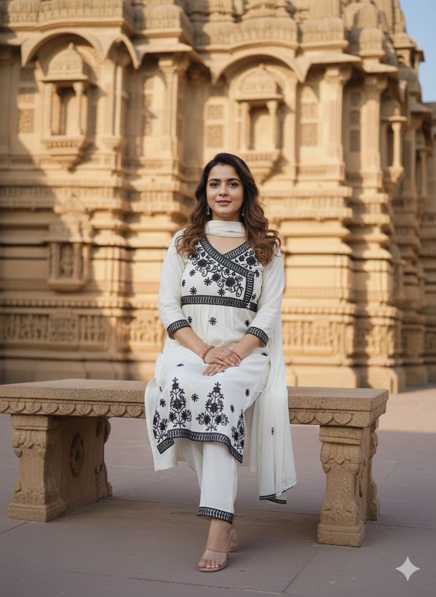 The Angrakha-style kurta is beautifully adorned with delicate Chikankari embroidery, adding a graceful handcrafted appeal. Designed for versatility, this suit set is ideal for office wear, festive daytime events, family gatherings, and elegant ethnic styling. Available in a rich palette of classic and earthy shades, it suits all age groups effortlessly.