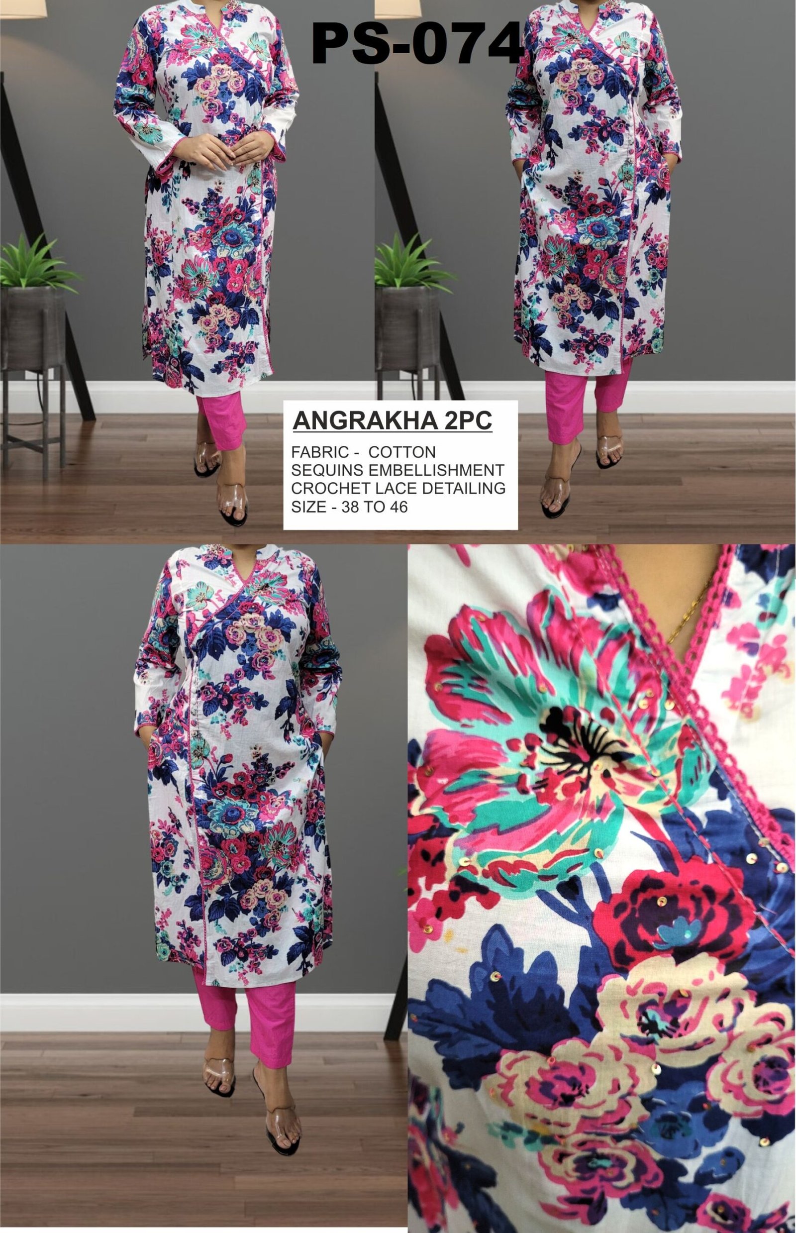 PS-074 is a beautifully designed Angrakha-style cotton set that blends traditional silhouettes with delicate embellishments. Sequins add a subtle shimmer, while crochet lace detailing enhances the handcrafted charm. Comfortable yet elegant, this set is ideal for festive daywear, cultural events, and graceful everyday styling.