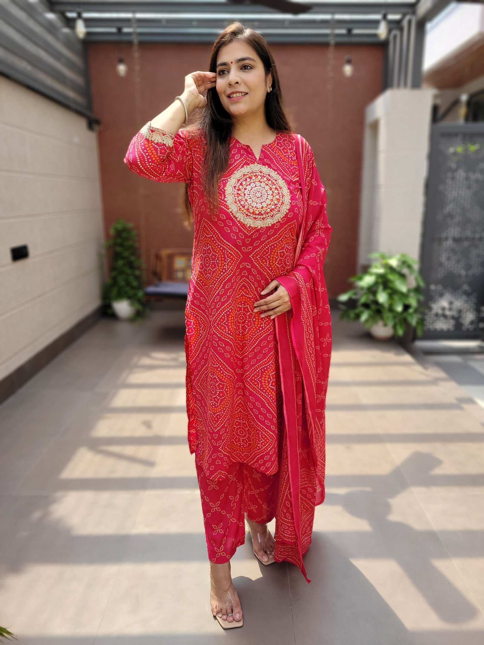Designed for women who appreciate traditional craftsmanship, comfort, and elegance, this Bandhej set is perfect for making a memorable impression while enjoying ease of wear and versatile styling options.
