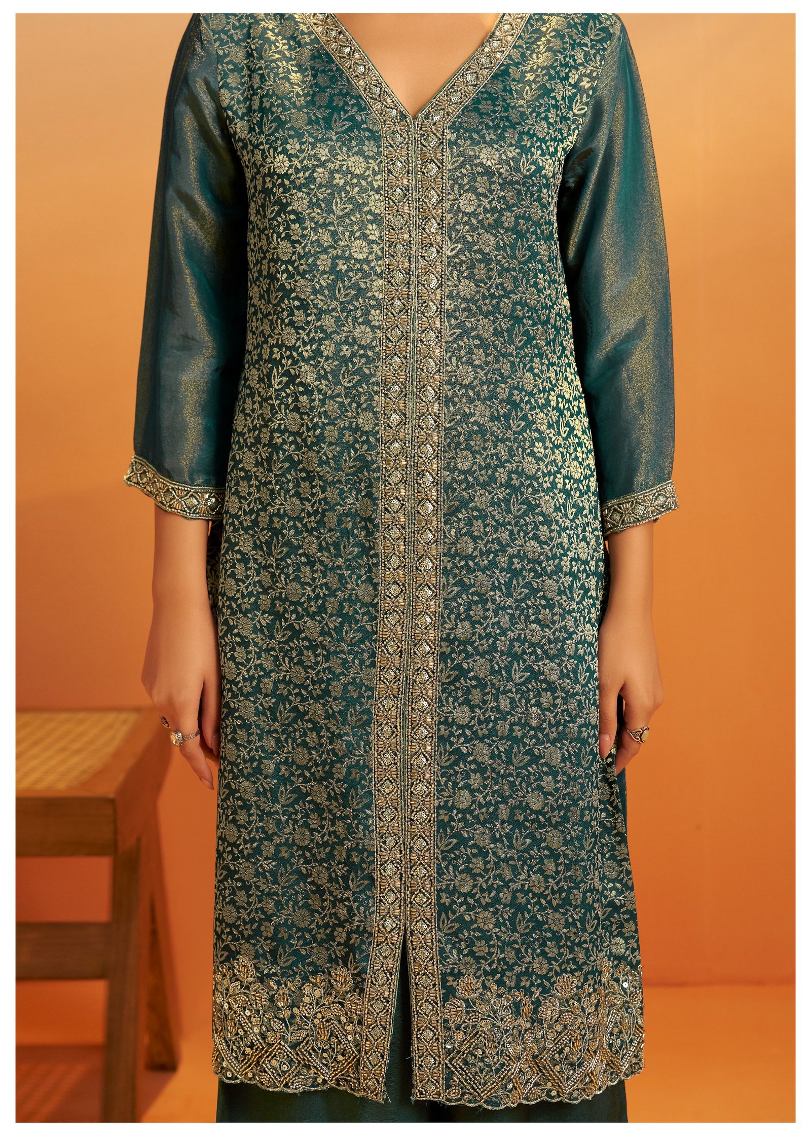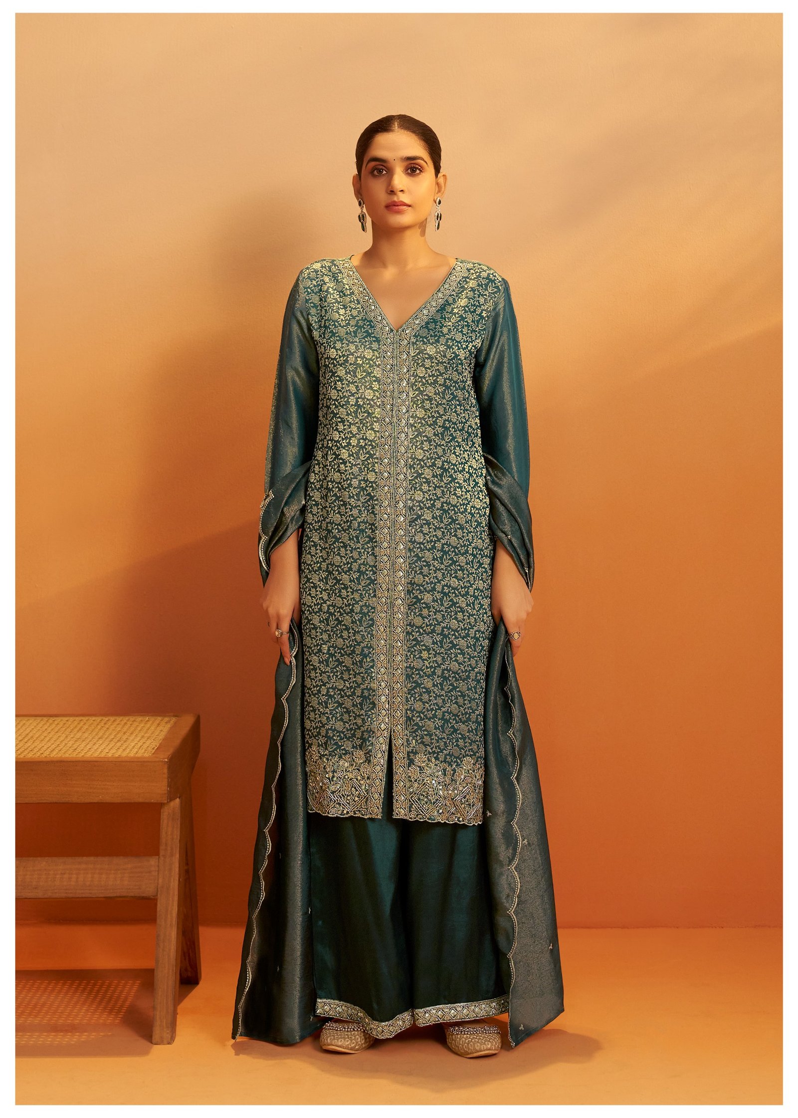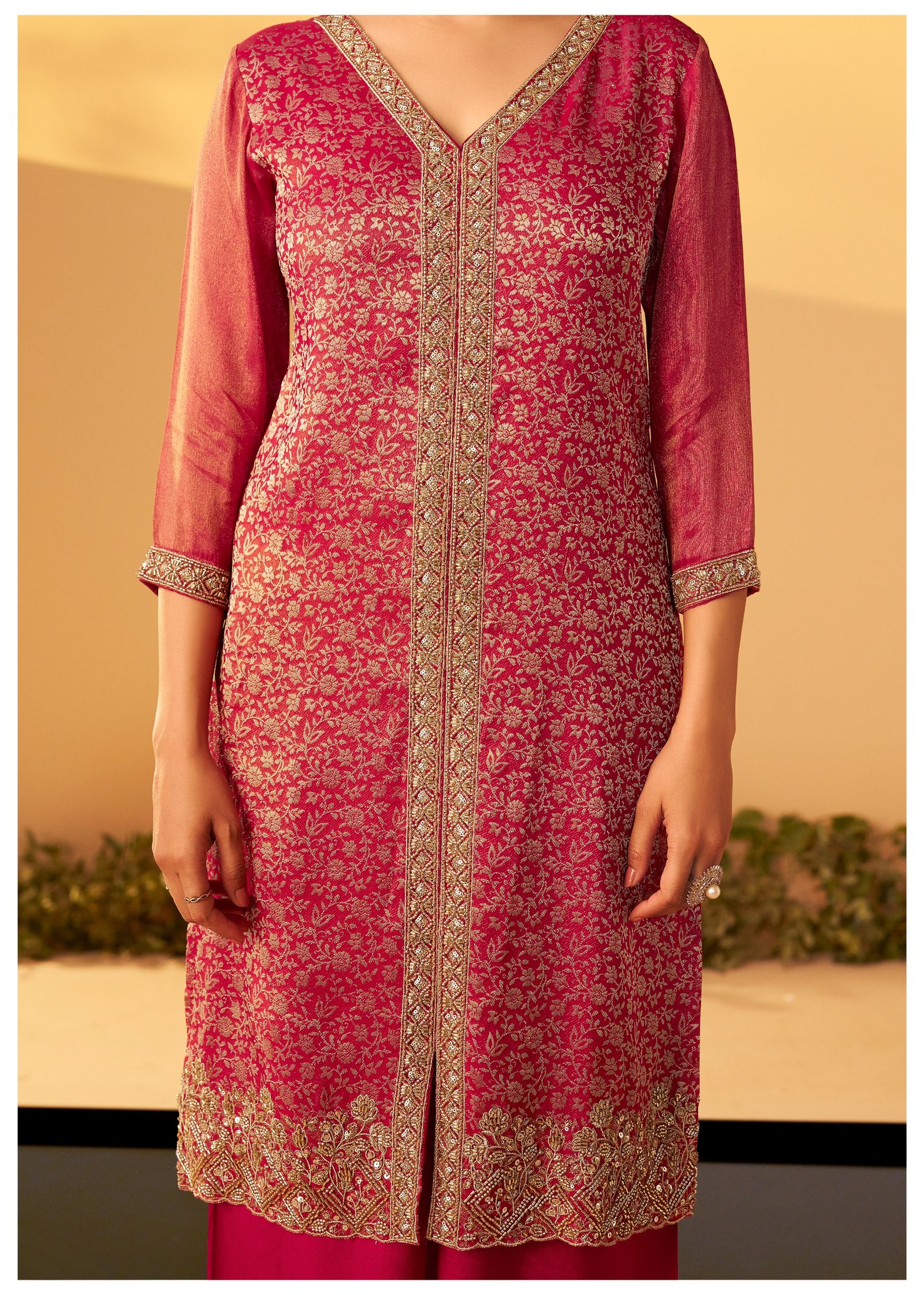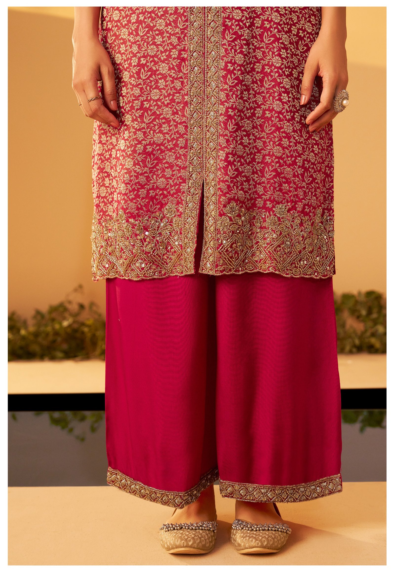 Paired with a matching palazzo adorned with beadwork, this set offers a regal and glamorous look for festive evenings and special events.