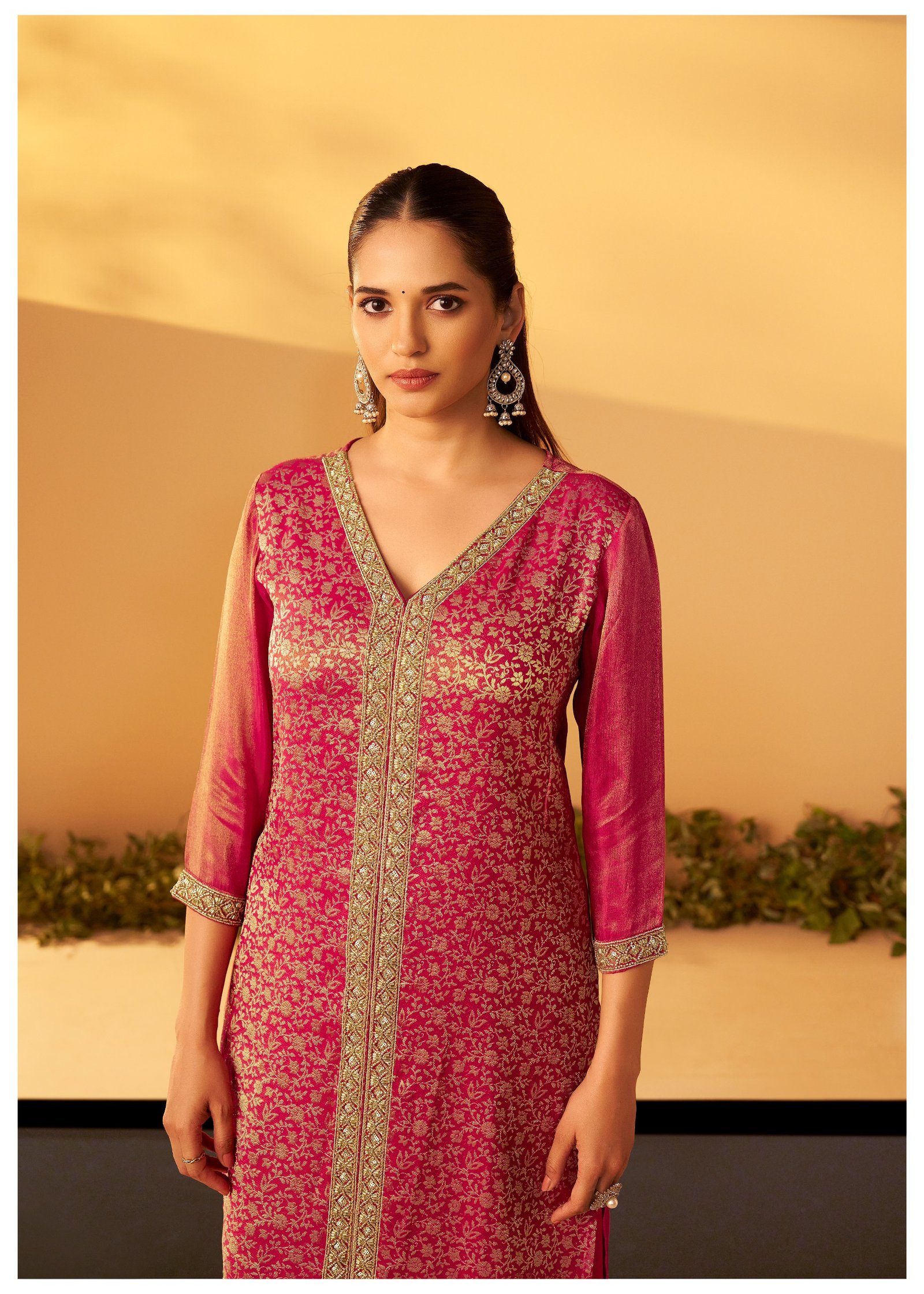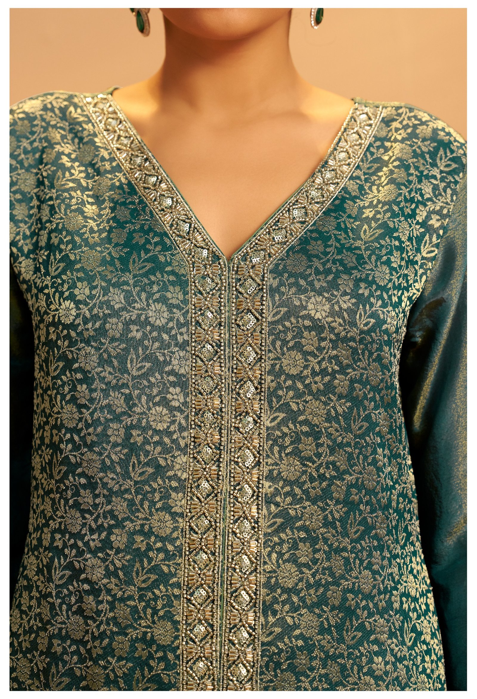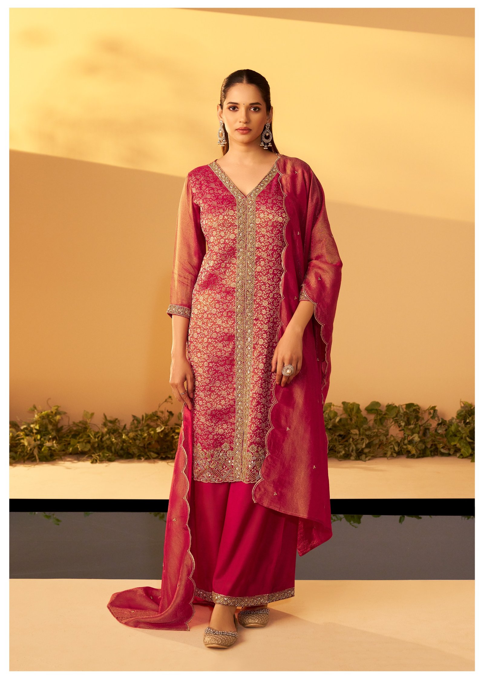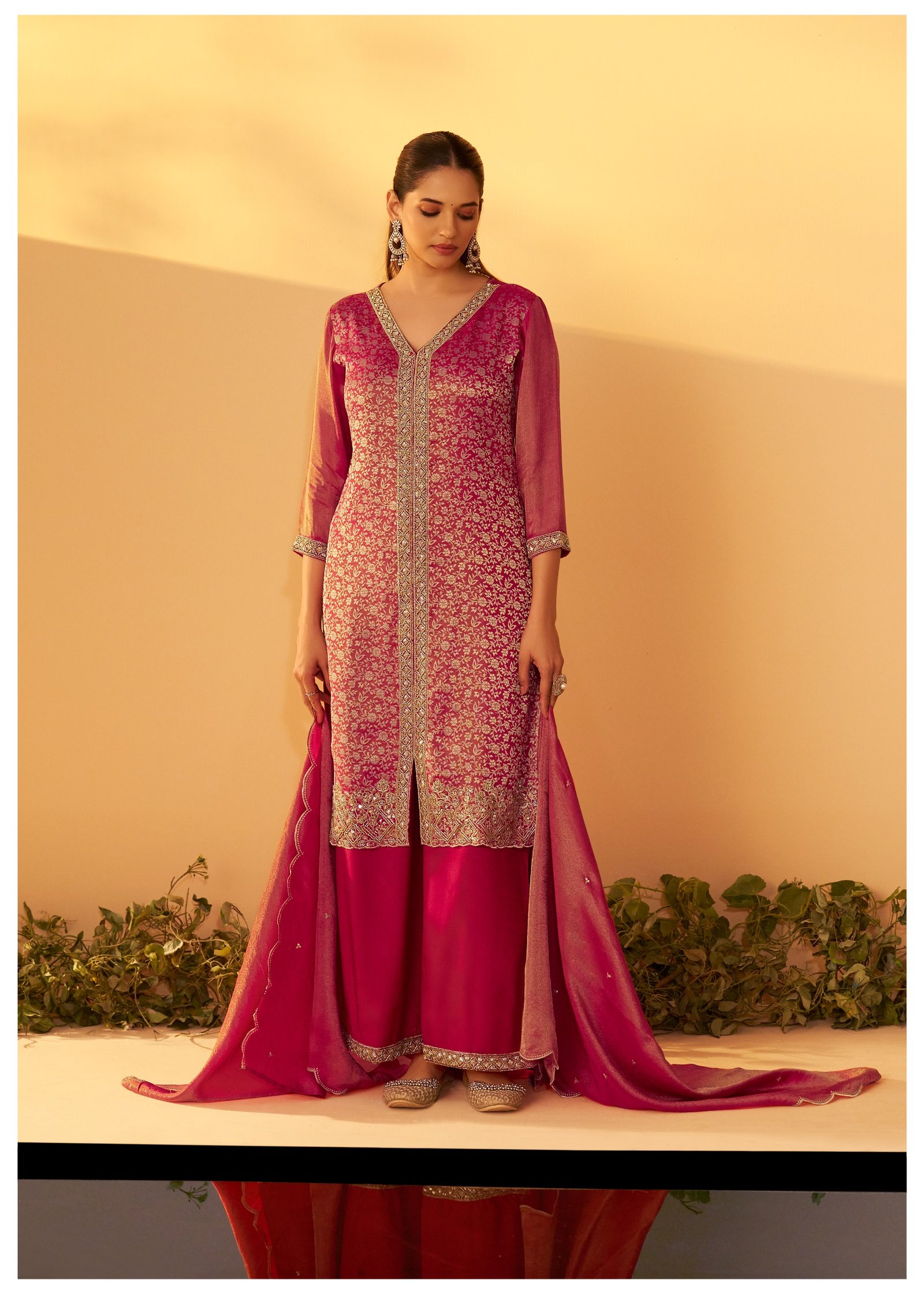 Paired with a matching palazzo adorned with beadwork, this set offers a regal and glamorous look for festive evenings and special events.