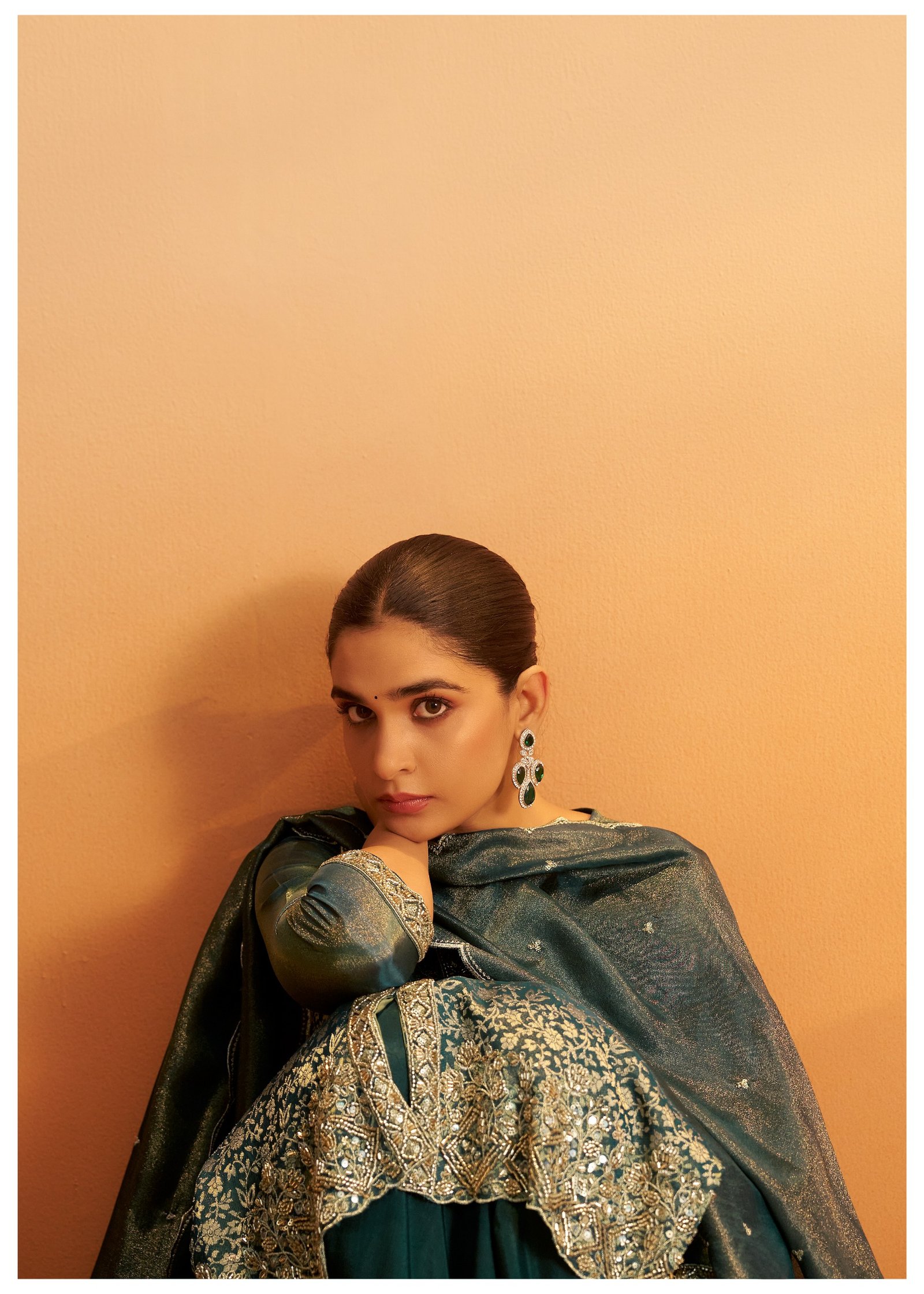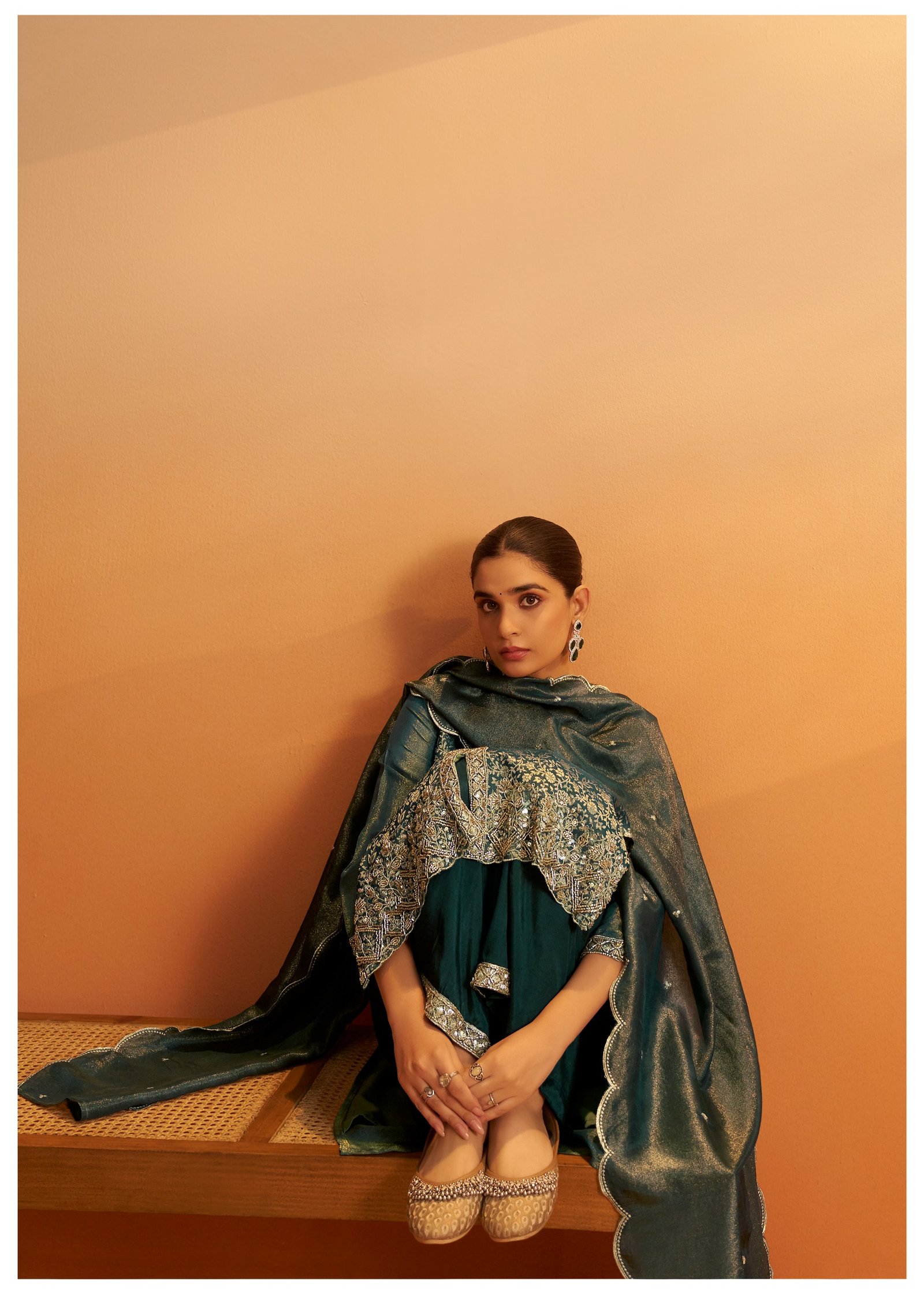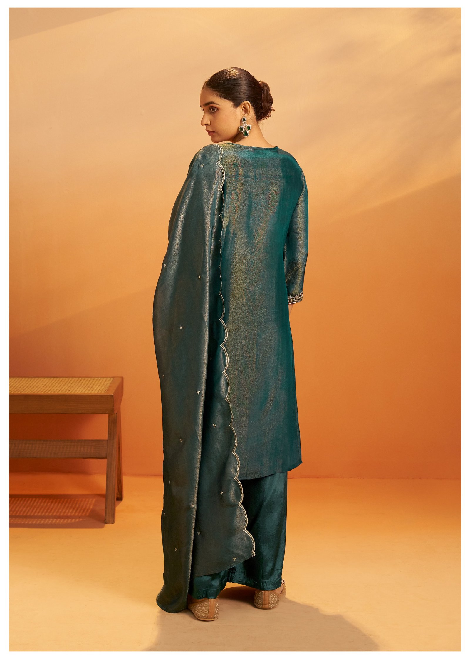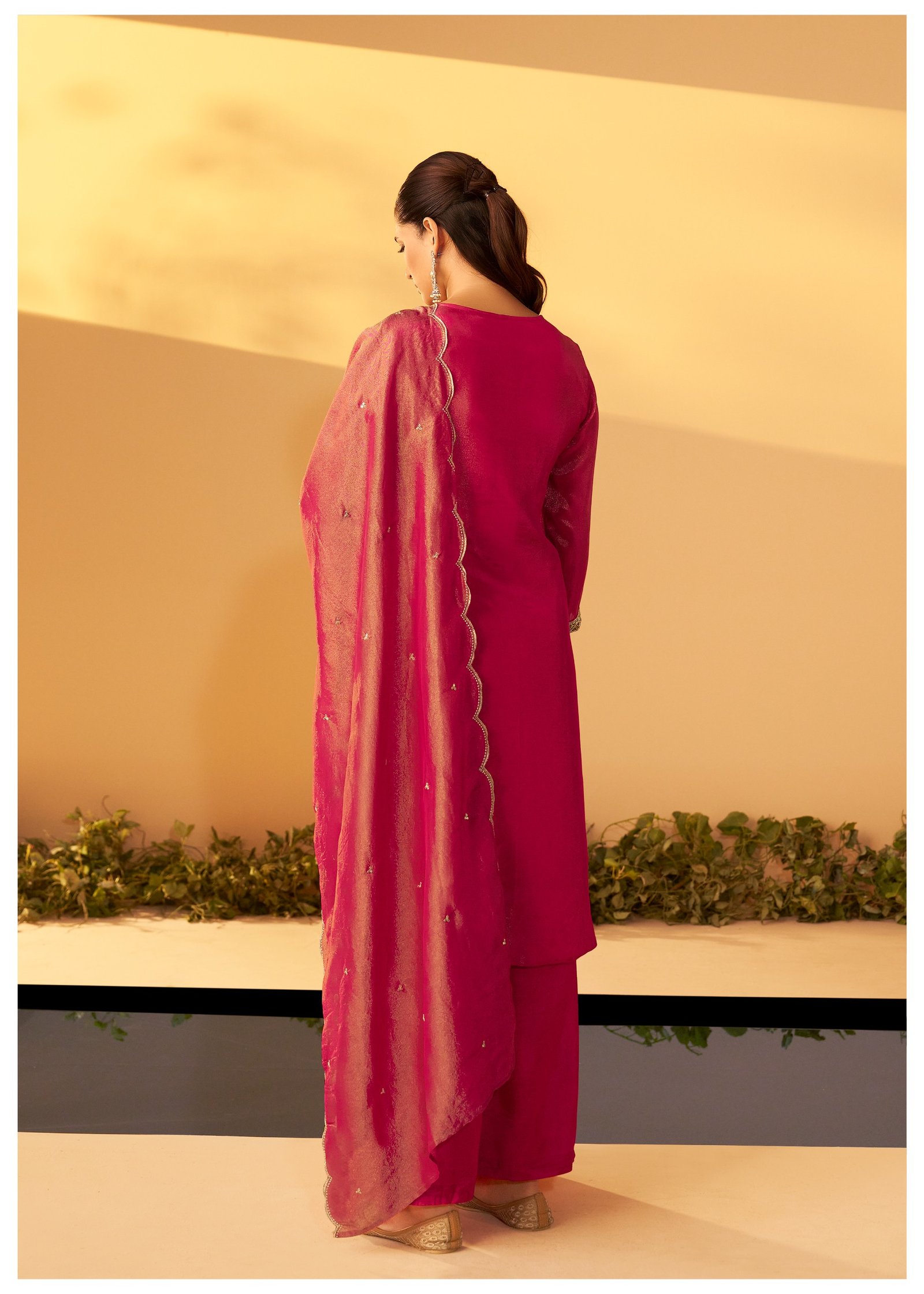Paired with a matching palazzo adorned with beadwork, this set offers a regal and glamorous look for festive evenings and special events.