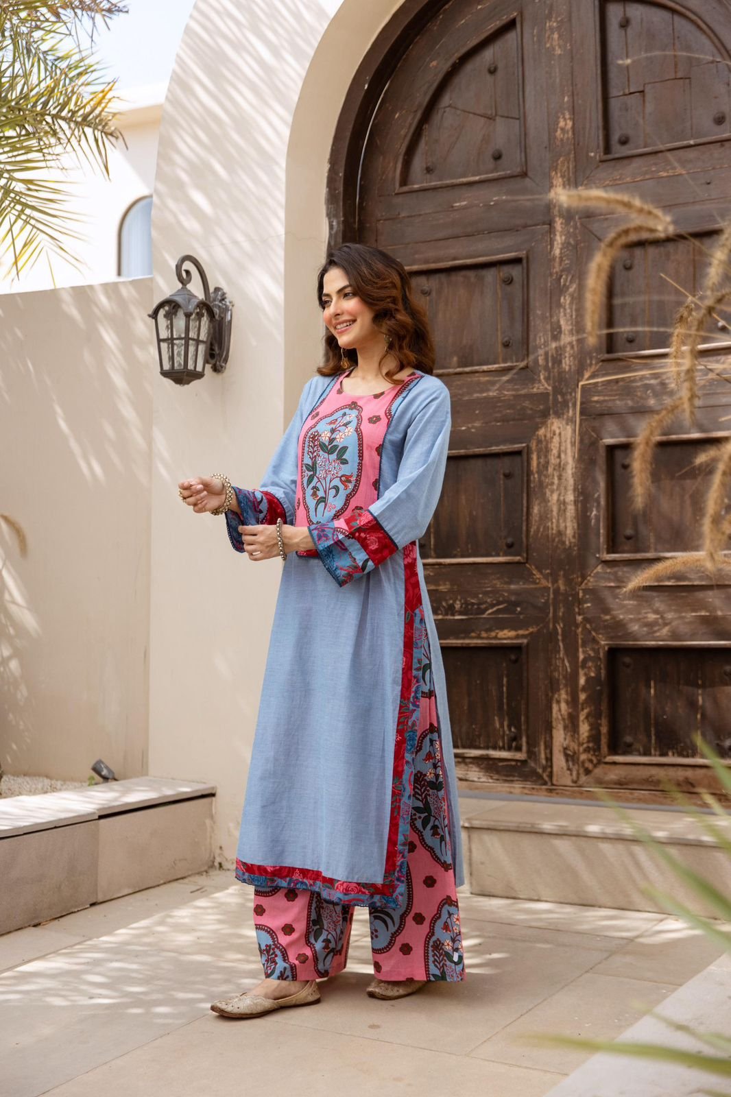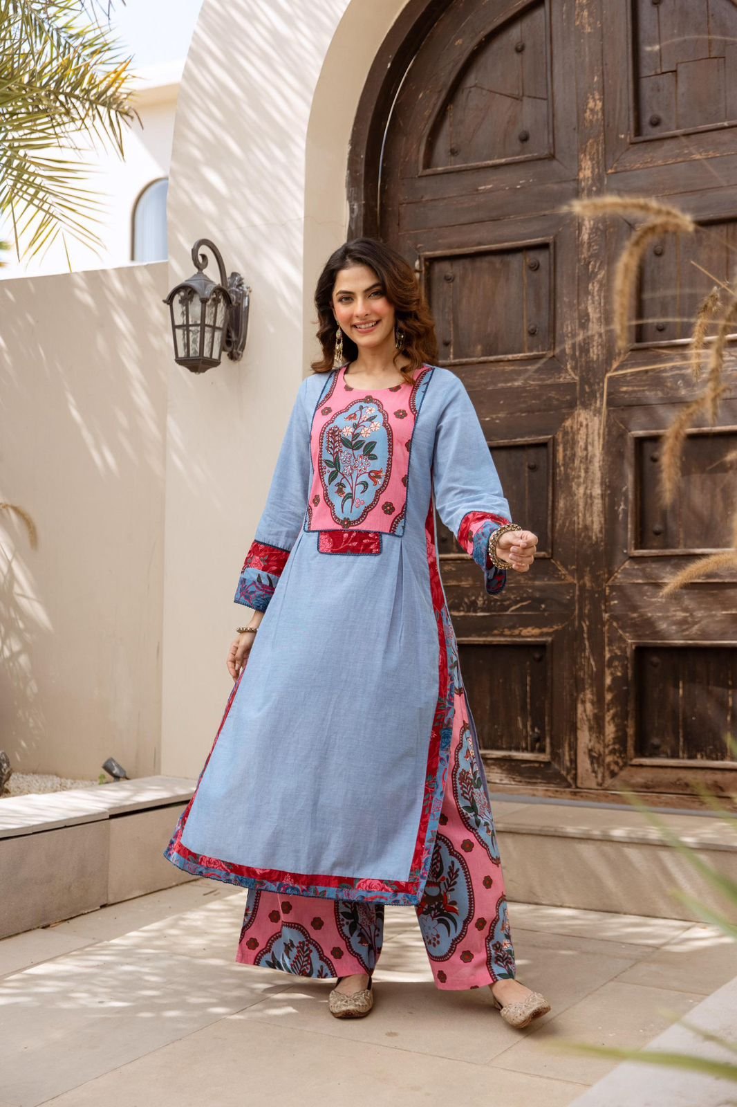 The kurta features delicate handwork on the yoke, paired with a printed palazzo for a coordinated modern ethnic look. Perfect for daily wear, office outfits, and casual outings.