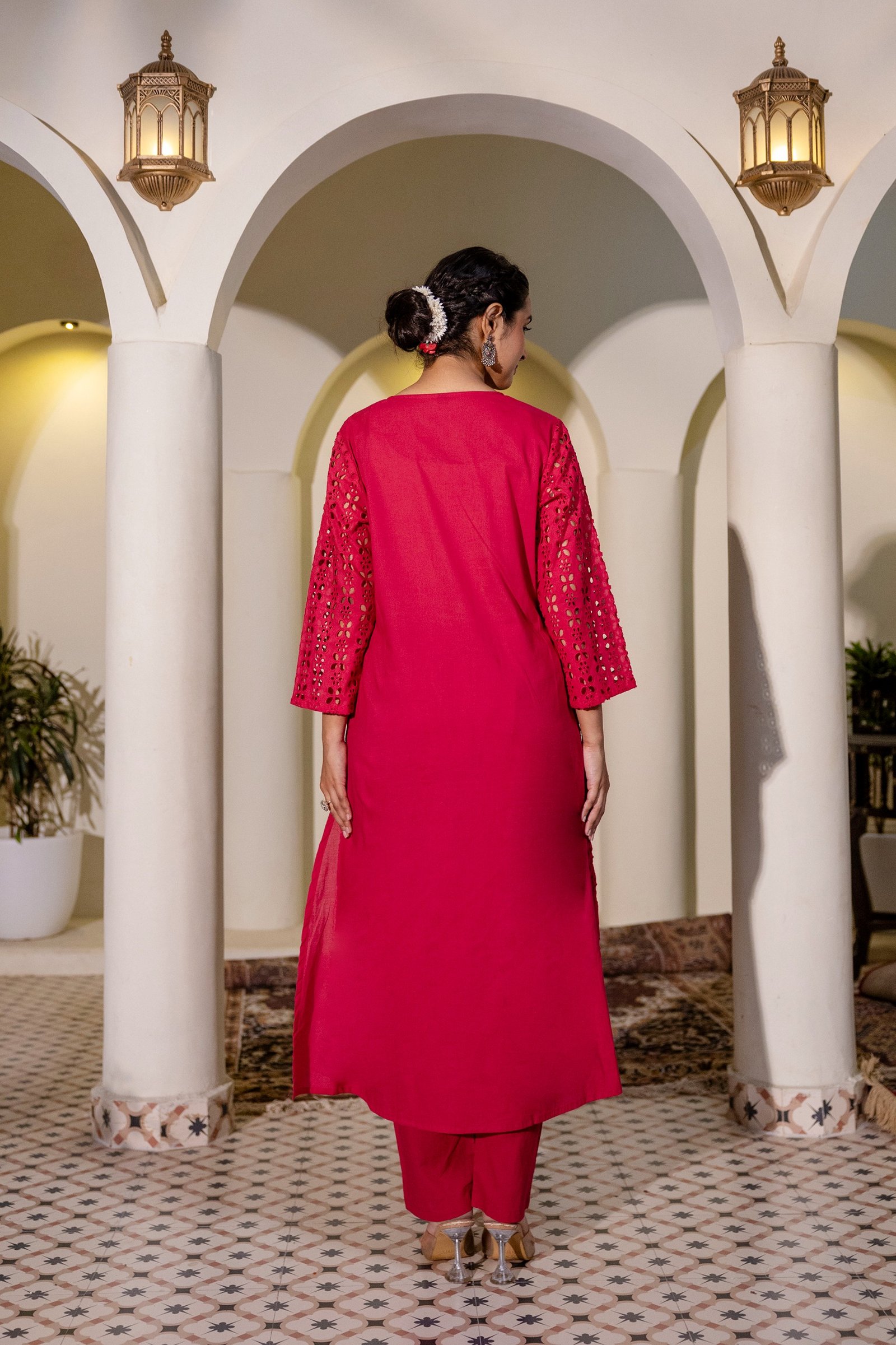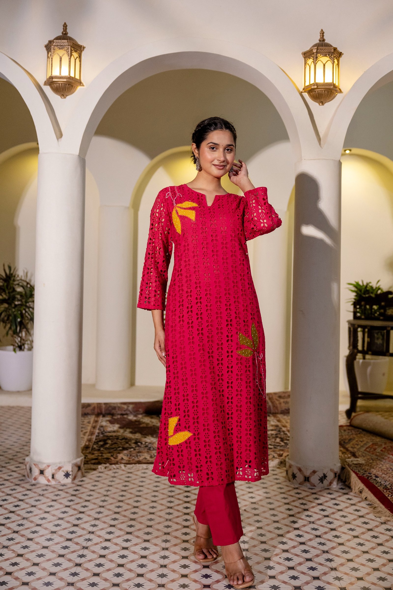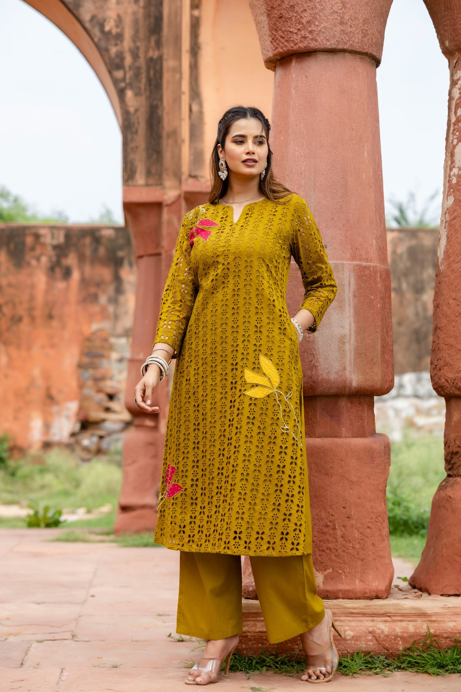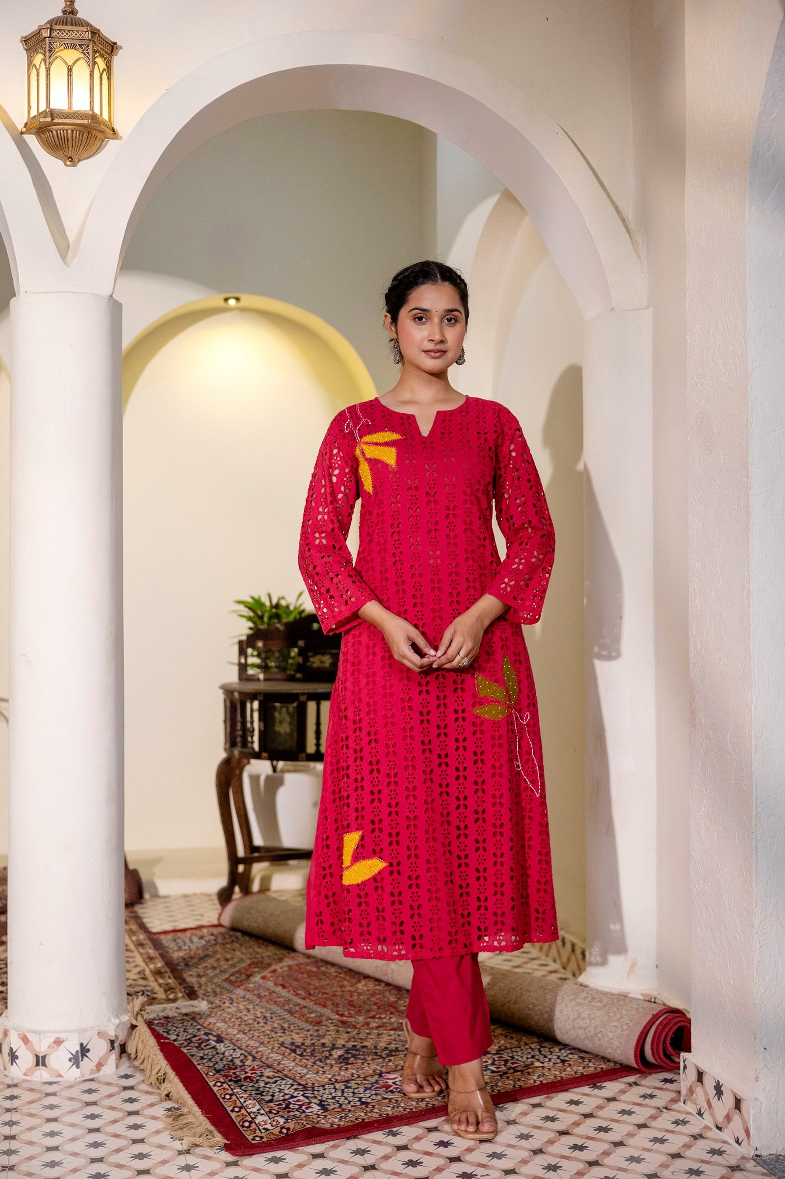 The PS-115 Chikankari Schifli Palazzo Set is crafted from soft, breathable cotton, ensuring comfort throughout the day. The kurta features intricate Chikankari and Schifli appliqué work enhanced with subtle bead accents, reflecting timeless Indian craftsmanship.