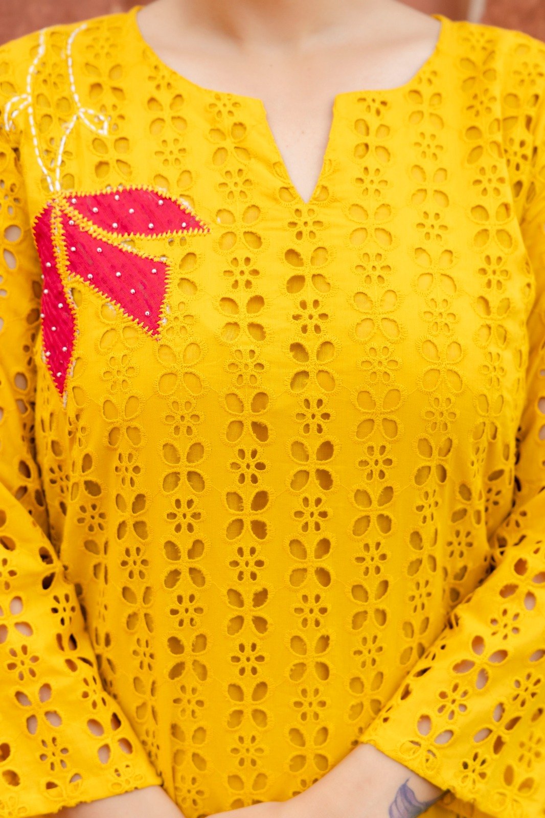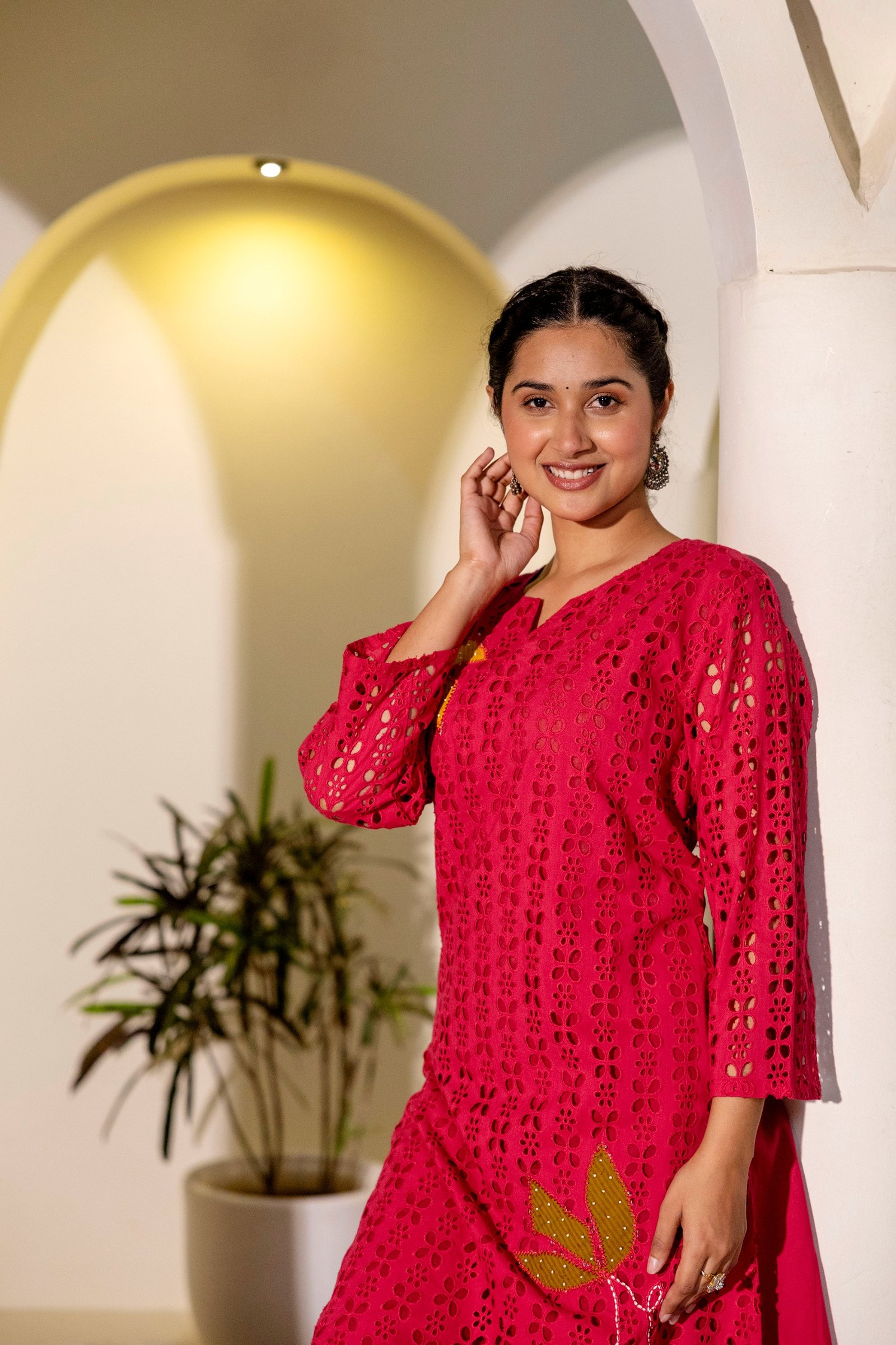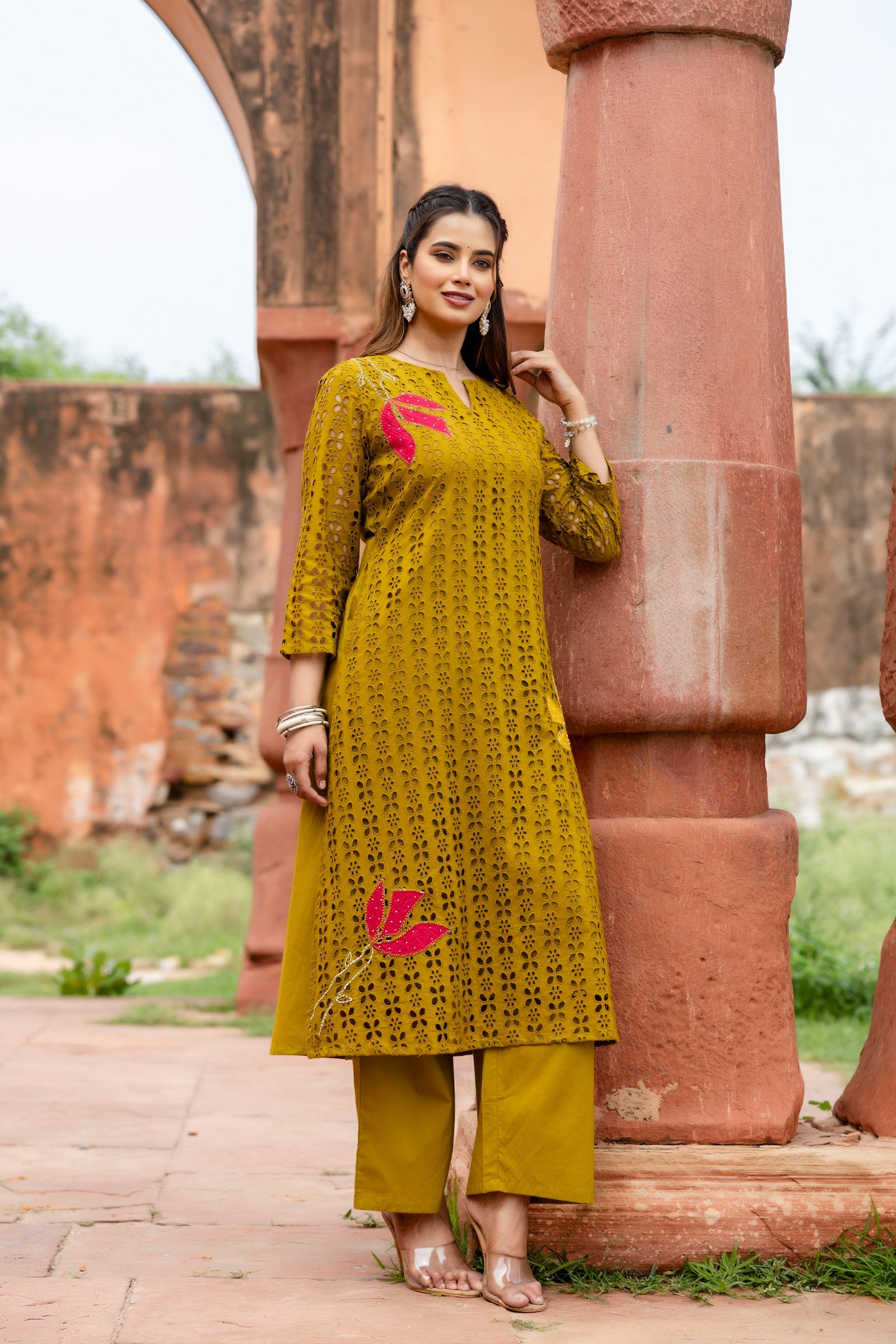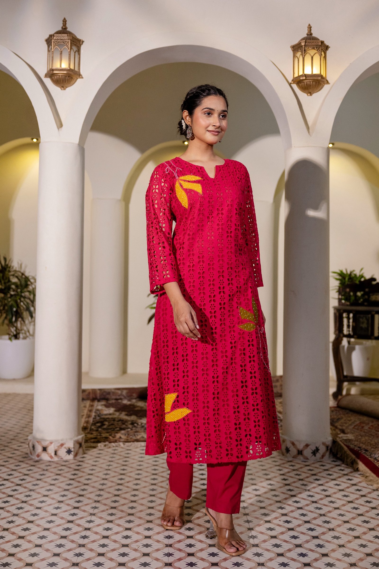 The PS-115 Chikankari Schifli Palazzo Set is crafted from soft, breathable cotton, ensuring comfort throughout the day. The kurta features intricate Chikankari and Schifli appliqué work enhanced with subtle bead accents, reflecting timeless Indian craftsmanship.