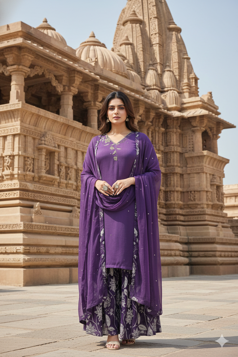 The GS-030 Garara 3PC Set is crafted from pure Chinon fabric, offering a graceful flow and luxurious feel. Featuring heavy handwork, this ensemble is perfect for weddings, festive functions, and traditional celebrations.