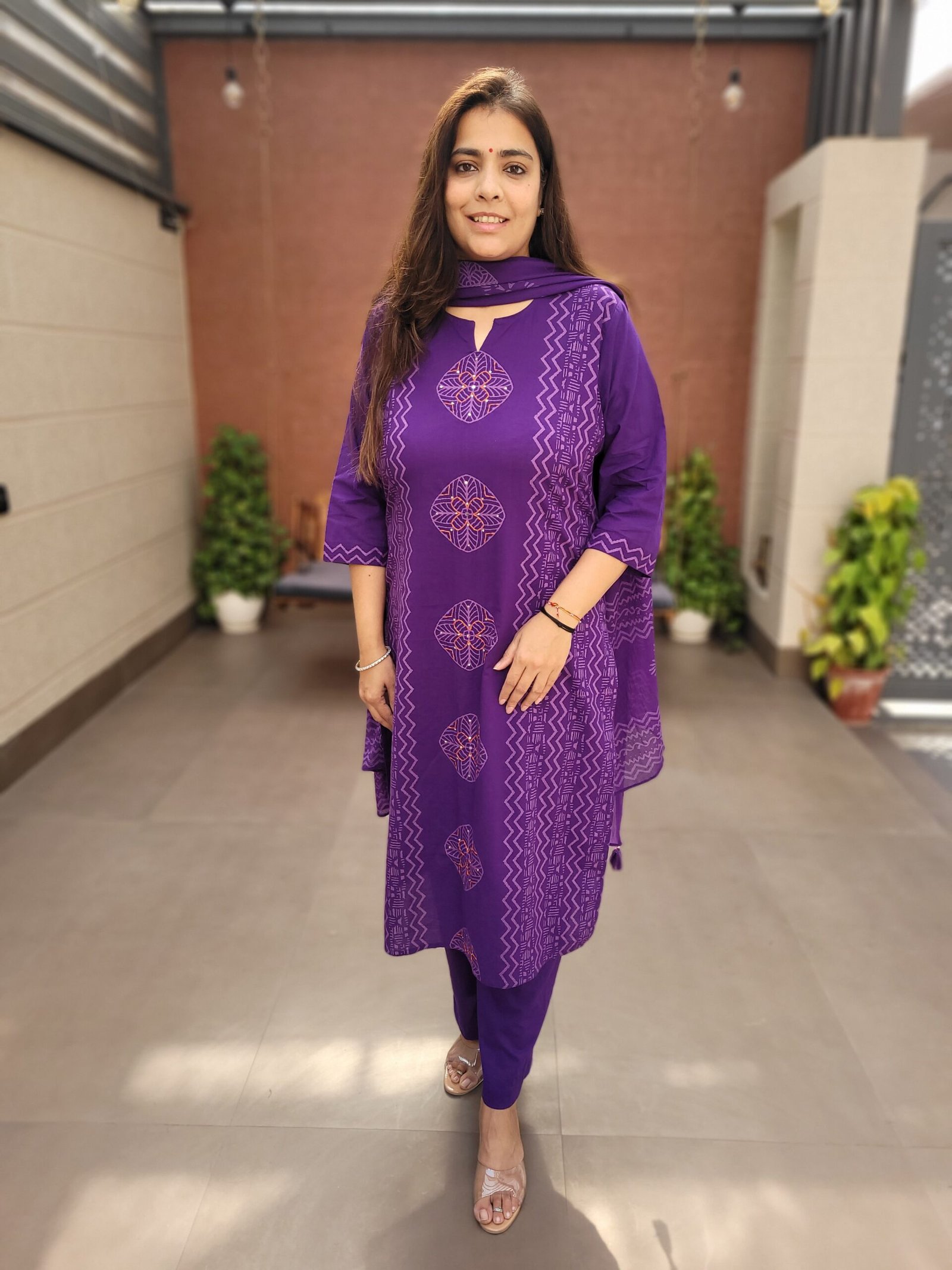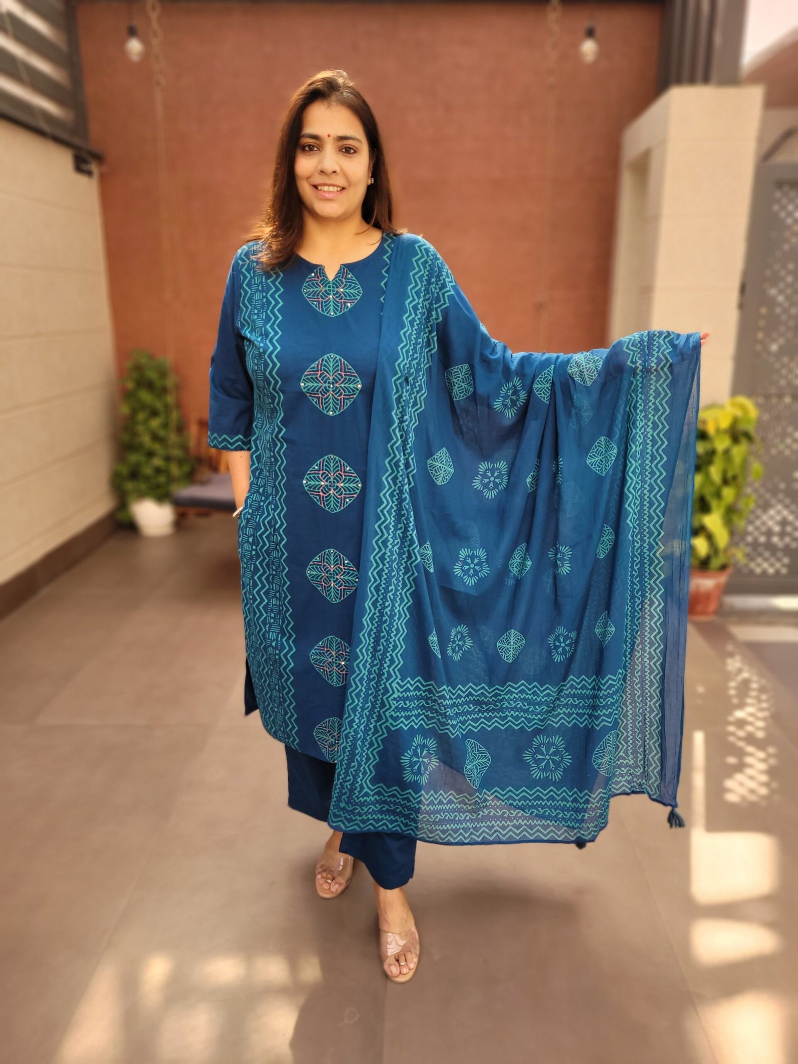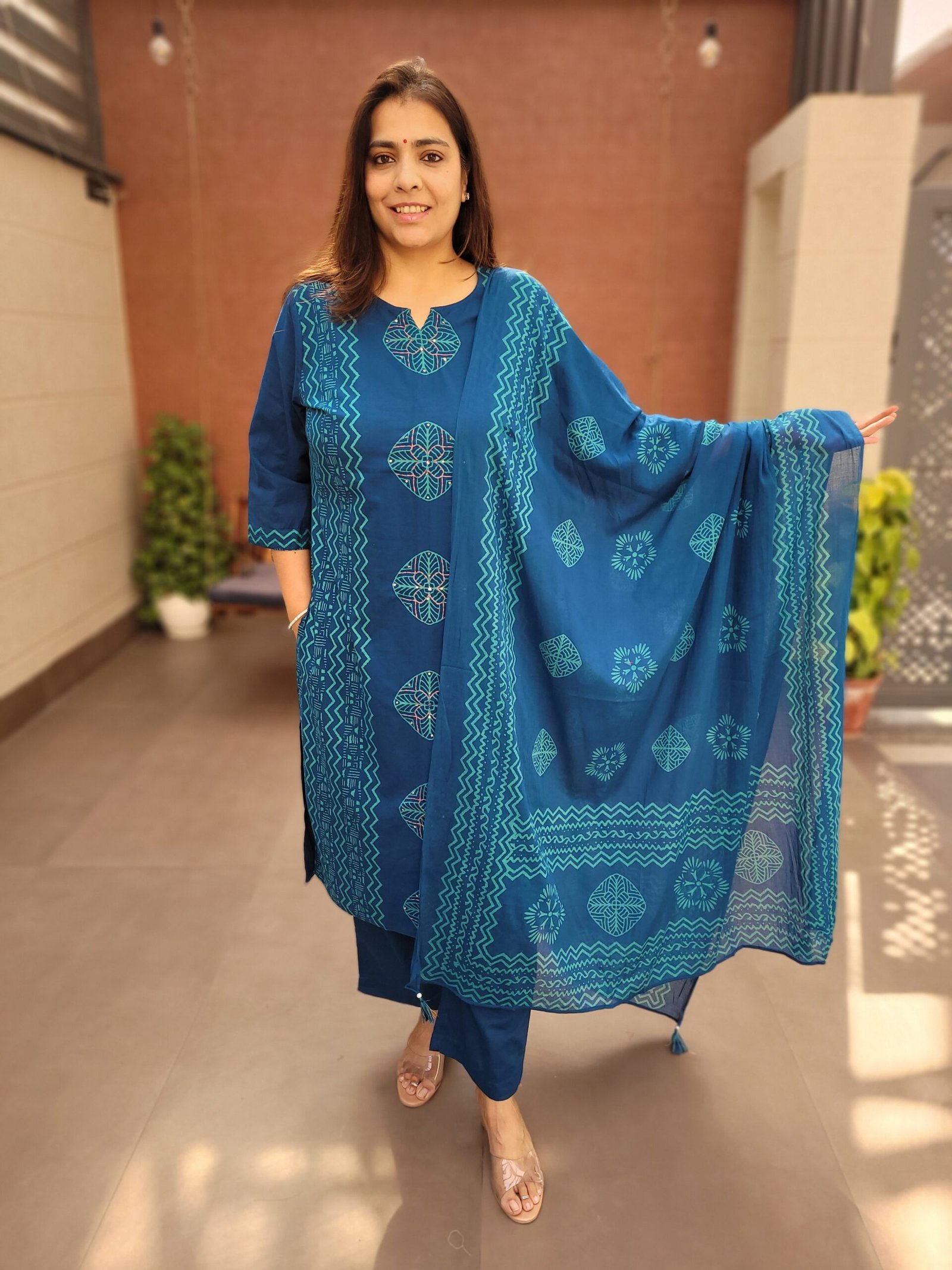 The kurta is enhanced with handwork on the front panel, adding subtle ethnic charm, while the full cotton dupatta completes the look with effortless grace. Perfect for daily wear, office styling, and relaxed ethnic occasions, this suit set combines simplicity with refined craftsmanship.