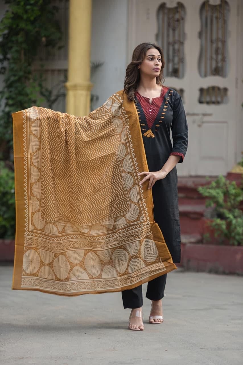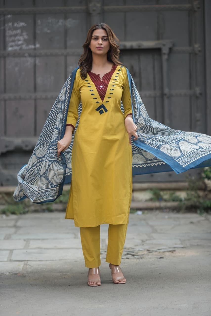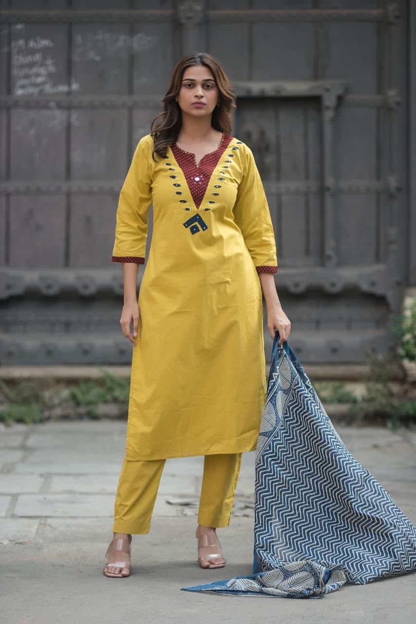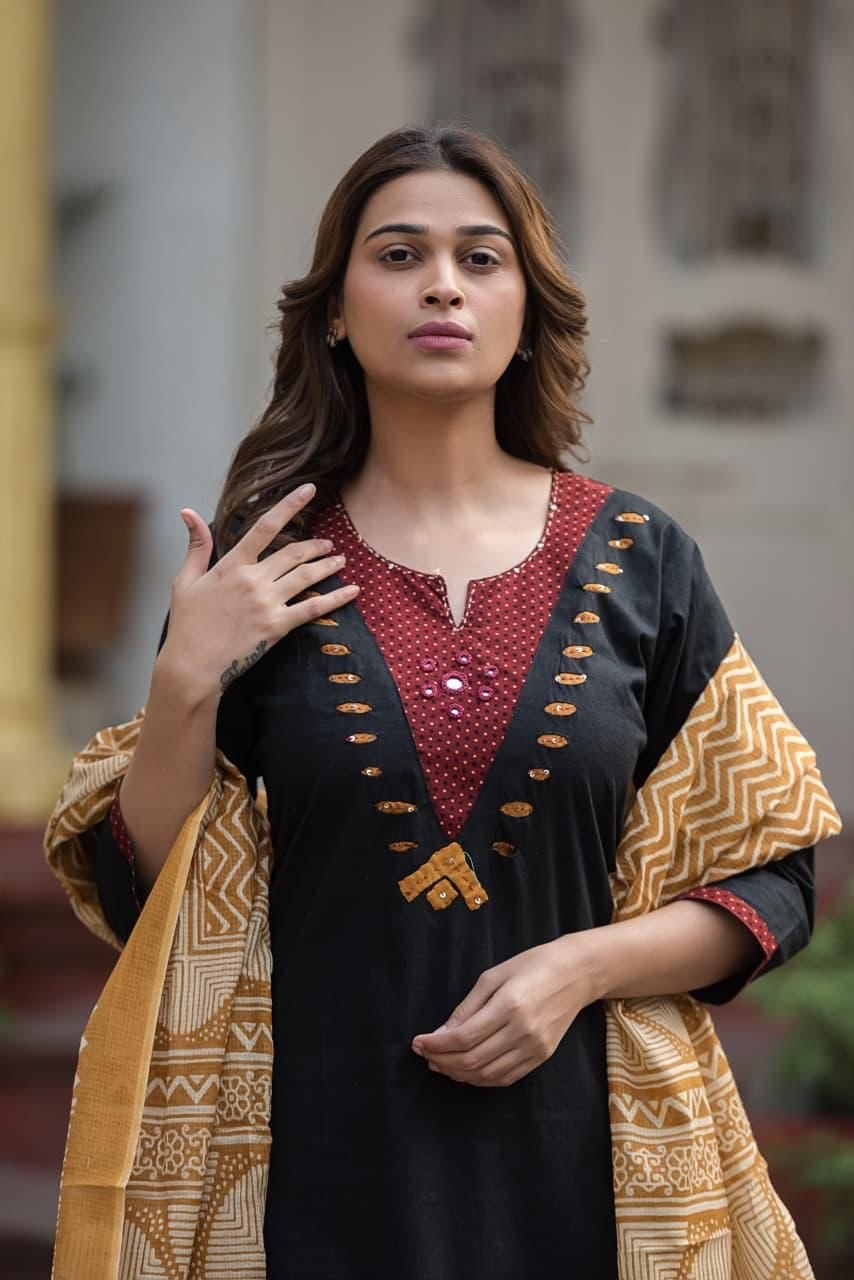 The DU-138 Cotton 3PC Set is a blend of tradition, elegance, and comfort—crafted for women who appreciate detailed artistry in everyday ethnic wear. The kurta is made from 100% pure cotton, making it breathable, skin-friendly, and ideal for all seasons. The highlight of the set is its exquisite applique detailing paired with authentic mirror work, adding a festive radiance without overwhelming the simplicity of the outfit.