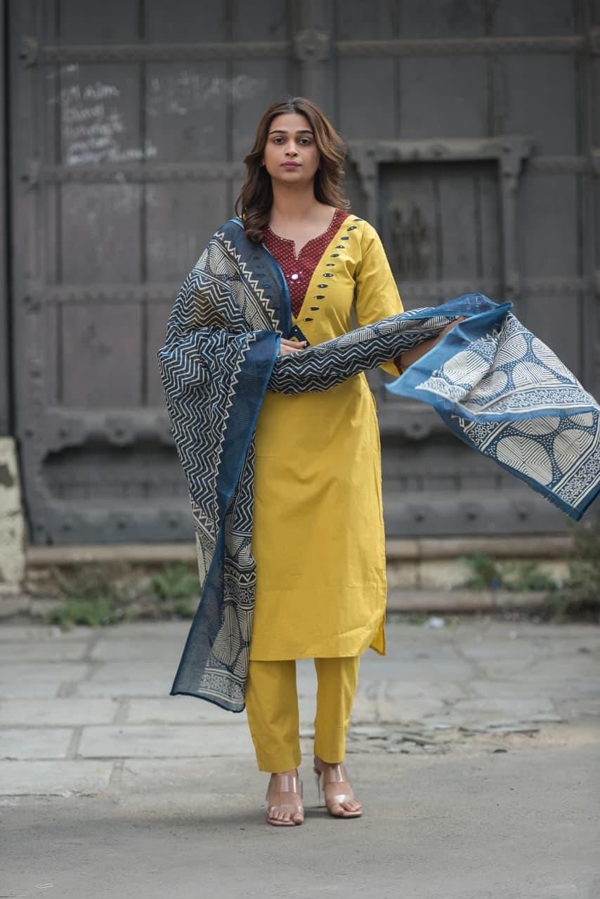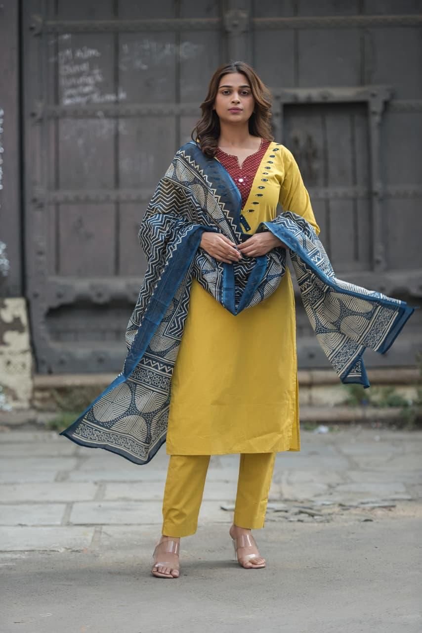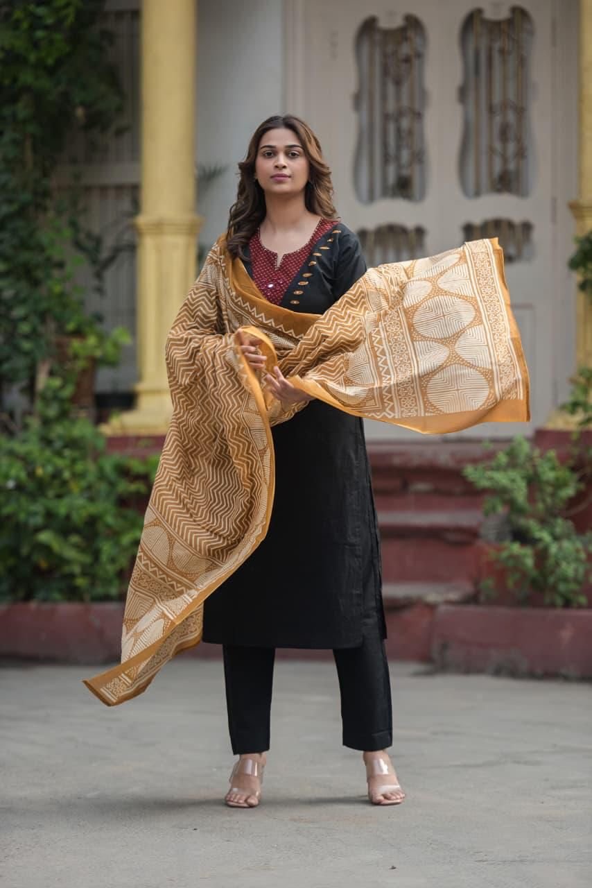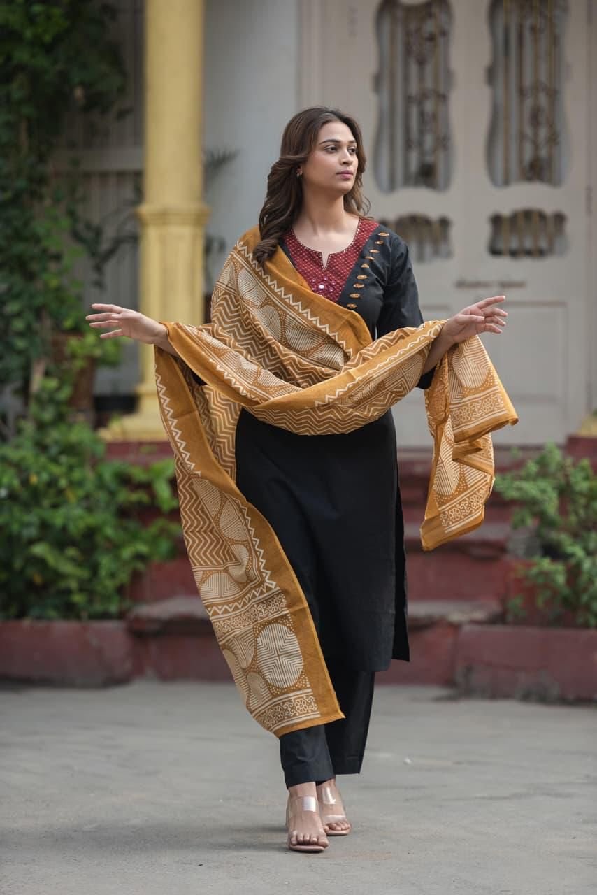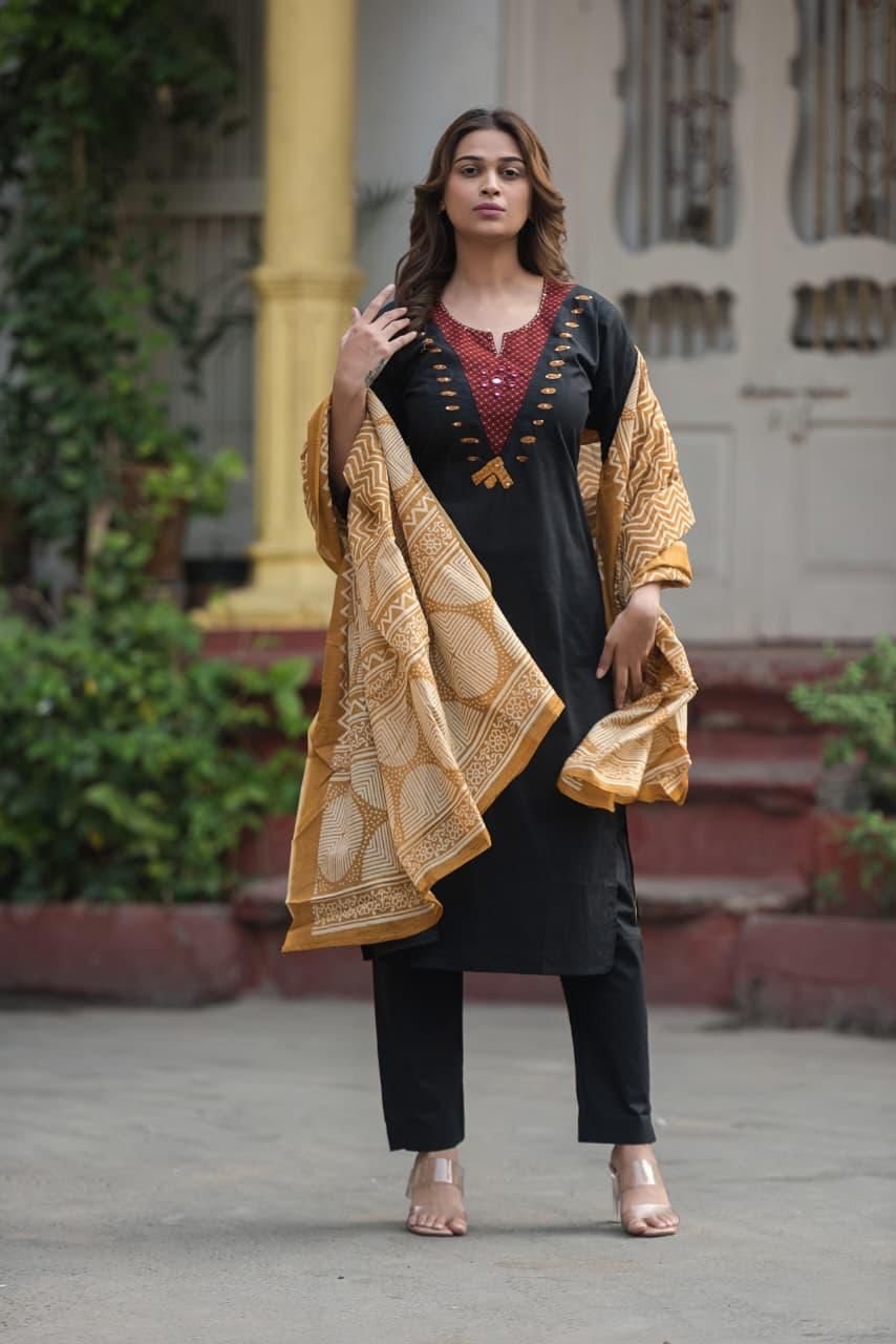 The DU-138 Cotton 3PC Set is a blend of tradition, elegance, and comfort—crafted for women who appreciate detailed artistry in everyday ethnic wear. The kurta is made from 100% pure cotton, making it breathable, skin-friendly, and ideal for all seasons. The highlight of the set is its exquisite applique detailing paired with authentic mirror work, adding a festive radiance without overwhelming the simplicity of the outfit.