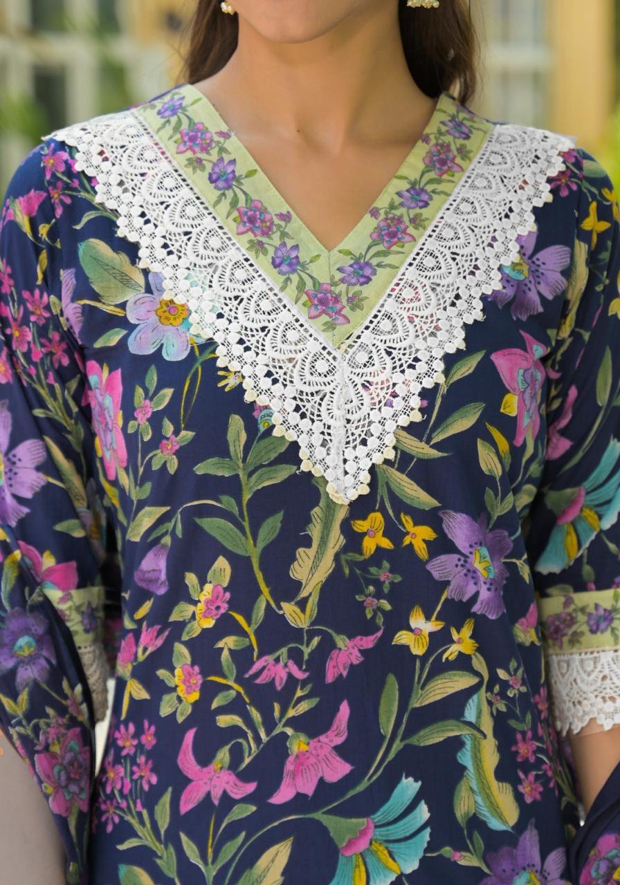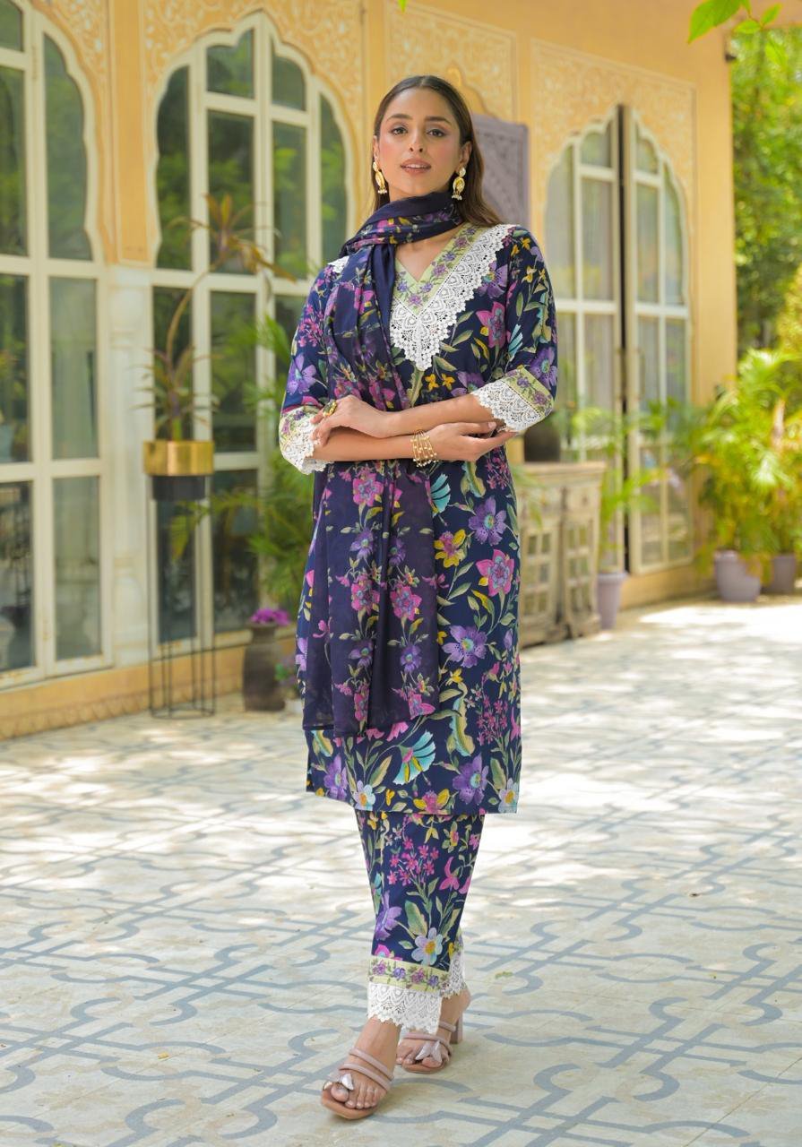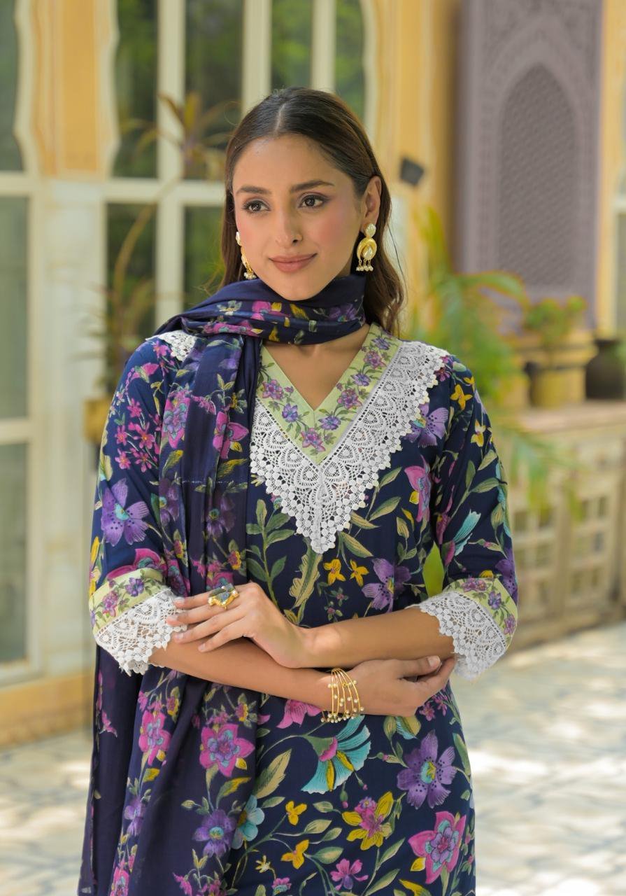 The kurta, dupatta, and bottom come together in perfect harmony—minimal in design, yet elevated through the delicate lace accents that add a feminine flair without overpowering the look. The crochet lace enhances the neckline, sleeves, or hemline subtly, giving the outfit a handcrafted charm.
