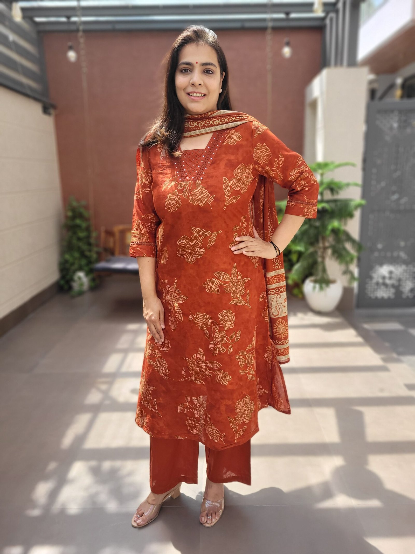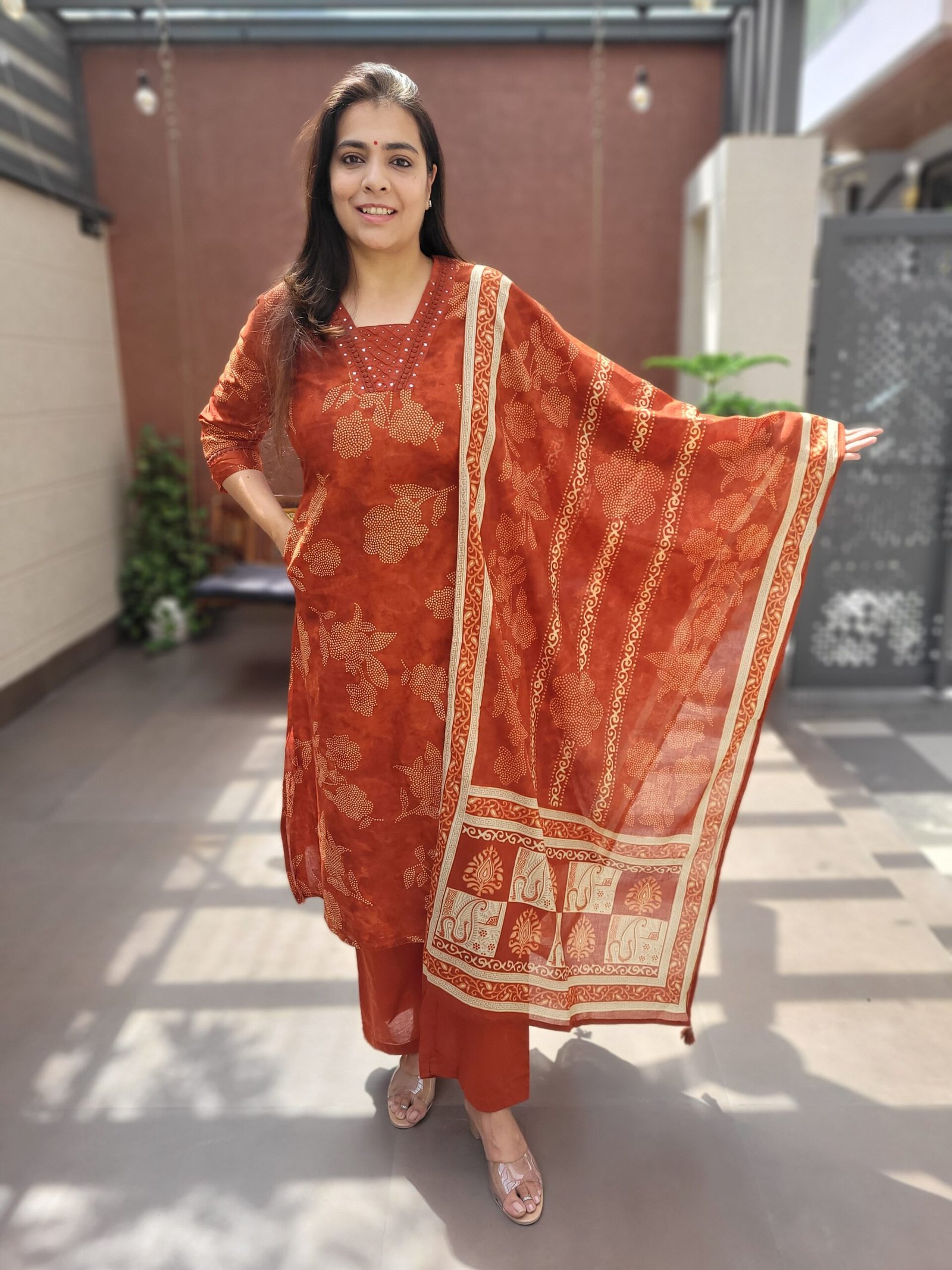 The kurta features embroidery combined with handwork, paired with a full cotton dupatta for a complete ethnic look. Ideal for daily wear, casual outings, and festive occasions.