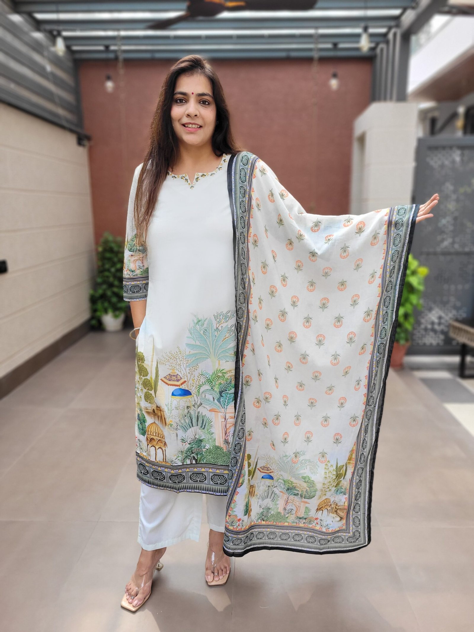 This Cotton 3PC Set combines traditional craftsmanship with modern artistry. Made from premium cotton, it offers comfort and durability, perfect for all-day wear. The graphic printing adds a unique, contemporary touch, while the handwork detailing enhances its elegance.
