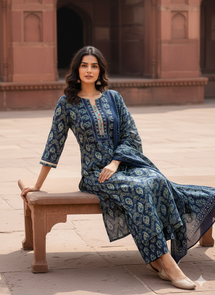 The kurta features a finely embroidered yoke, adding a subtle yet stylish touch to its classic design. The rich Navy Blue shade gives the outfit a premium look, perfect for women who love timeless and graceful ethnic fashion.