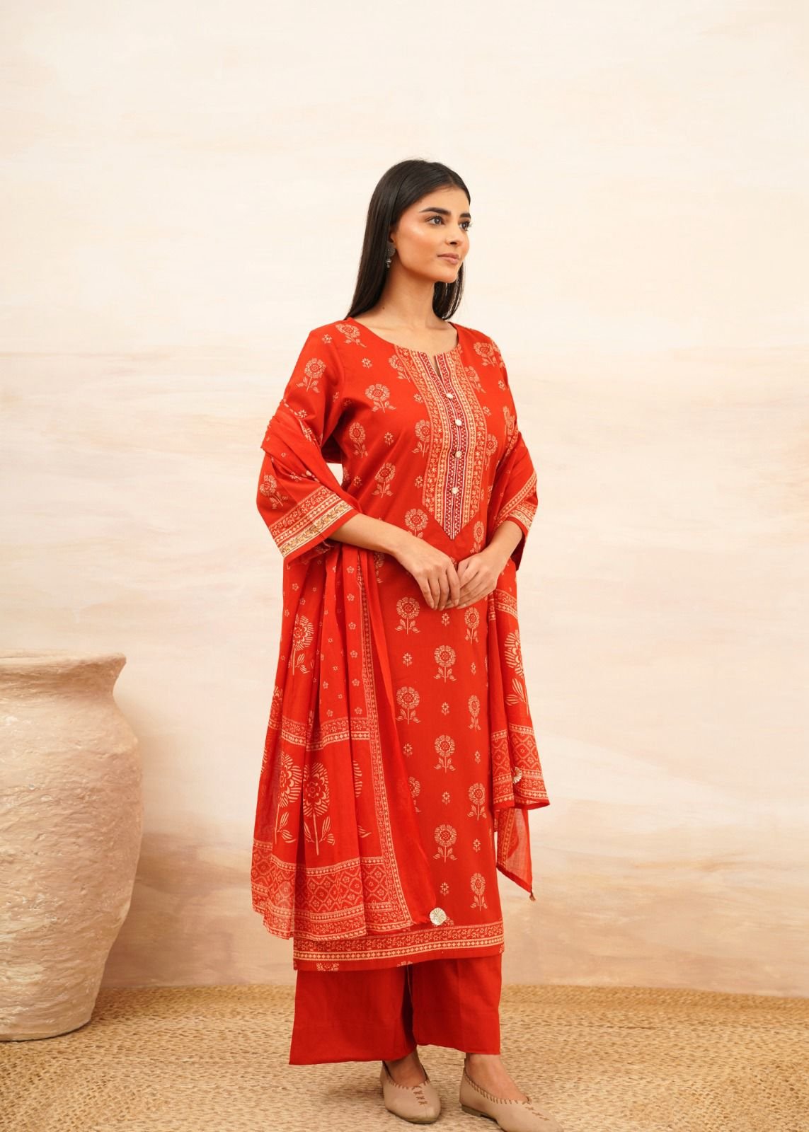 The suit features a delicately embroidered yoke, adding a graceful touch to the minimalist design. Its soothing Rust shade gives it a premium and elegant appeal, suitable for women who prefer subtle yet stylish ethnic fashion.