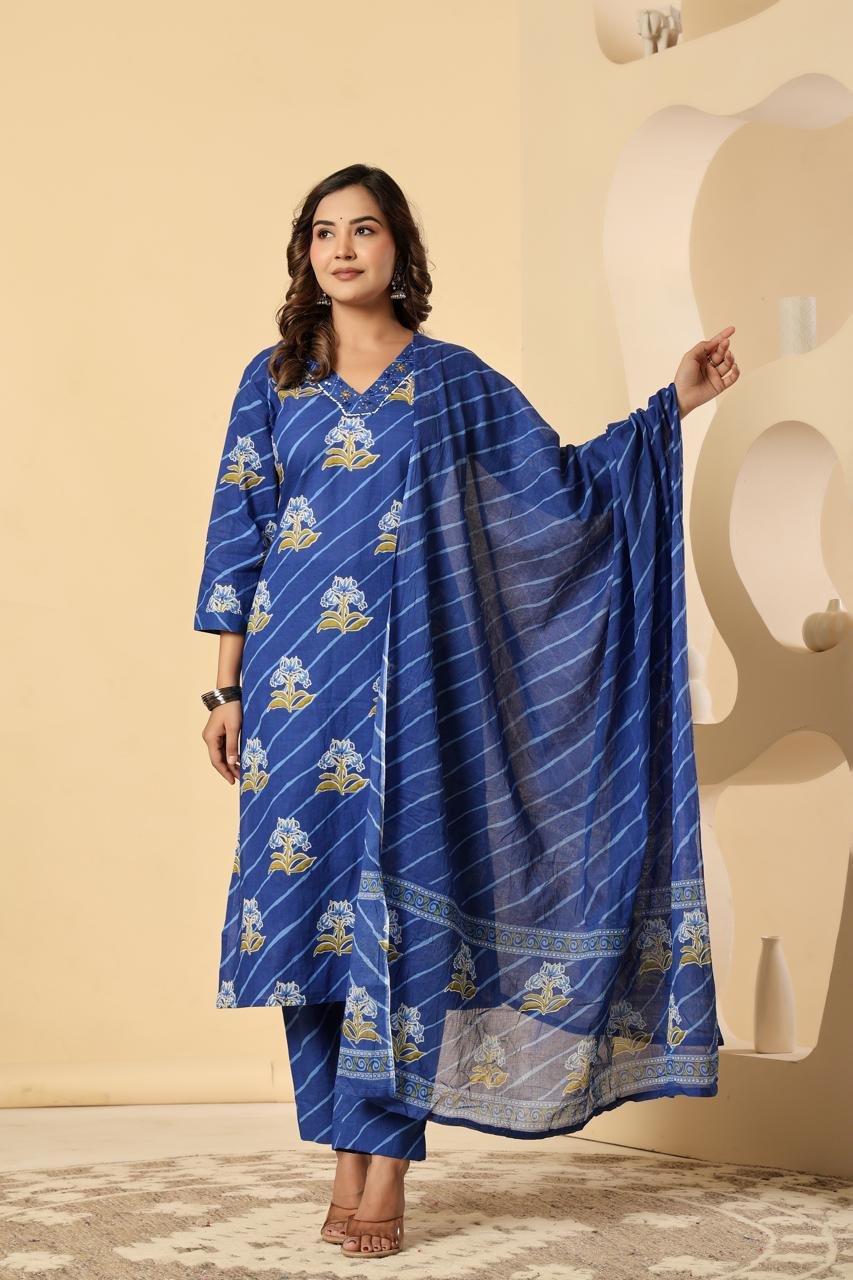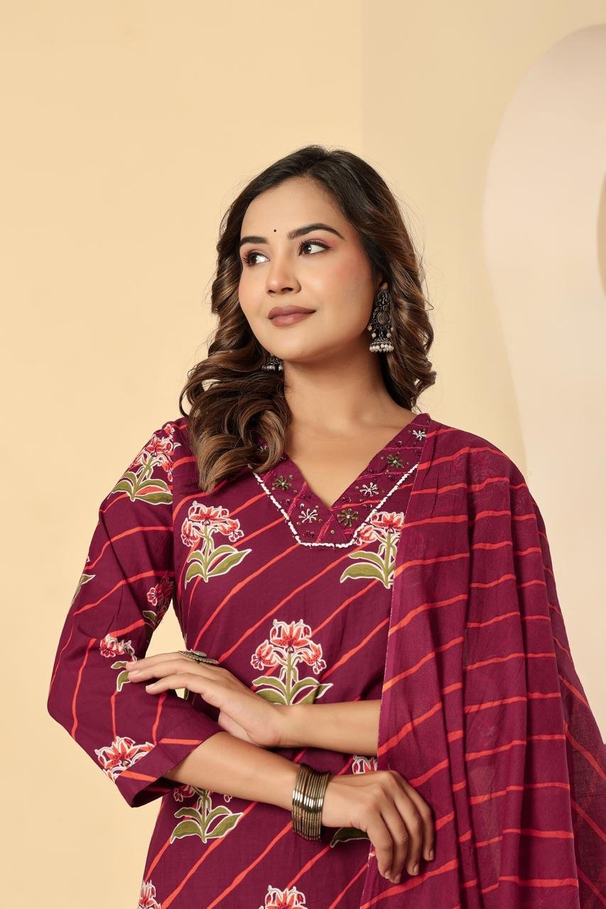 The DU-180 Cotton 3PC Suit Set is crafted from soft, breathable cotton, offering a lightweight and comfortable fit. The kurta features intricate handwork on the yoke combined with vibrant leheriya and floral prints, paired with a full cotton dupatta and matching bottom for a complete, elegant ensemble. Ideal for casual outings, festive gatherings, and semi-formal occasions, this 3-piece set perfectly balances traditional craftsmanship with contemporary style.