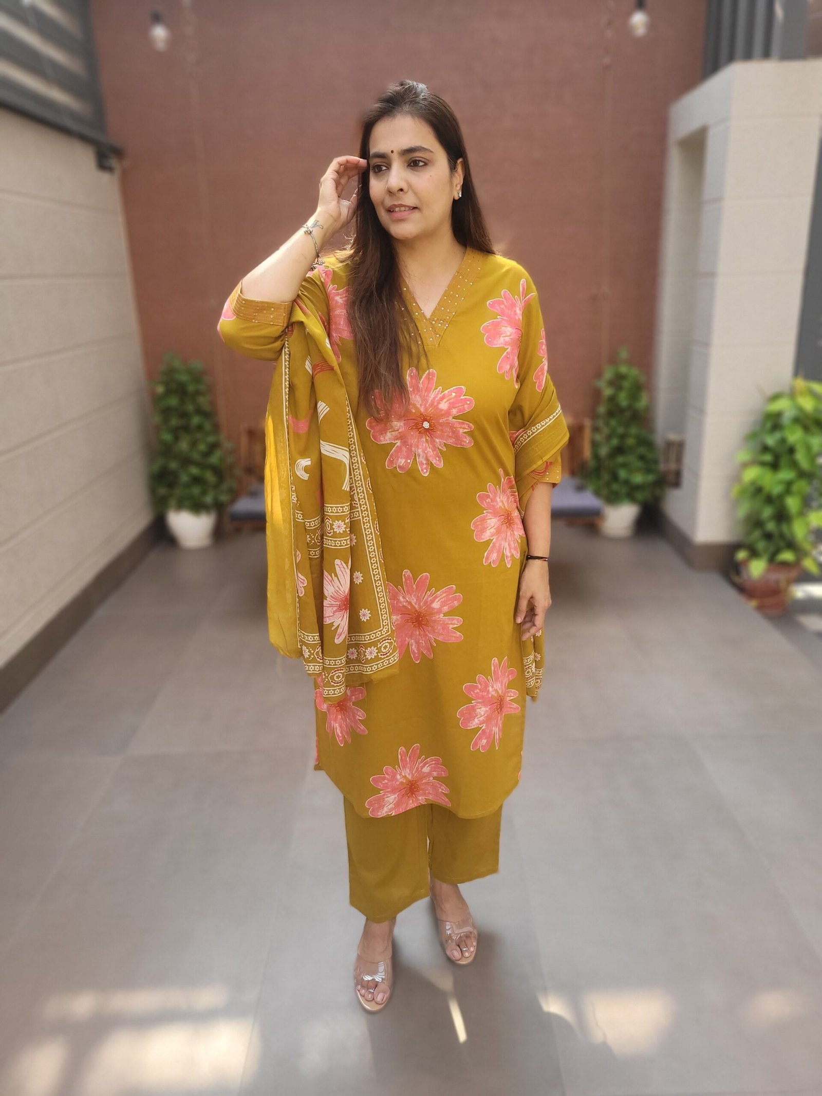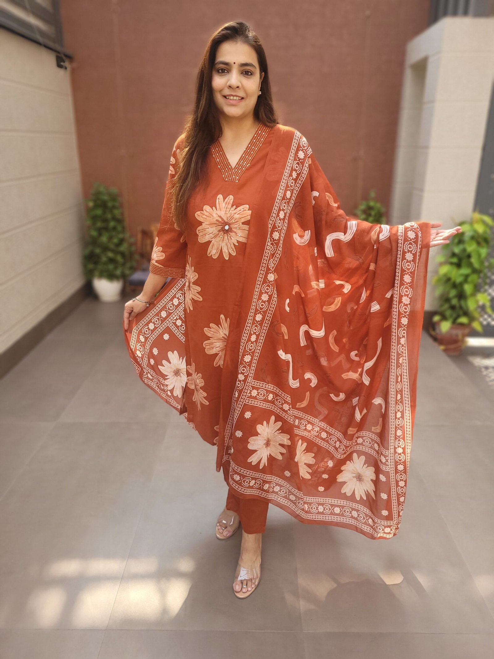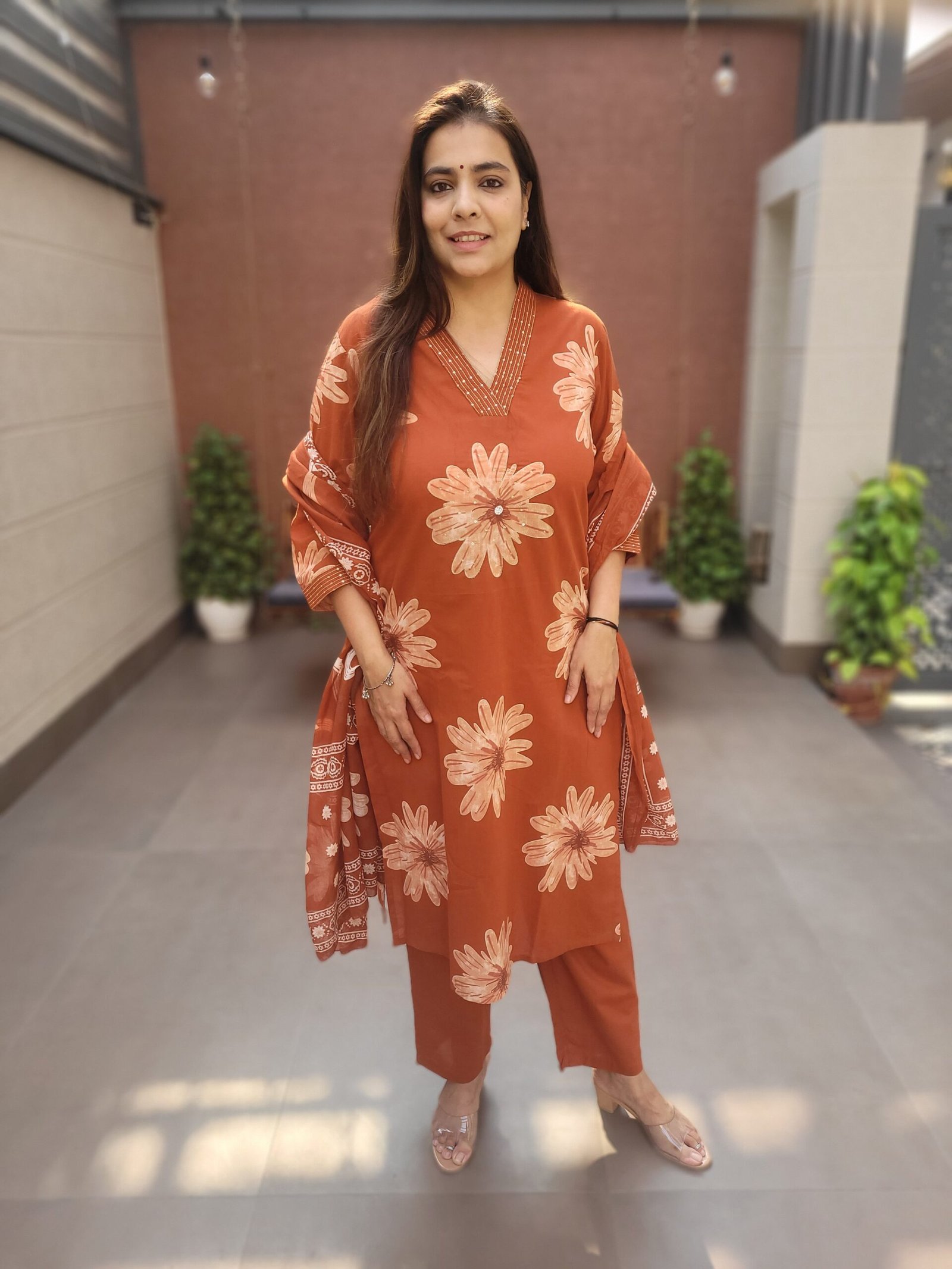 Available in two elegant shades — Mehandi, offering an earthy and traditional vibe, and Rust, bringing a bold and festive appeal — this outfit is ideal for day events, cultural gatherings, and evening celebrations.