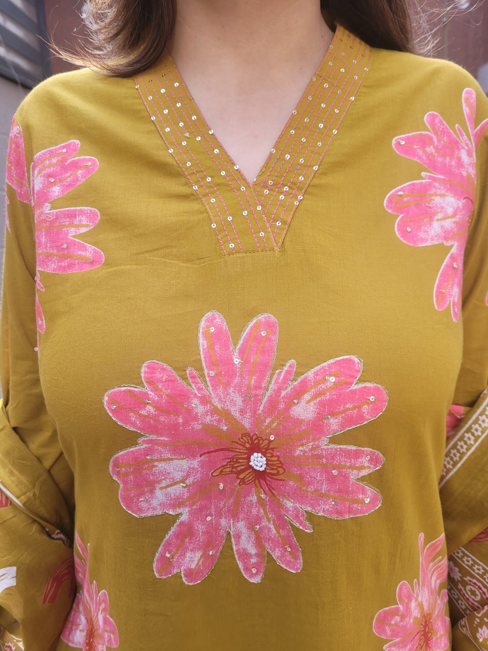 Delicately adorned with thread embroidery and sequins detailing, this suit set carries a subtle shimmer that adds charm without being too flashy. It comes with a full-size cotton dupatta, perfectly complementing the kurta and bottom for a complete ethnic look.