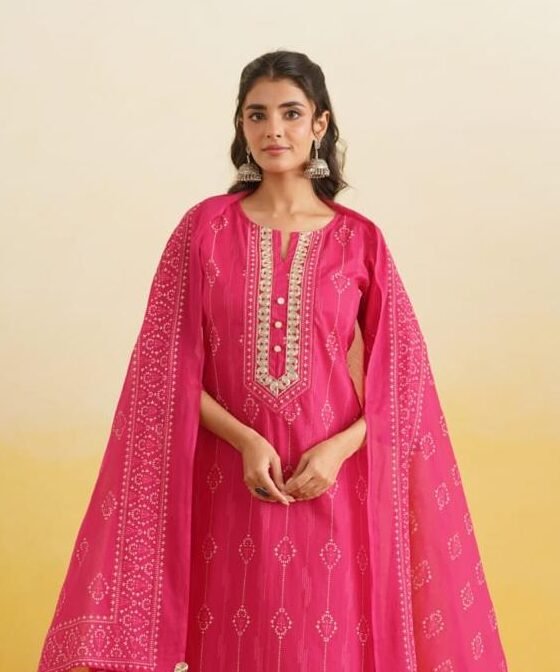 The DU-612 Cotton Suit Set is crafted from soft, breathable cotton, offering lightweight comfort and a natural feel. The kurta features an intricately zari-embroidered yoke, paired with a coordinated bottom and dupatta for a complete and elegant ensemble.