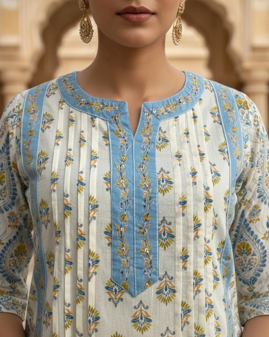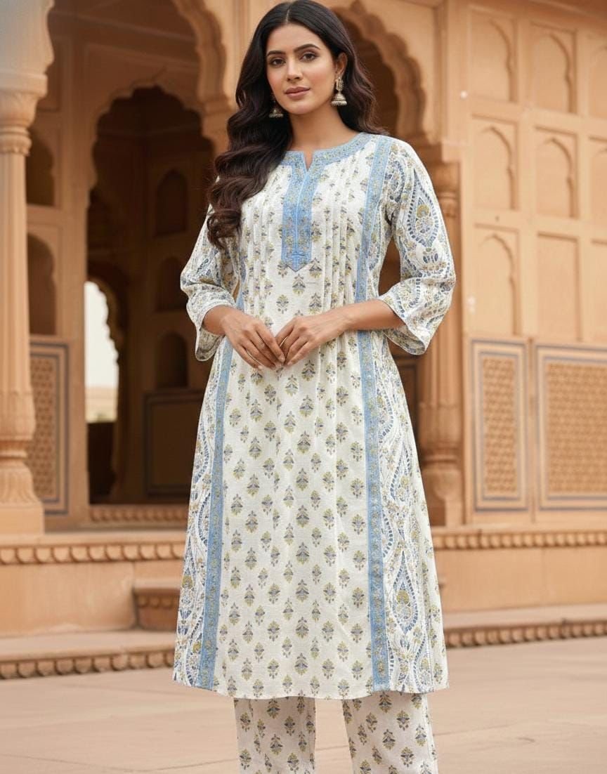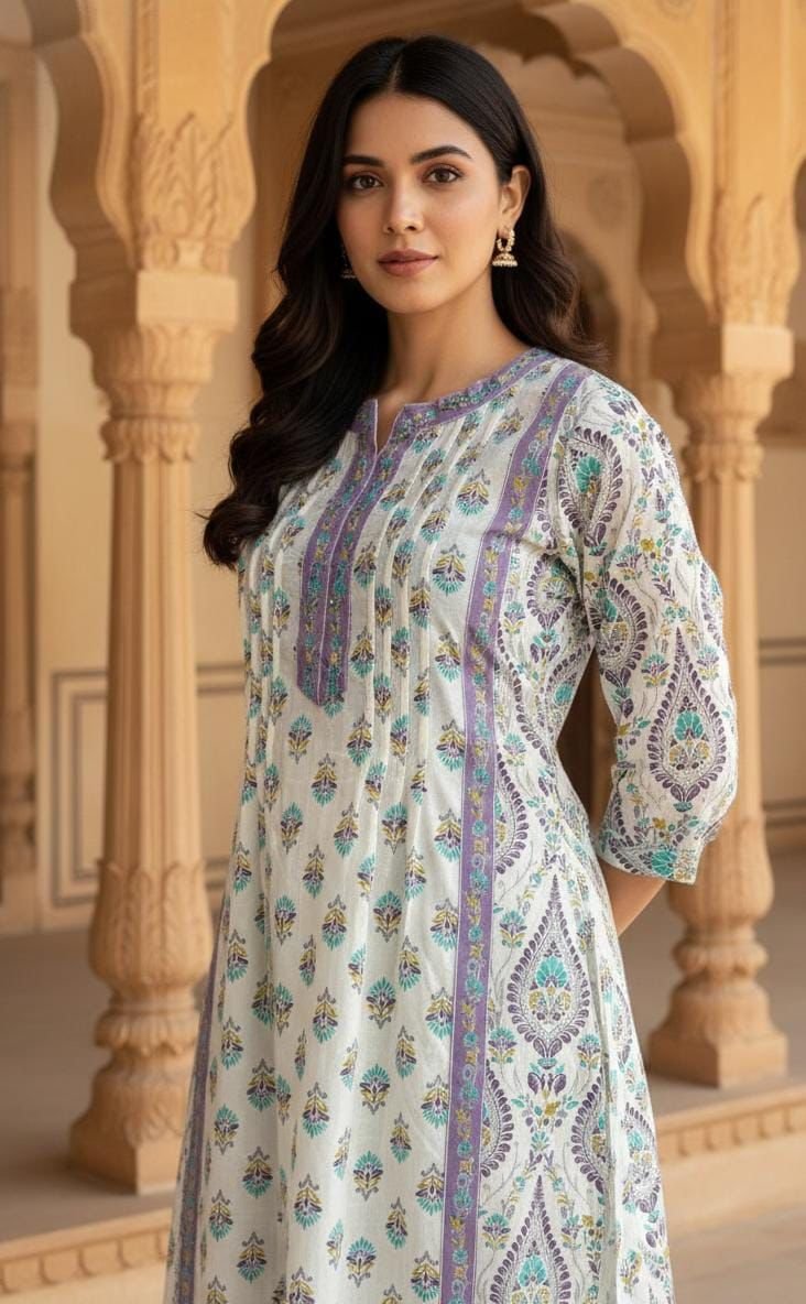The kurta features beautiful pintucks detailing, giving the outfit a structured and stylish appearance. The A-line cut creates a flattering silhouette, while the double pockets add functionality.